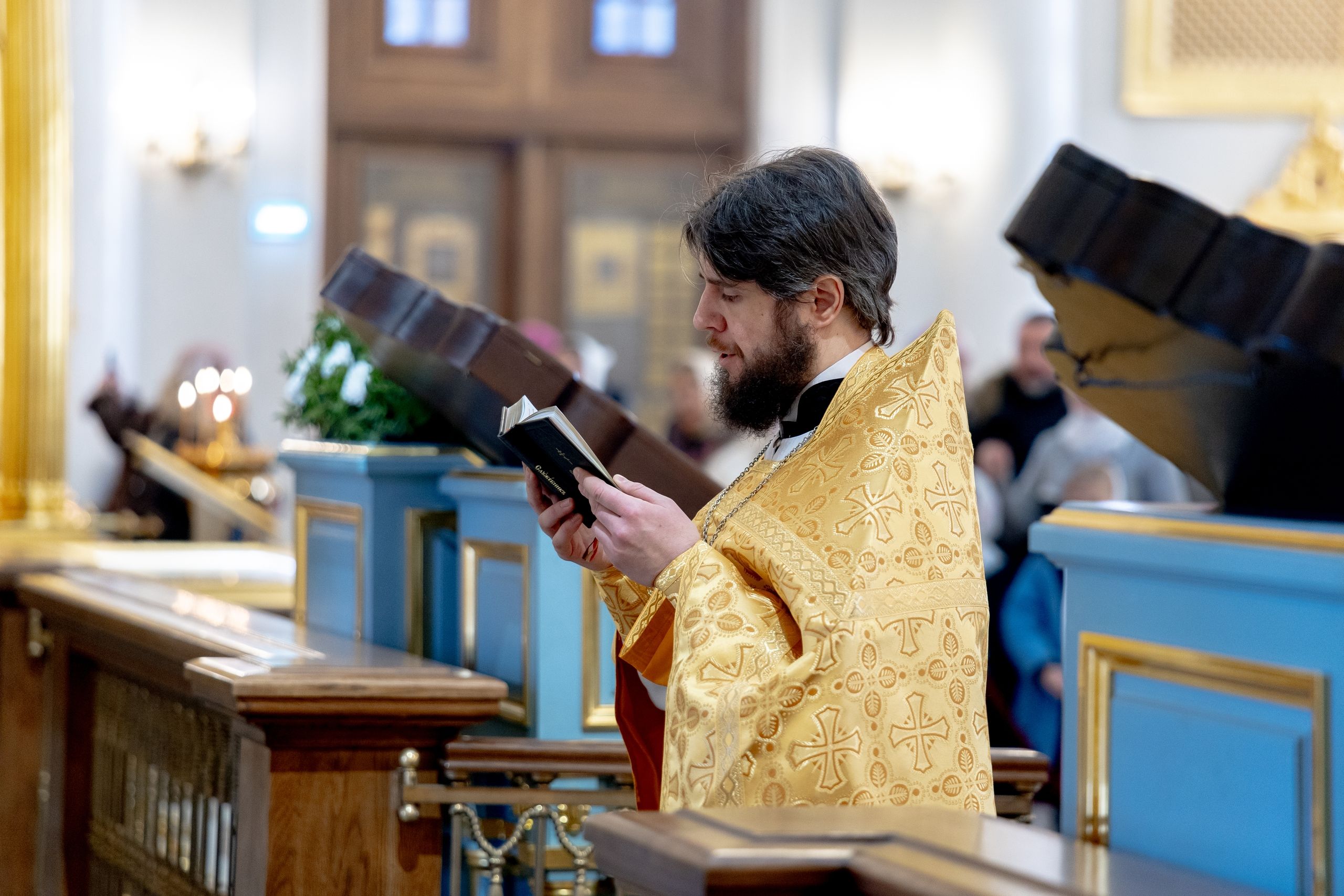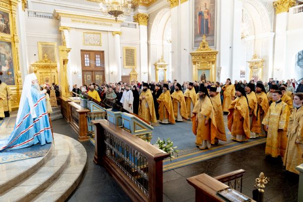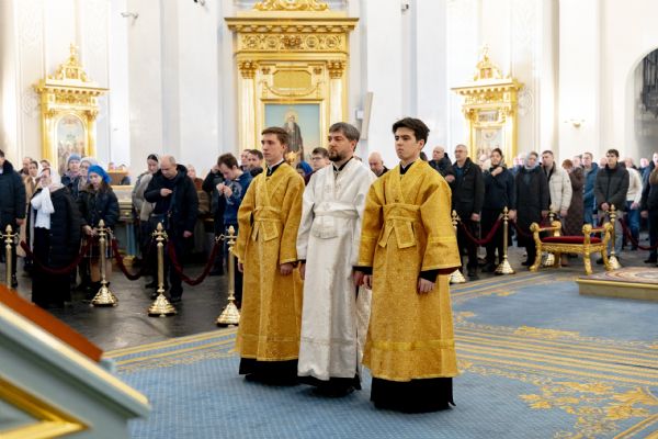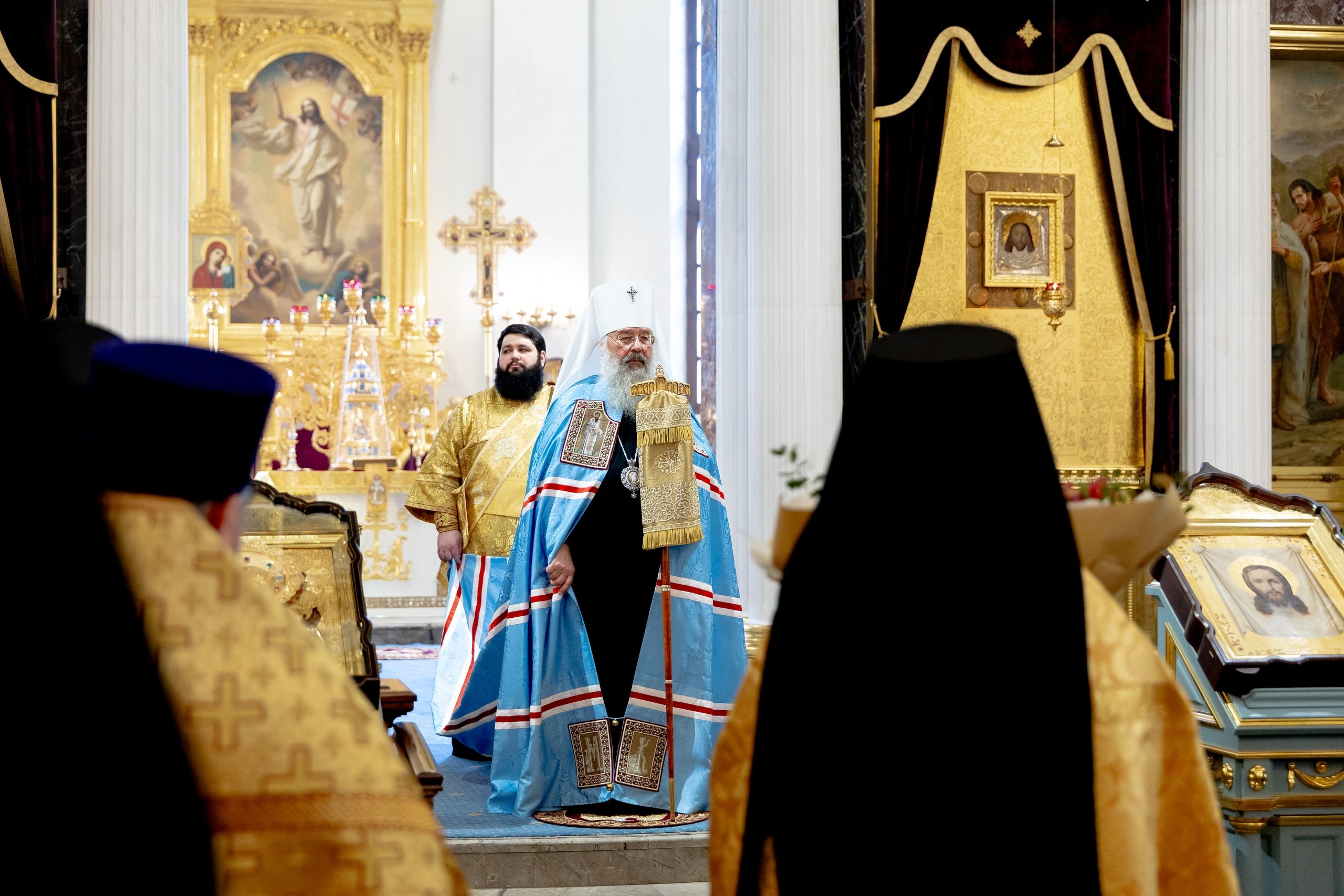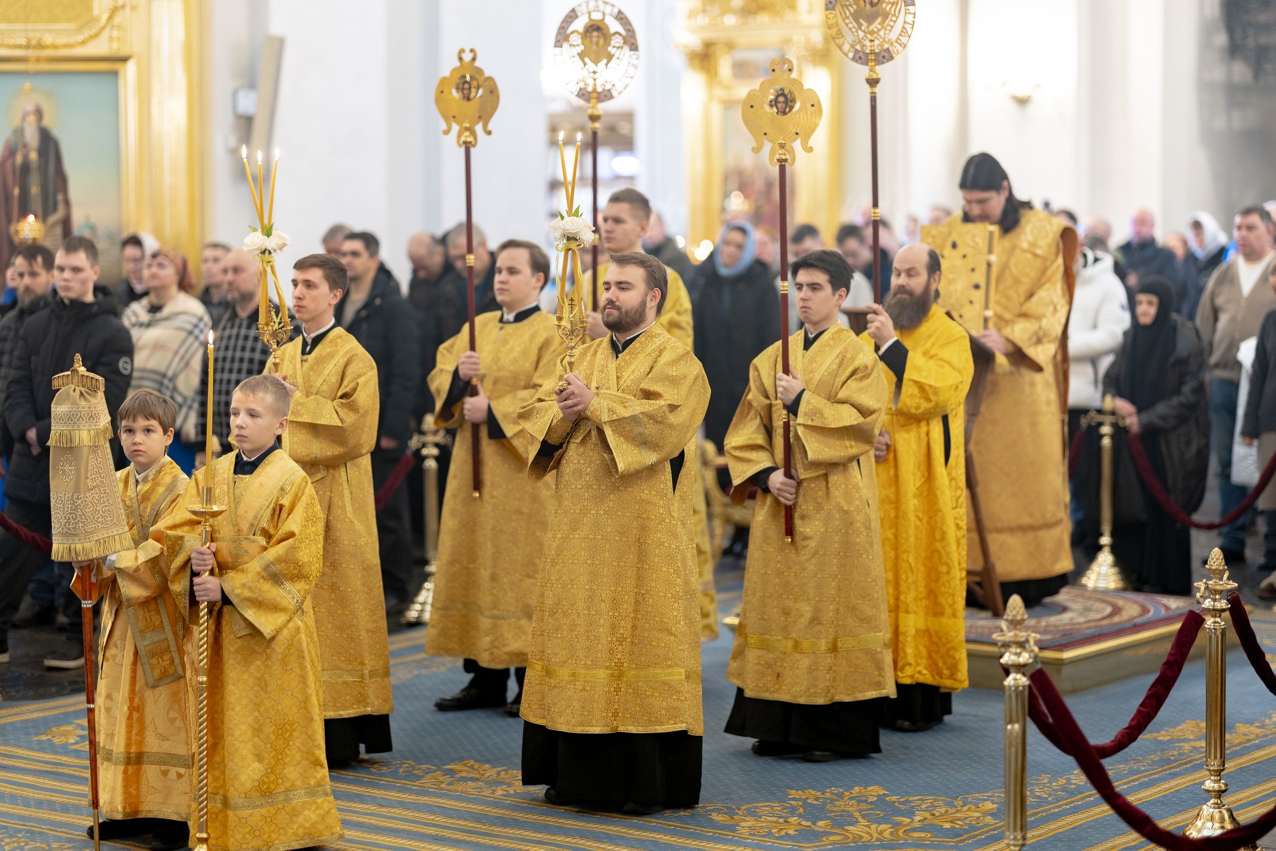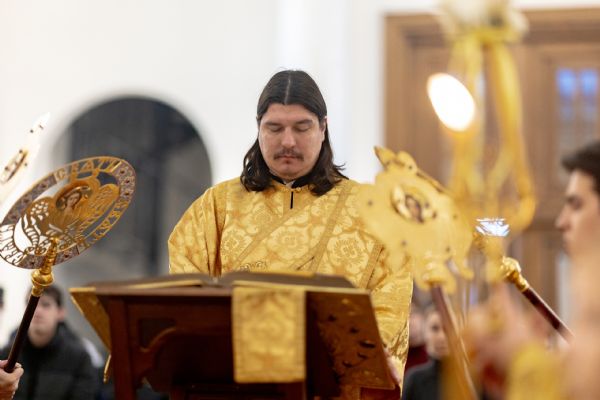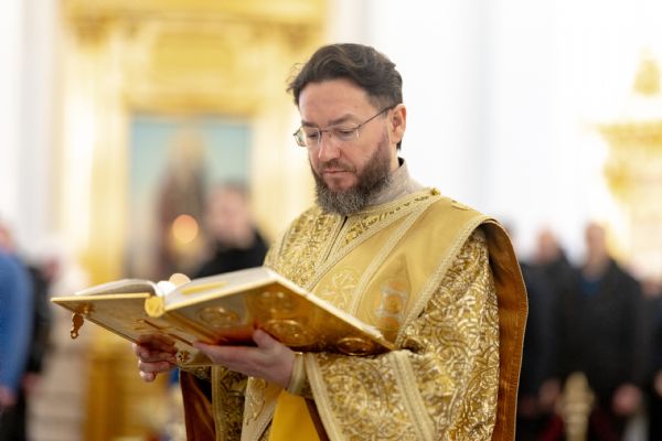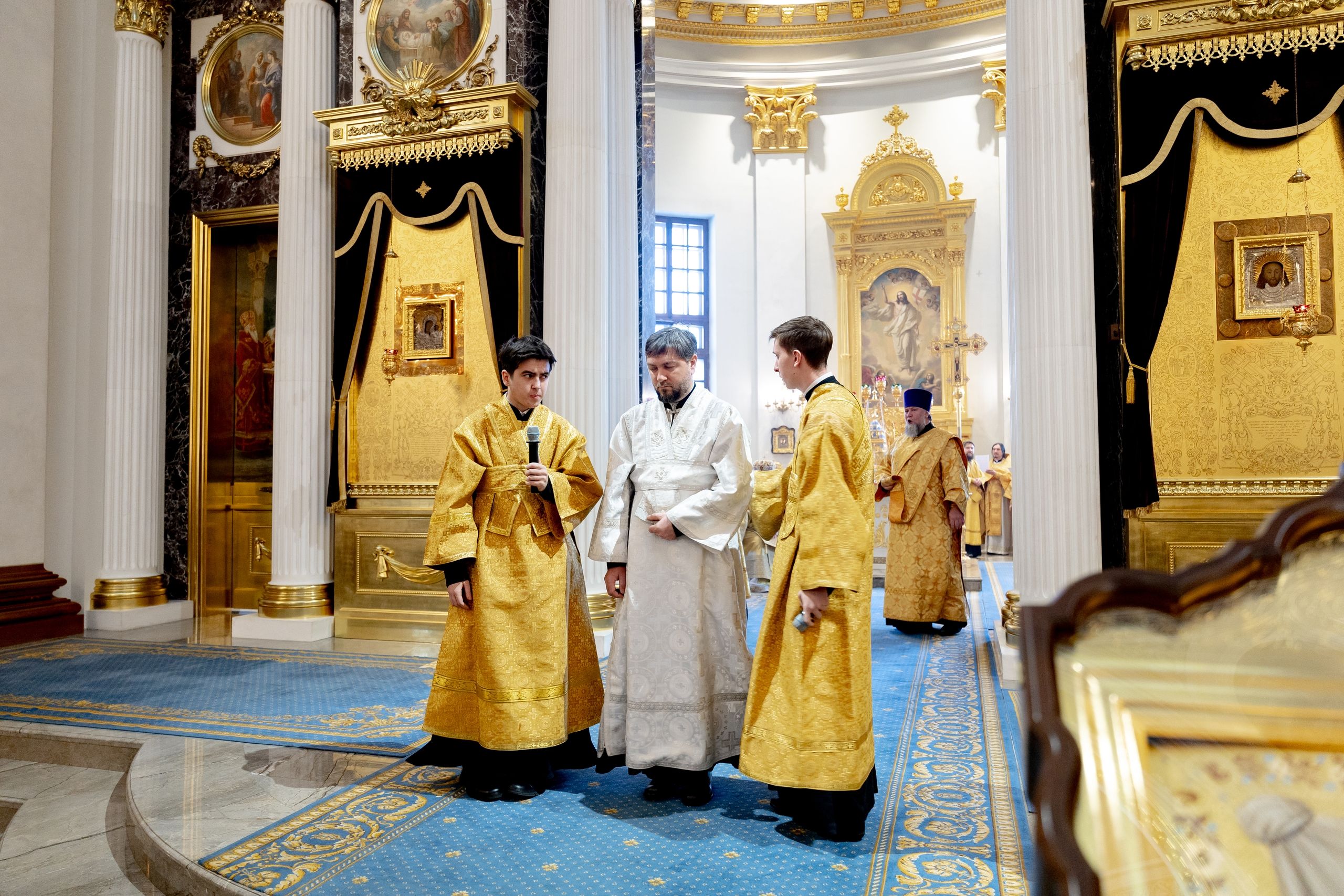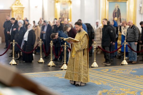 На мирной и сугубой ектениях были вознесены молитвы о Российском воинстве и о мире. Митрополит Кирилл совершил диаконскую хиротонию иподиакона Максима Никонова. По запричастном стихе проповедь произнёс иеромонах Гермоген (Рубан).
