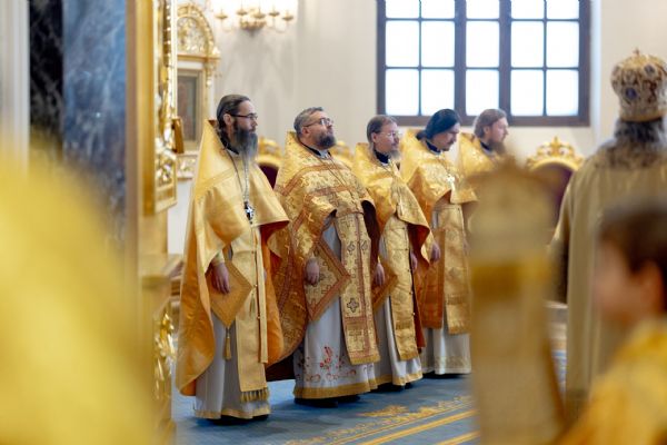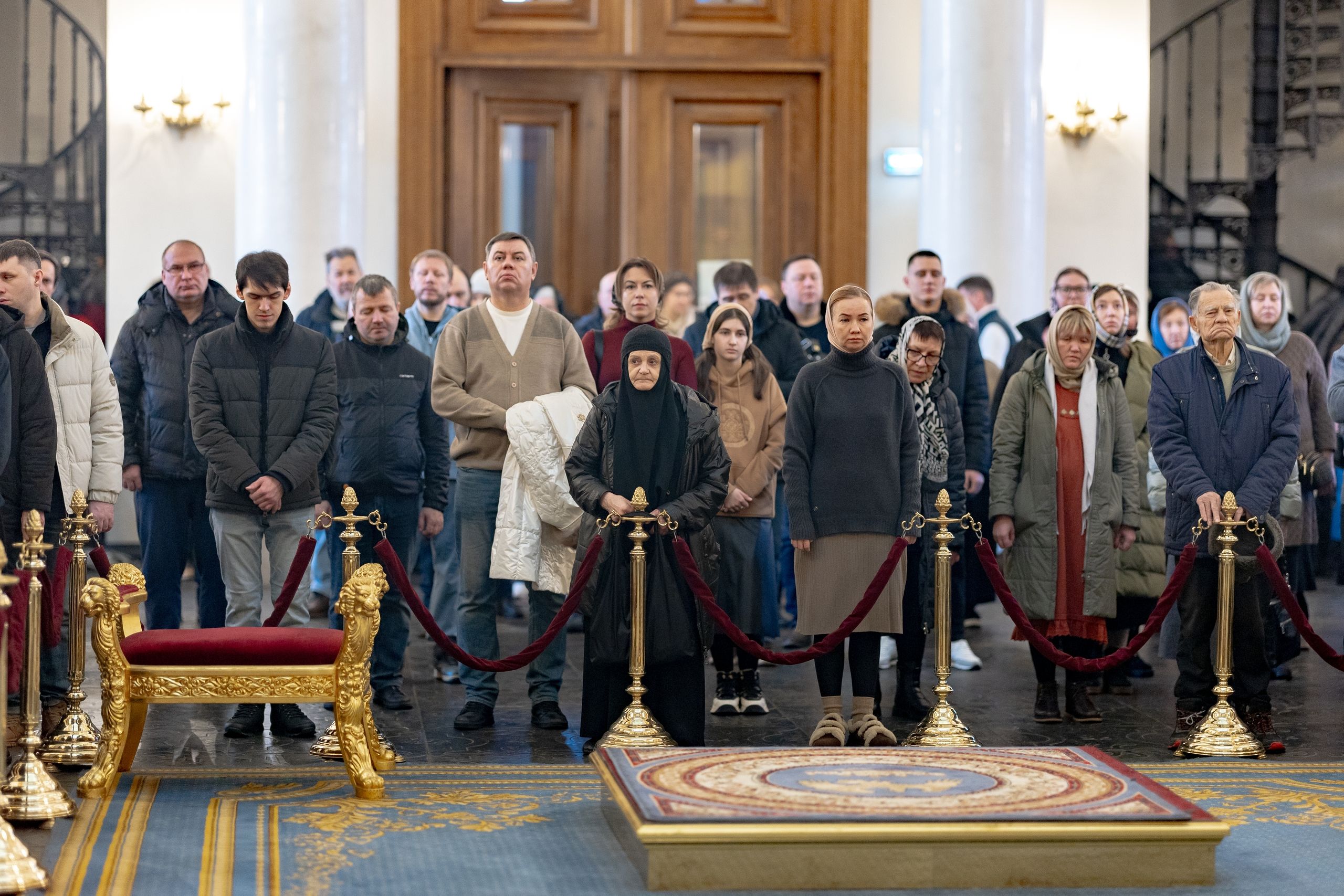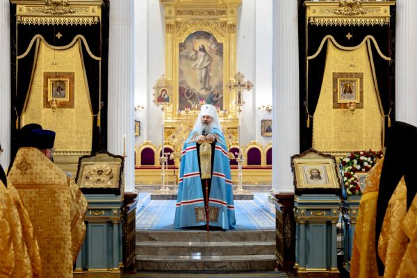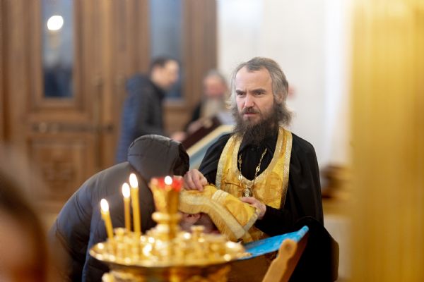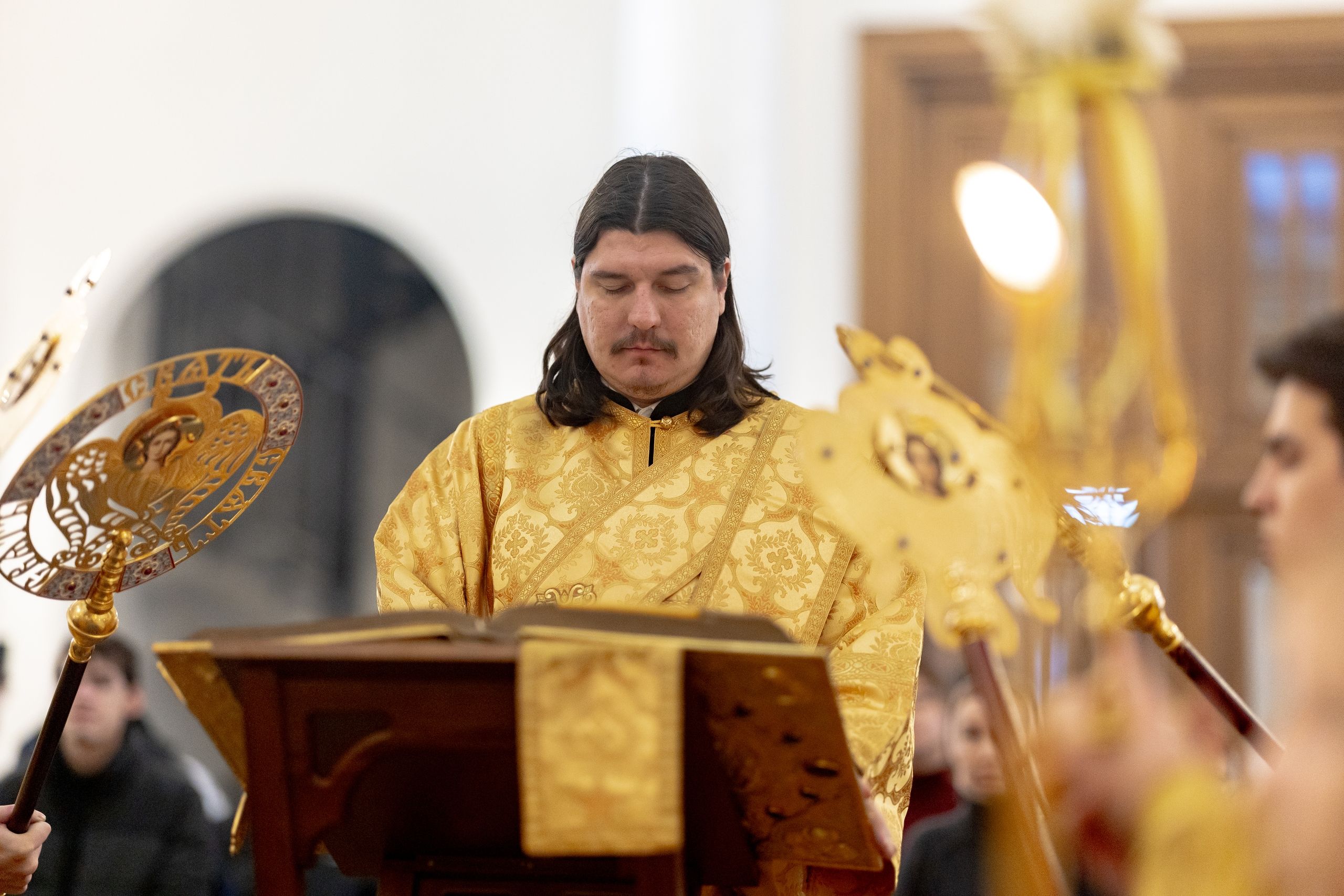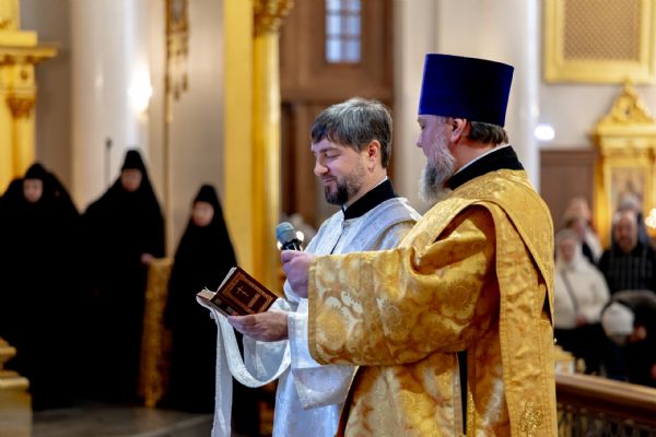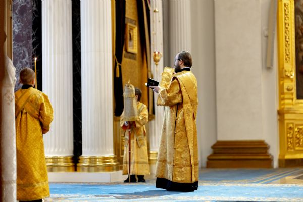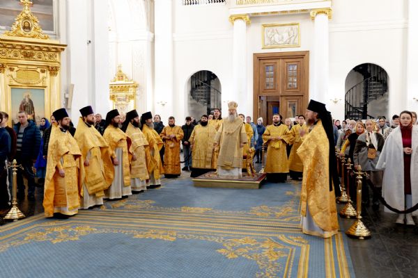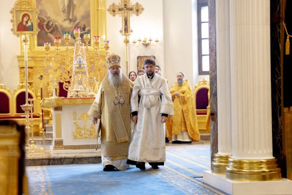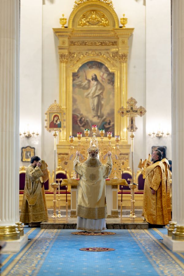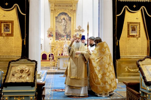 На мирной и сугубой ектениях были вознесены молитвы о Российском воинстве и о мире. Митрополит Кирилл совершил диаконскую хиротонию иподиакона Максима Никонова. По запричастном стихе проповедь произнёс иеромонах Гермоген (Рубан).