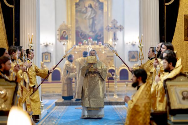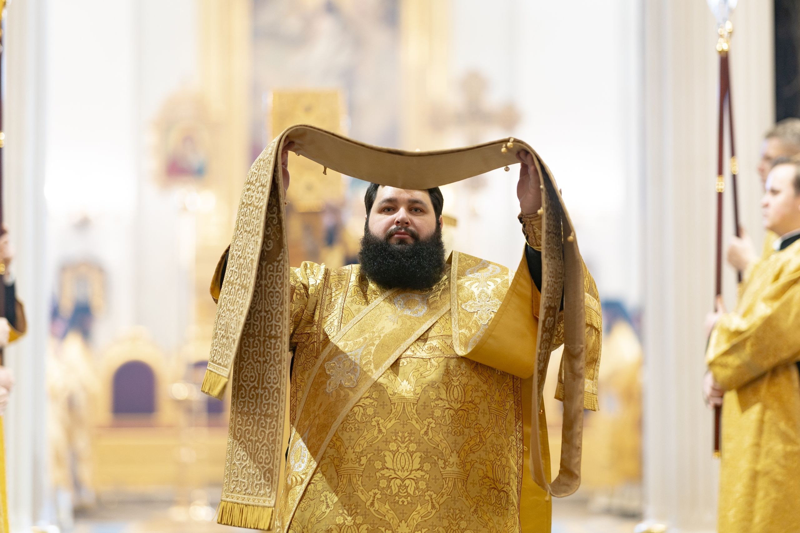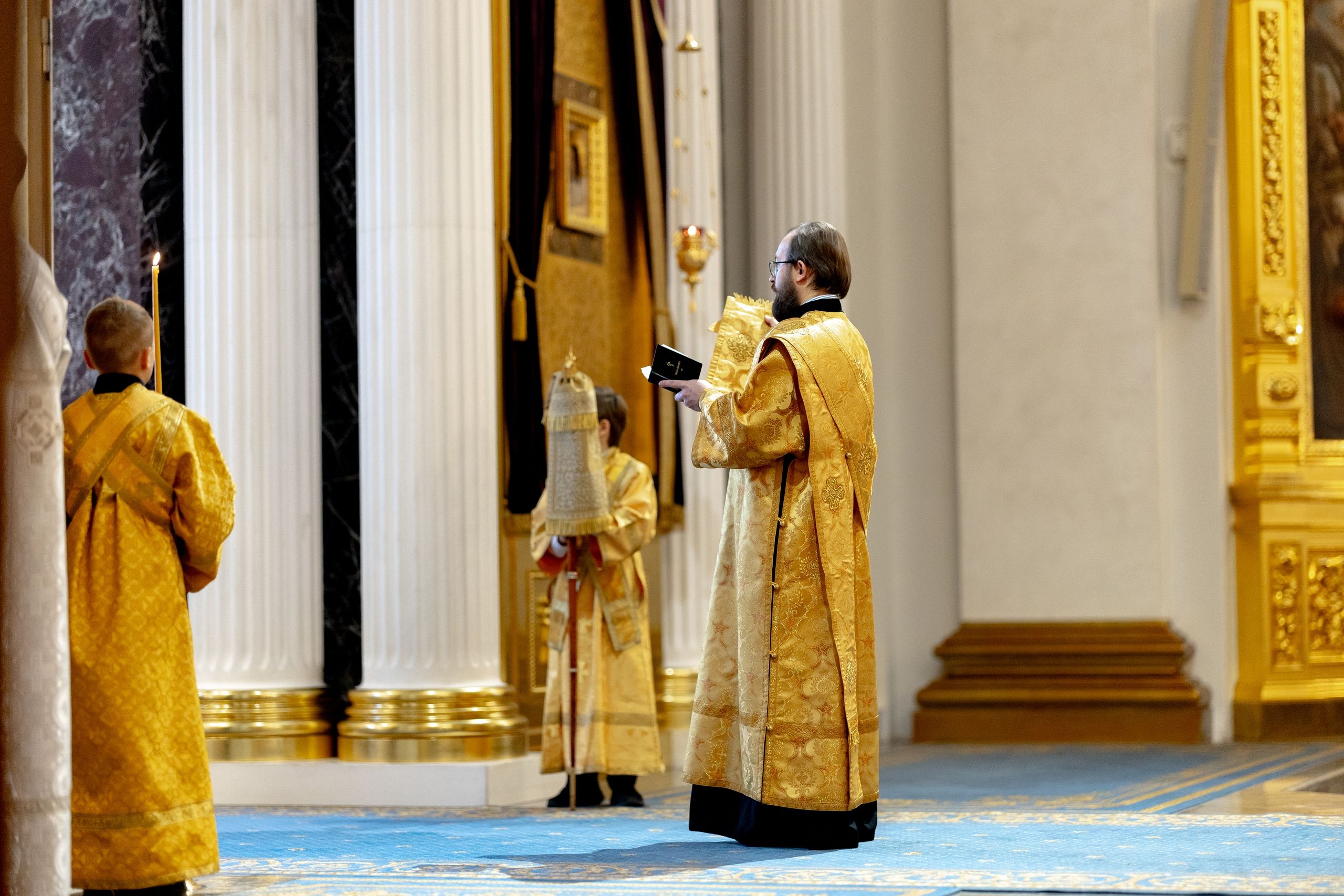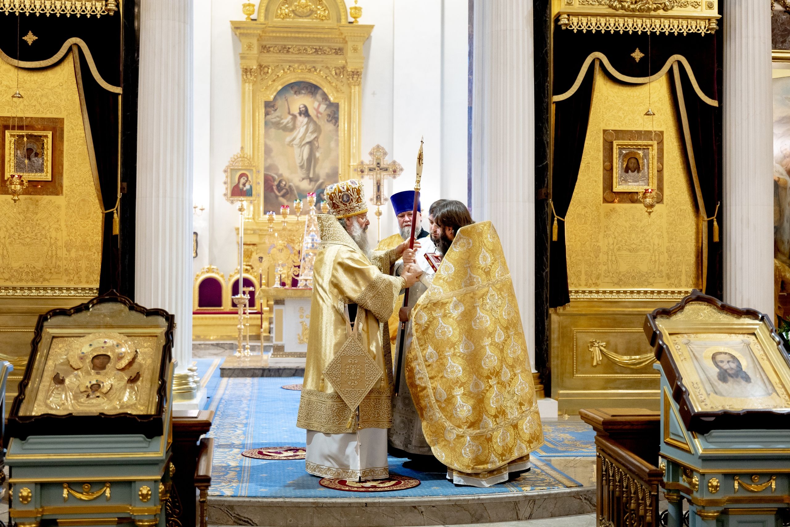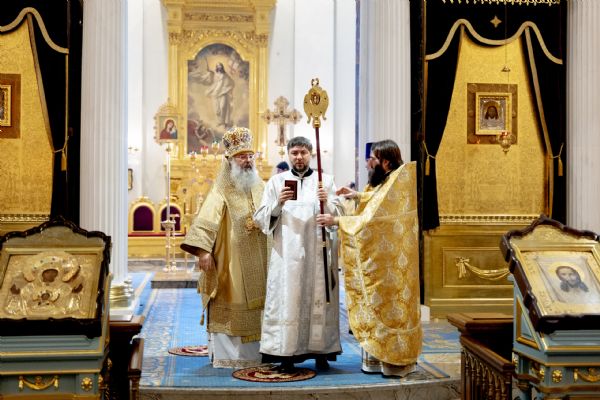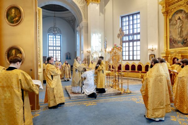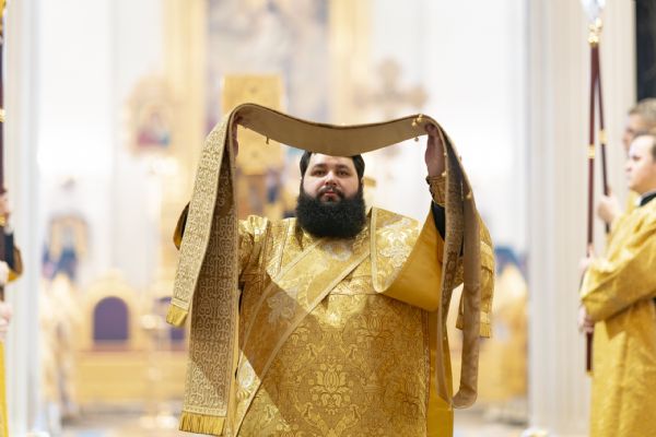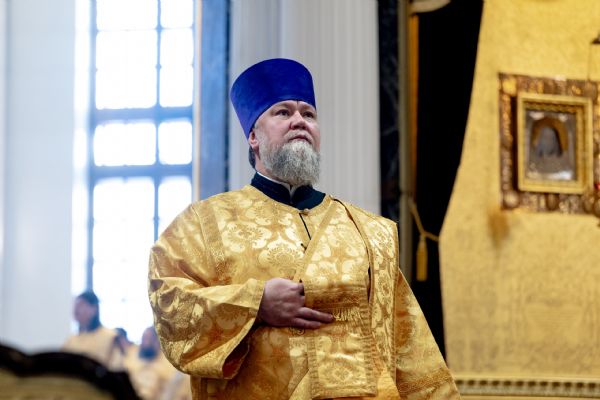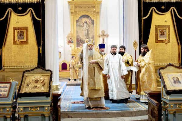 На мирной и сугубой ектениях были вознесены молитвы о Российском воинстве и о мире. Митрополит Кирилл совершил диаконскую хиротонию иподиакона Максима Никонова. По запричастном стихе проповедь произнёс иеромонах Гермоген (Рубан).