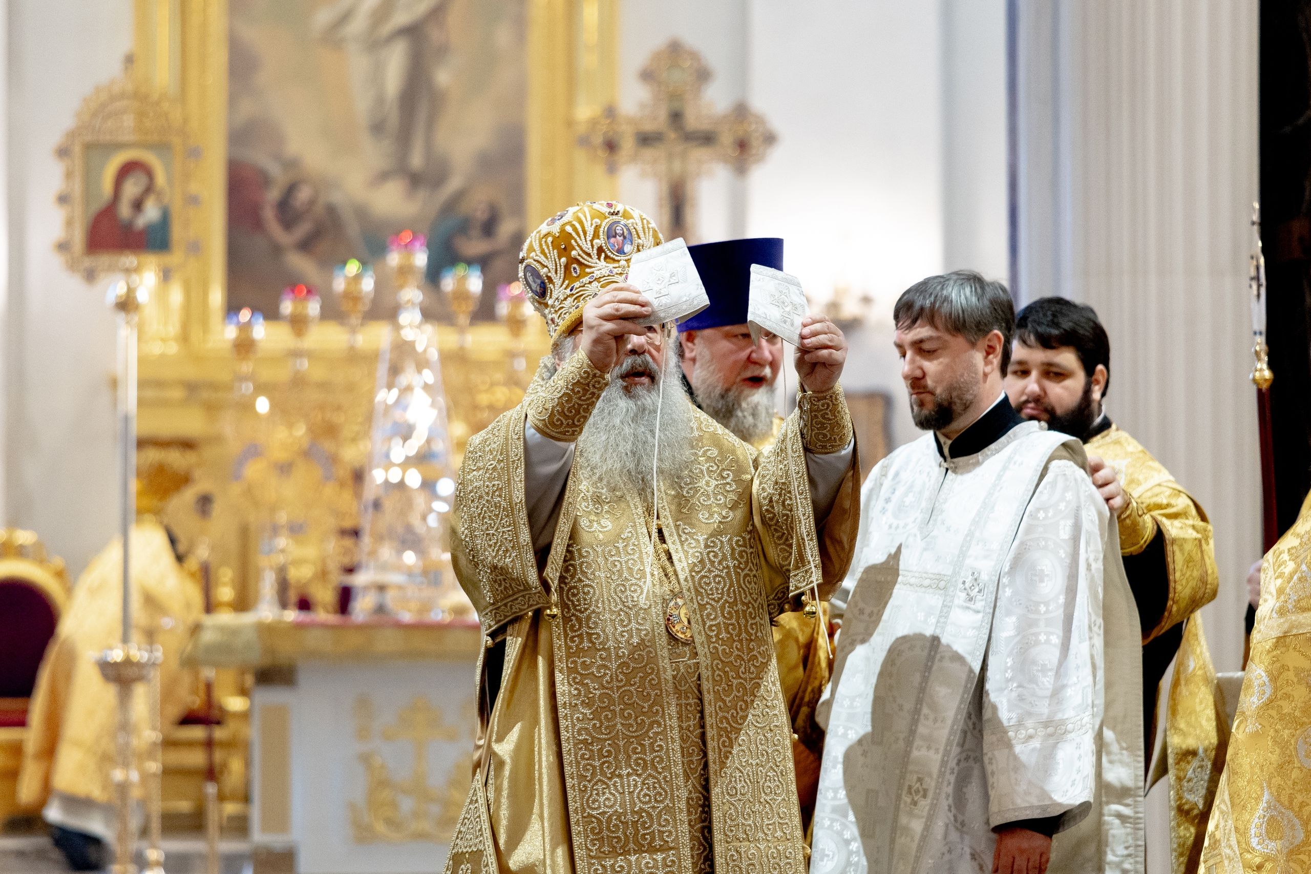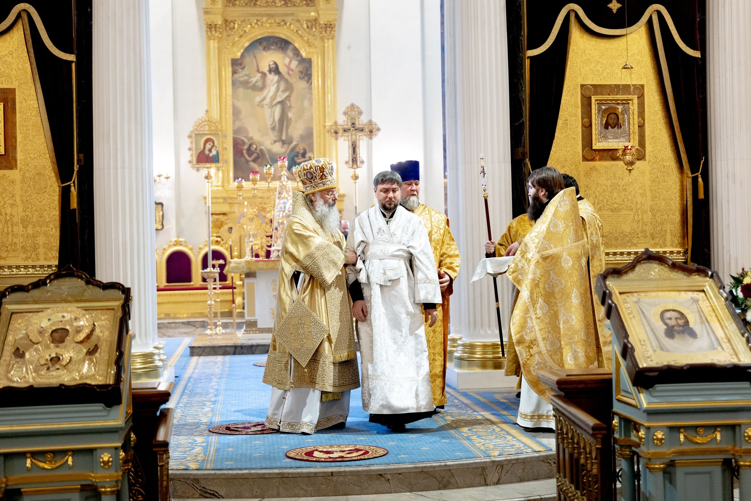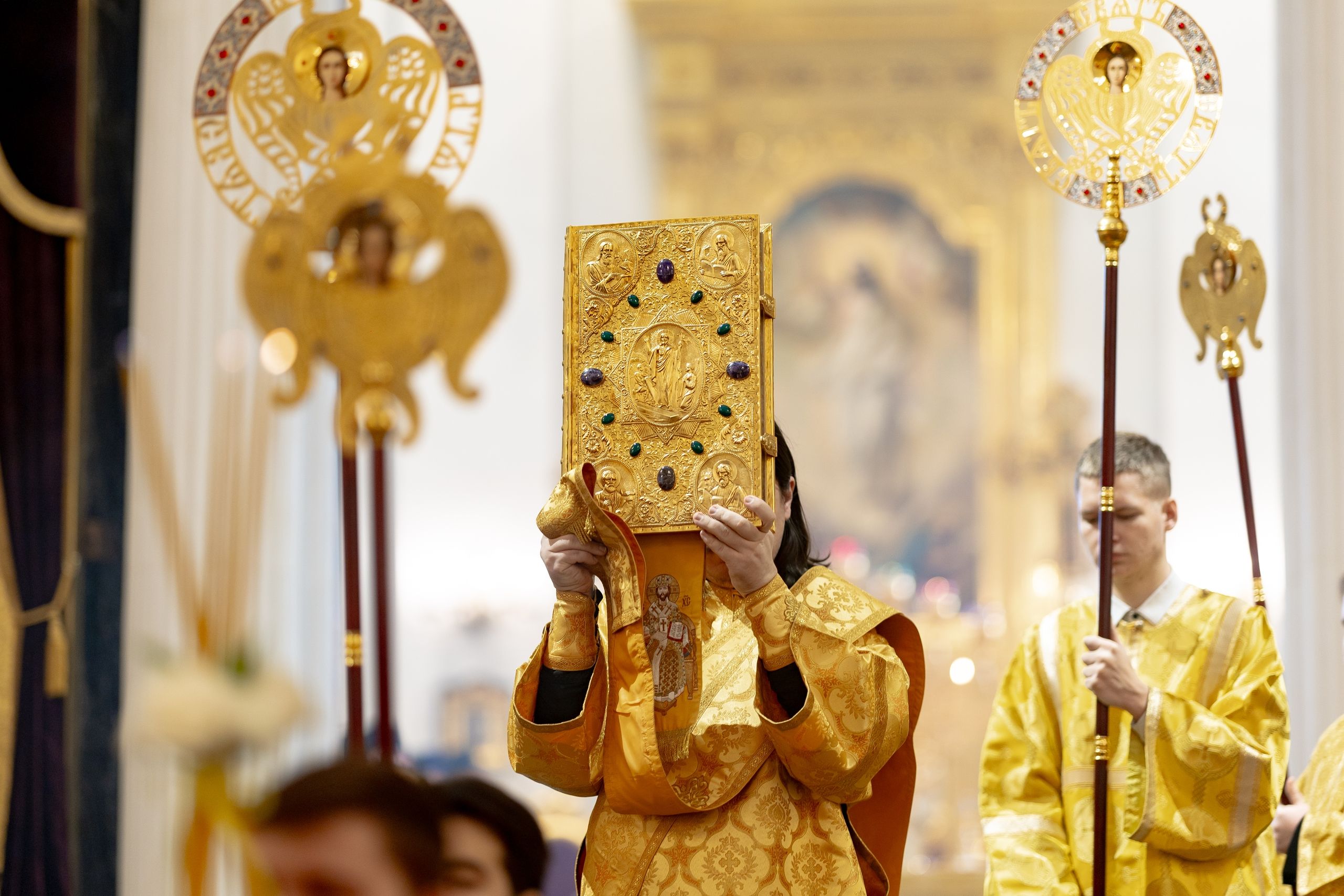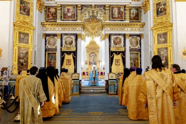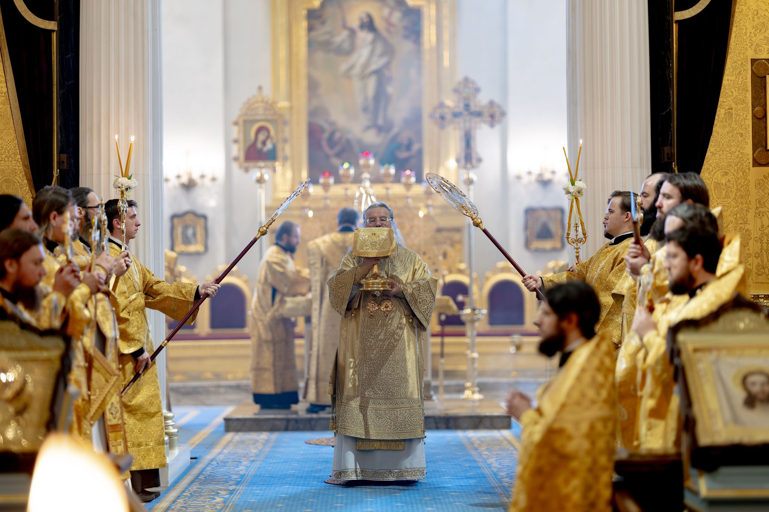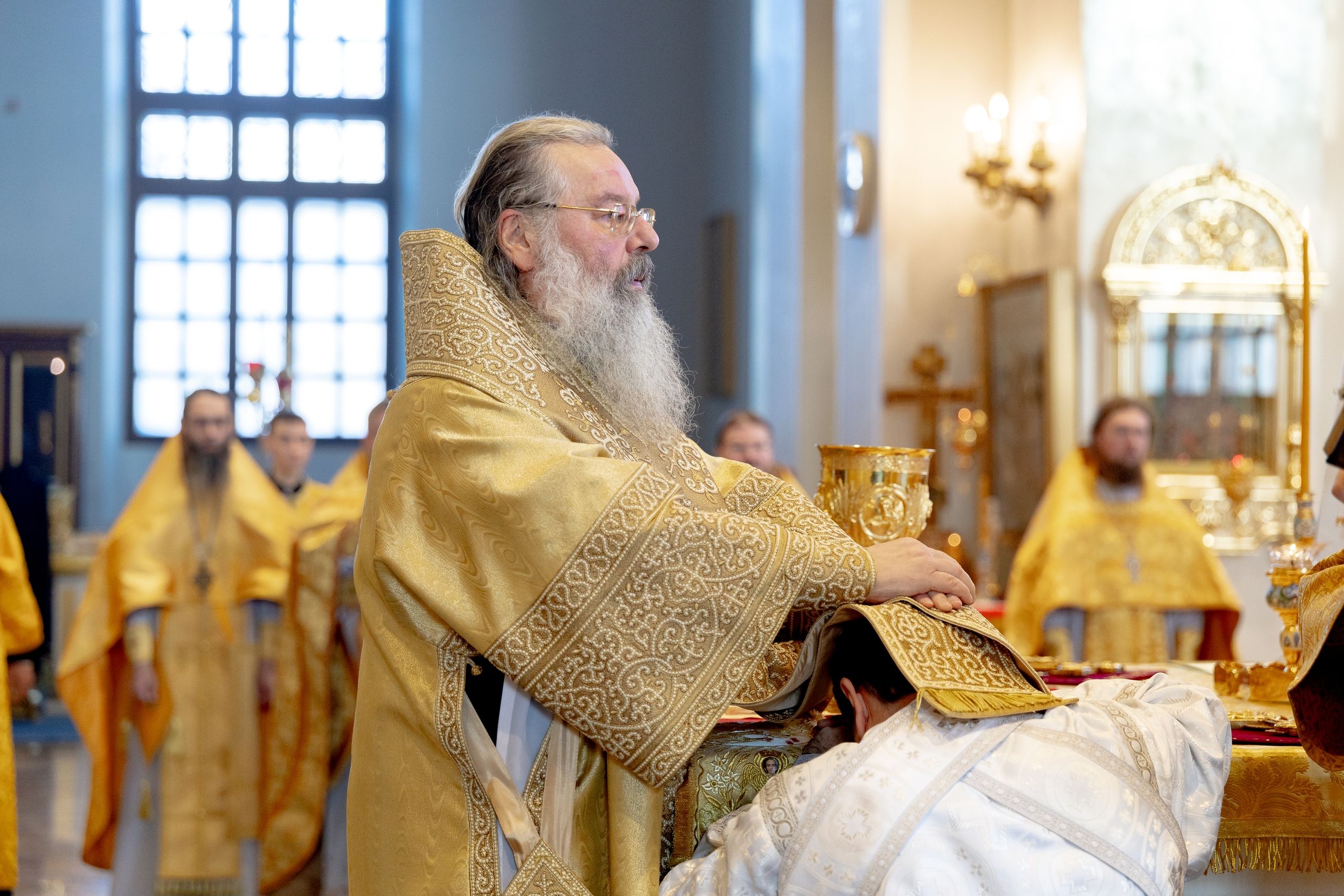 На мирной и сугубой ектениях были вознесены молитвы о Российском воинстве и о мире. Митрополит Кирилл совершил диаконскую хиротонию иподиакона Максима Никонова. По запричастном стихе проповедь произнёс иеромонах Гермоген (Рубан).