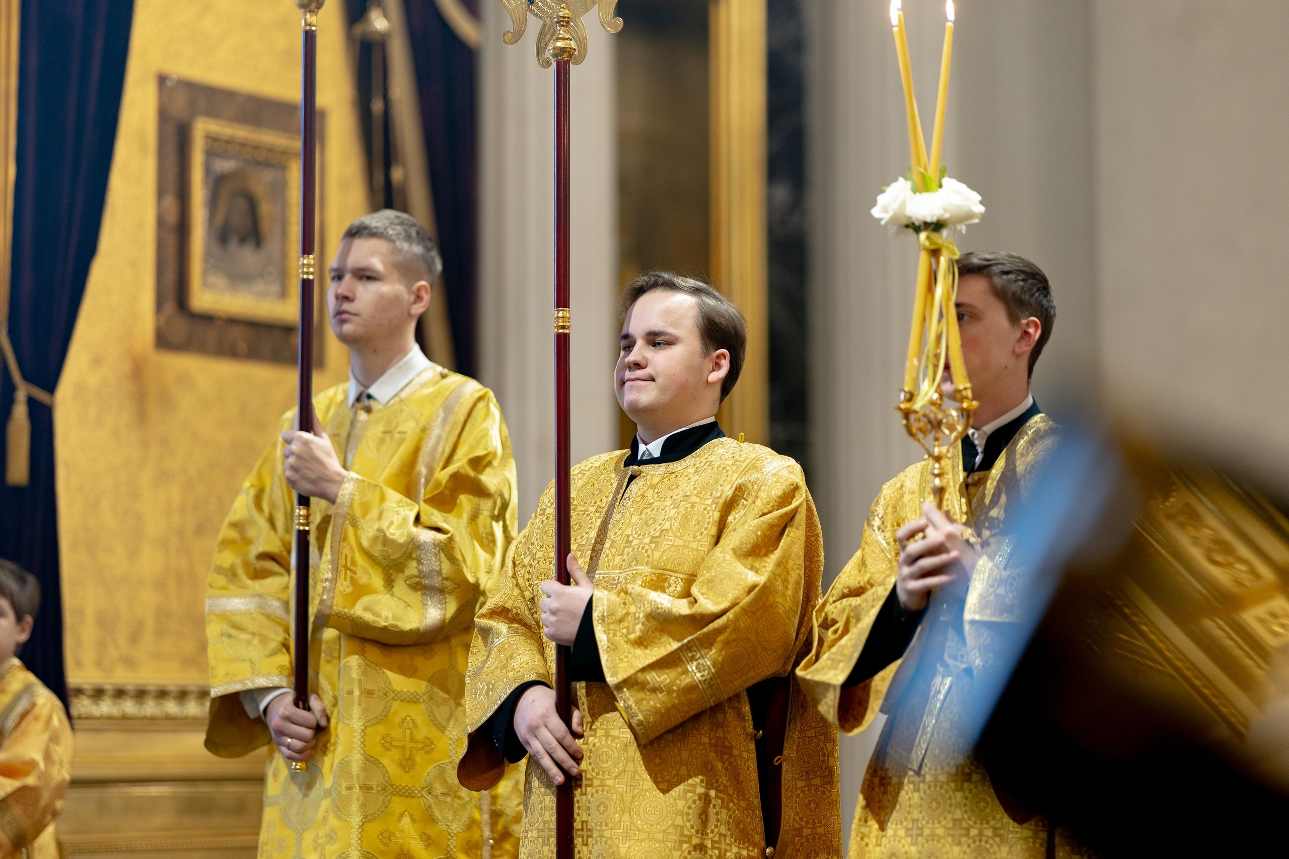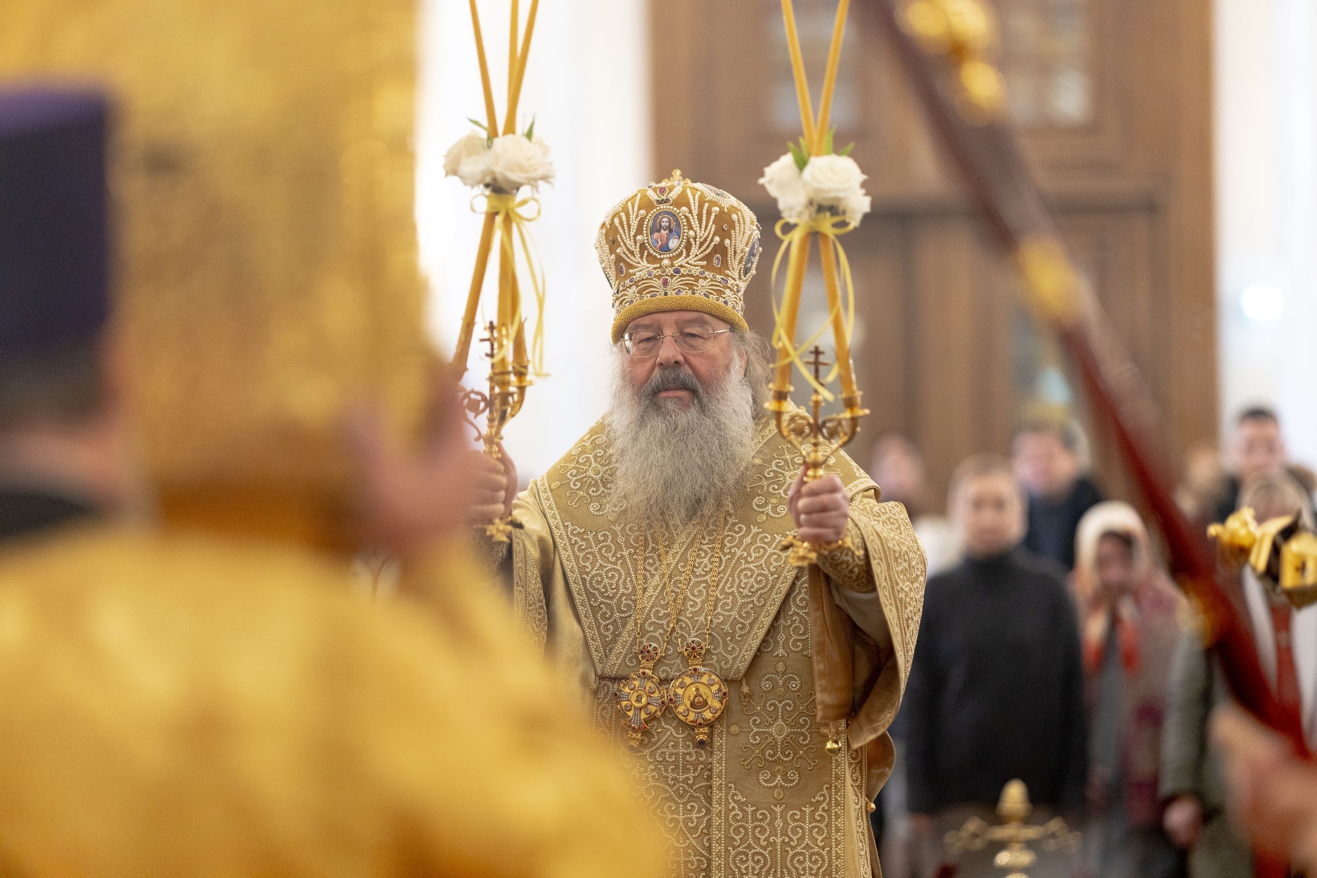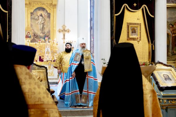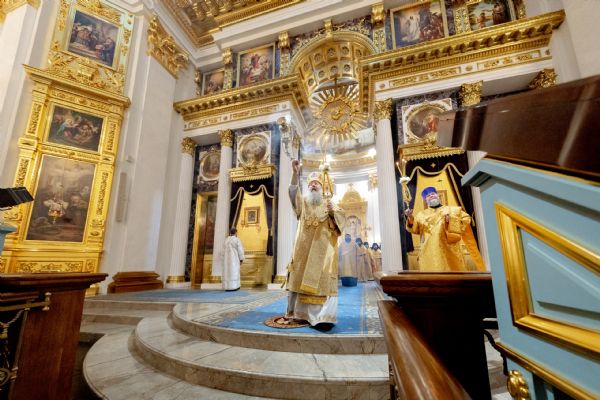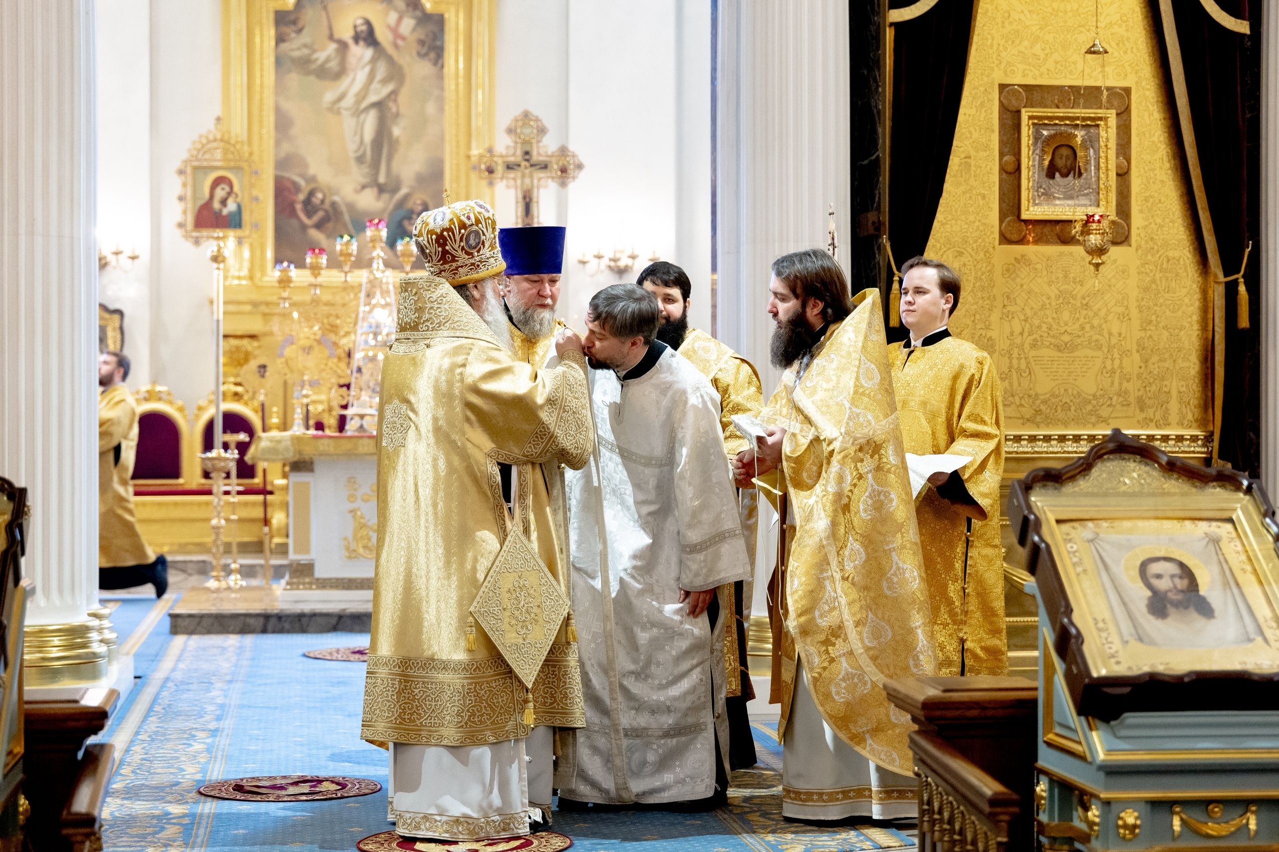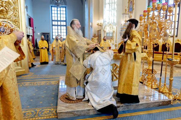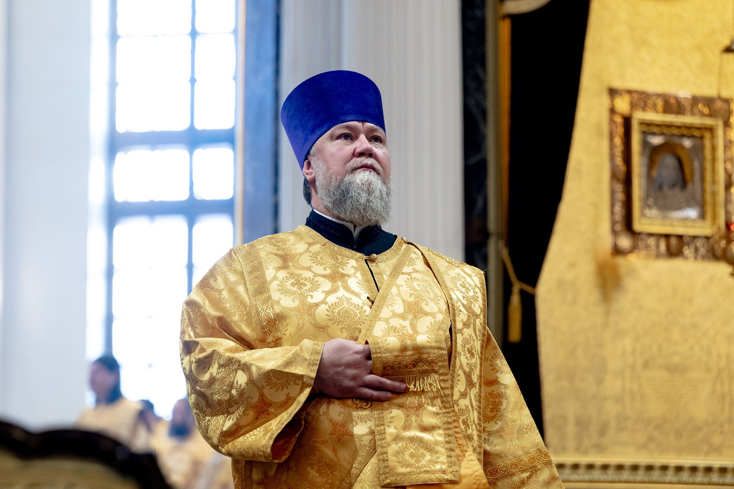 На мирной и сугубой ектениях были вознесены молитвы о Российском воинстве и о мире. Митрополит Кирилл совершил диаконскую хиротонию иподиакона Максима Никонова. По запричастном стихе проповедь произнёс иеромонах Гермоген (Рубан).