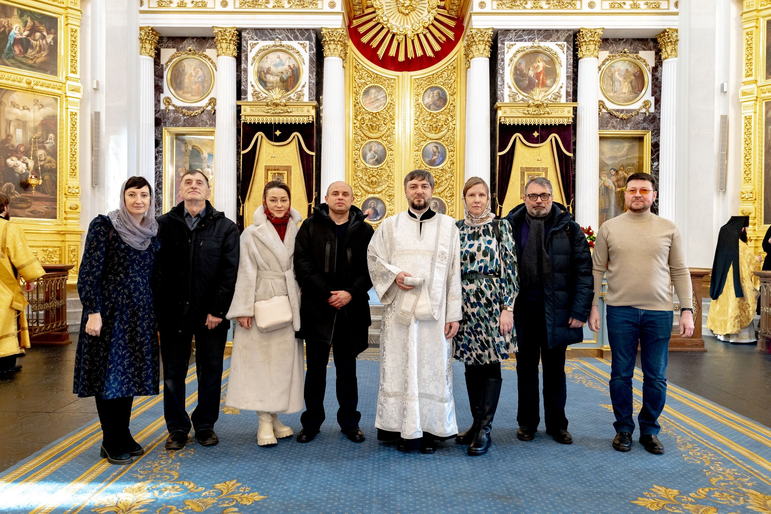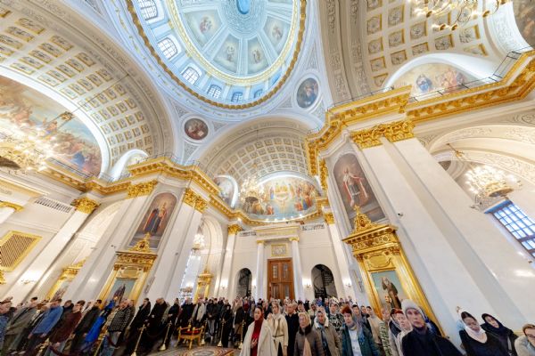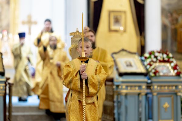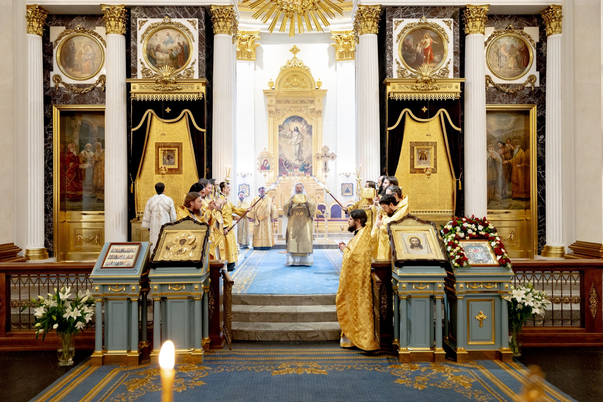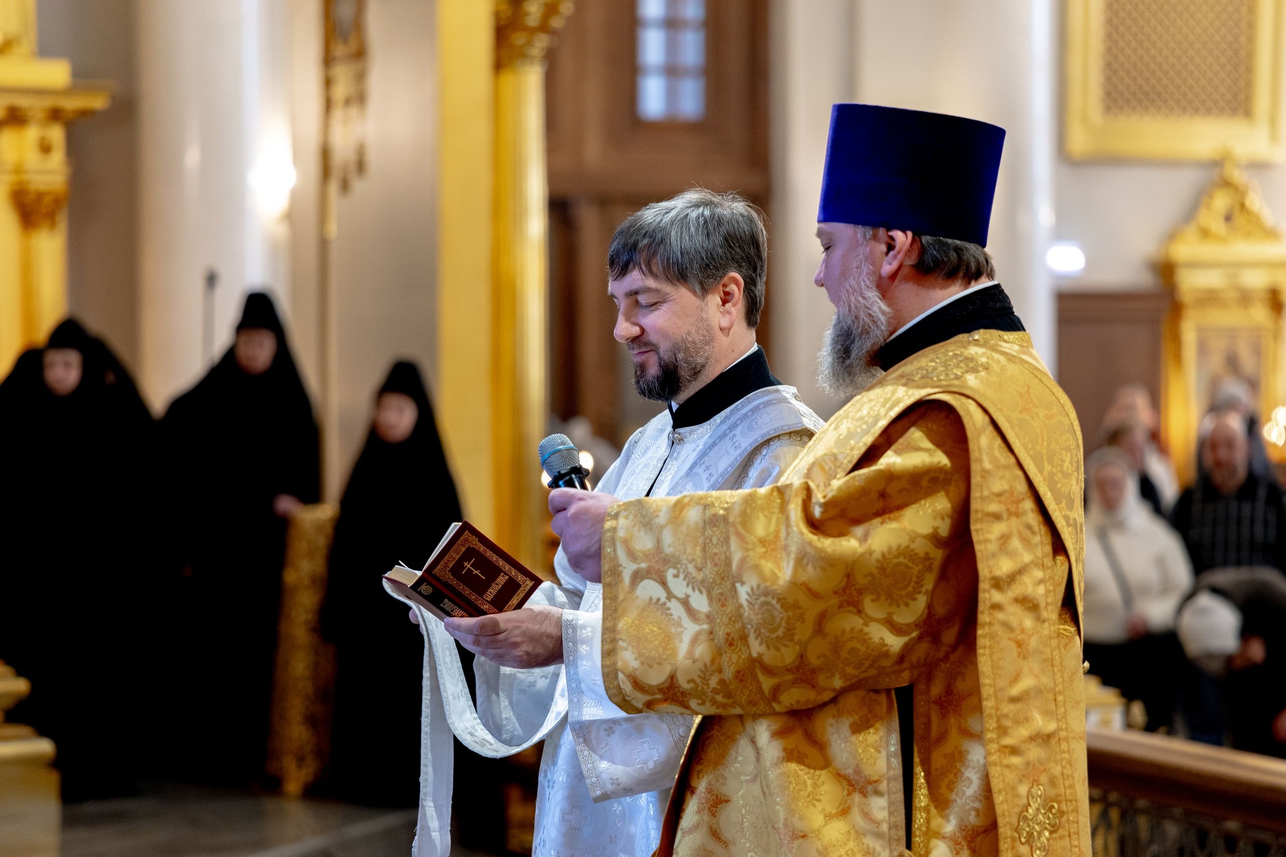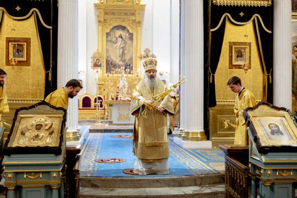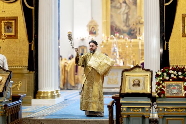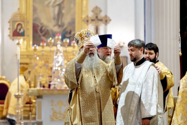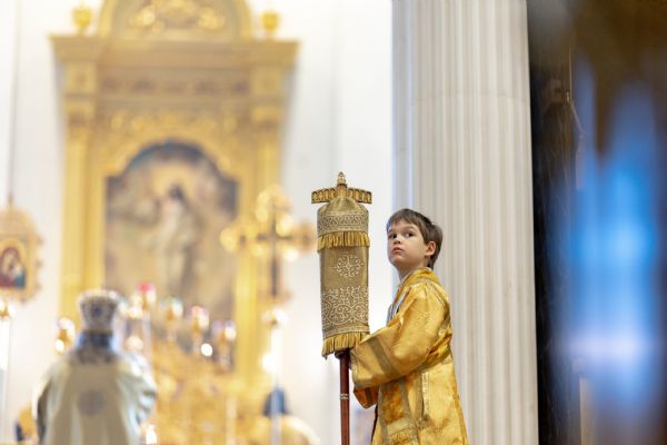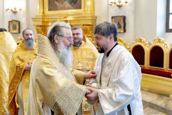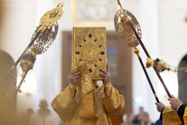 На мирной и сугубой ектениях были вознесены молитвы о Российском воинстве и о мире. Митрополит Кирилл совершил диаконскую хиротонию иподиакона Максима Никонова. По запричастном стихе проповедь произнёс иеромонах Гермоген (Рубан).