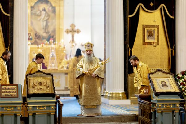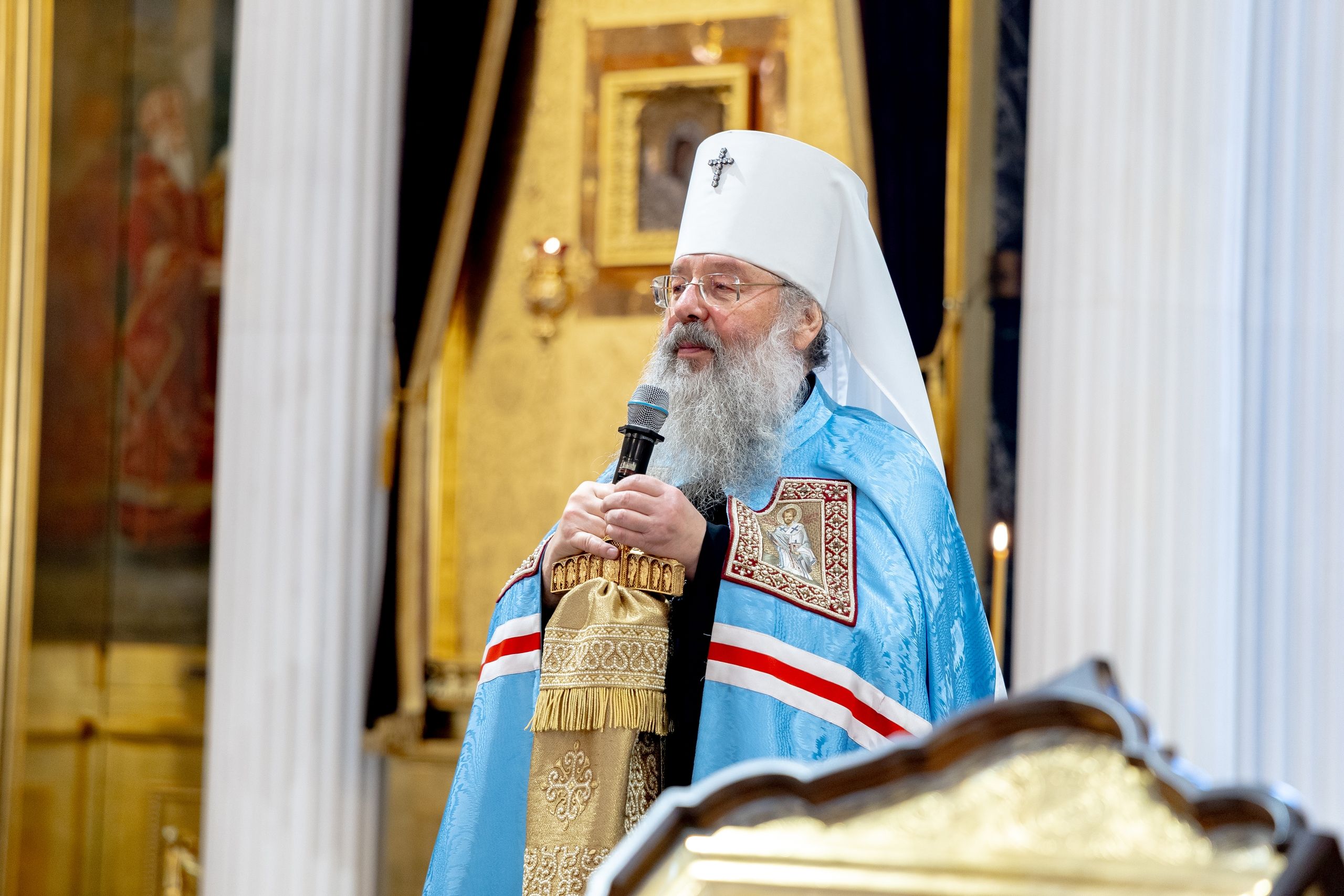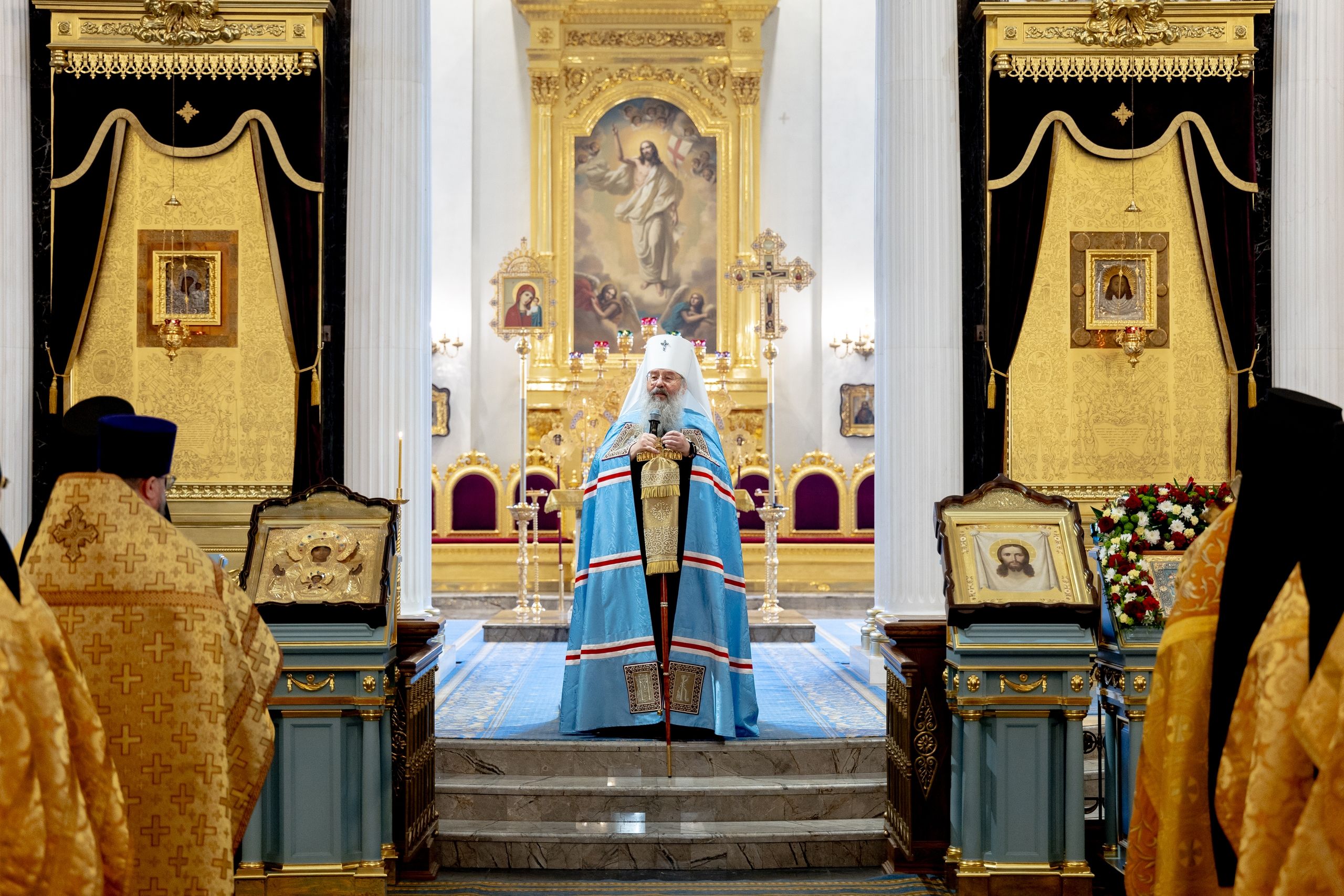 Мы собрались сегодня в доме Божией Матери у престола Божия, чтобы прославить и поблагодарить Христа Воскресшего и Пресвятую Богородицу. Пять лет назад в этот день по благословению Святейшего Патриарха вы вступили на древнюю Казанскую кафедру.