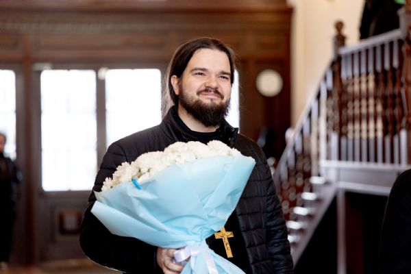 Священник преподнёс митрополиту Кириллу букет цветов.