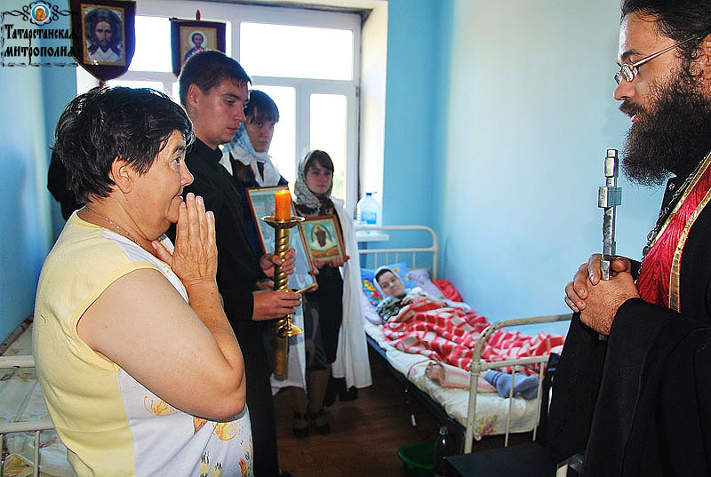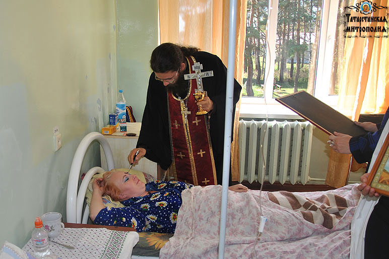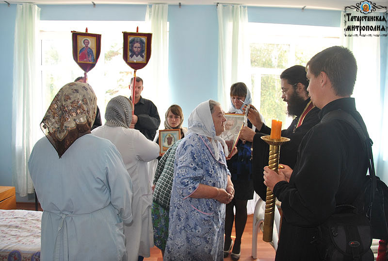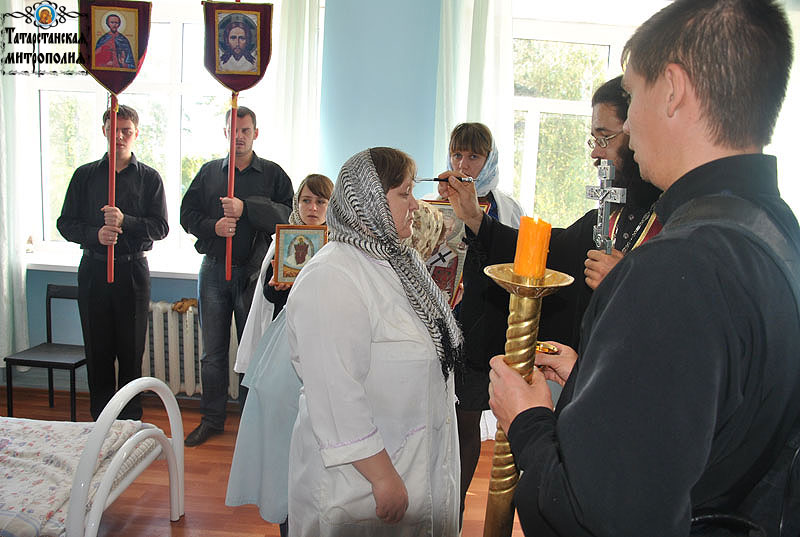 С согласия руководства больницы иконы с молитвенным пением были пронесены по палатам к тем, кто, по немощи своей, не мог быть на общей молитве. В каждой палате отец Алексий рассказал о святых образах, о чудотворениях, явленных через них Господом, помазал освящённым маслом, в которое было добавлено миро, проявившееся на иконах.