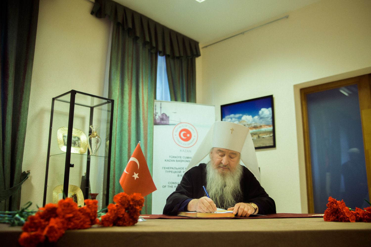 Генеральный консул Турхан Дильмач поблагодарил за то, что священнослужители двух традиционных для Татарстана религий пришли сегодня, «ведь в такие тяжелые времена визит и слова поддержки друзей становятся еще более ценными». Консул сообщил, что свои соболезнования отправили и Президент России, и премьер-министр, и президент Татарстана, находясь в Китае, и поблагодарил за визит владыку Феофана и Рустама-хазрата.