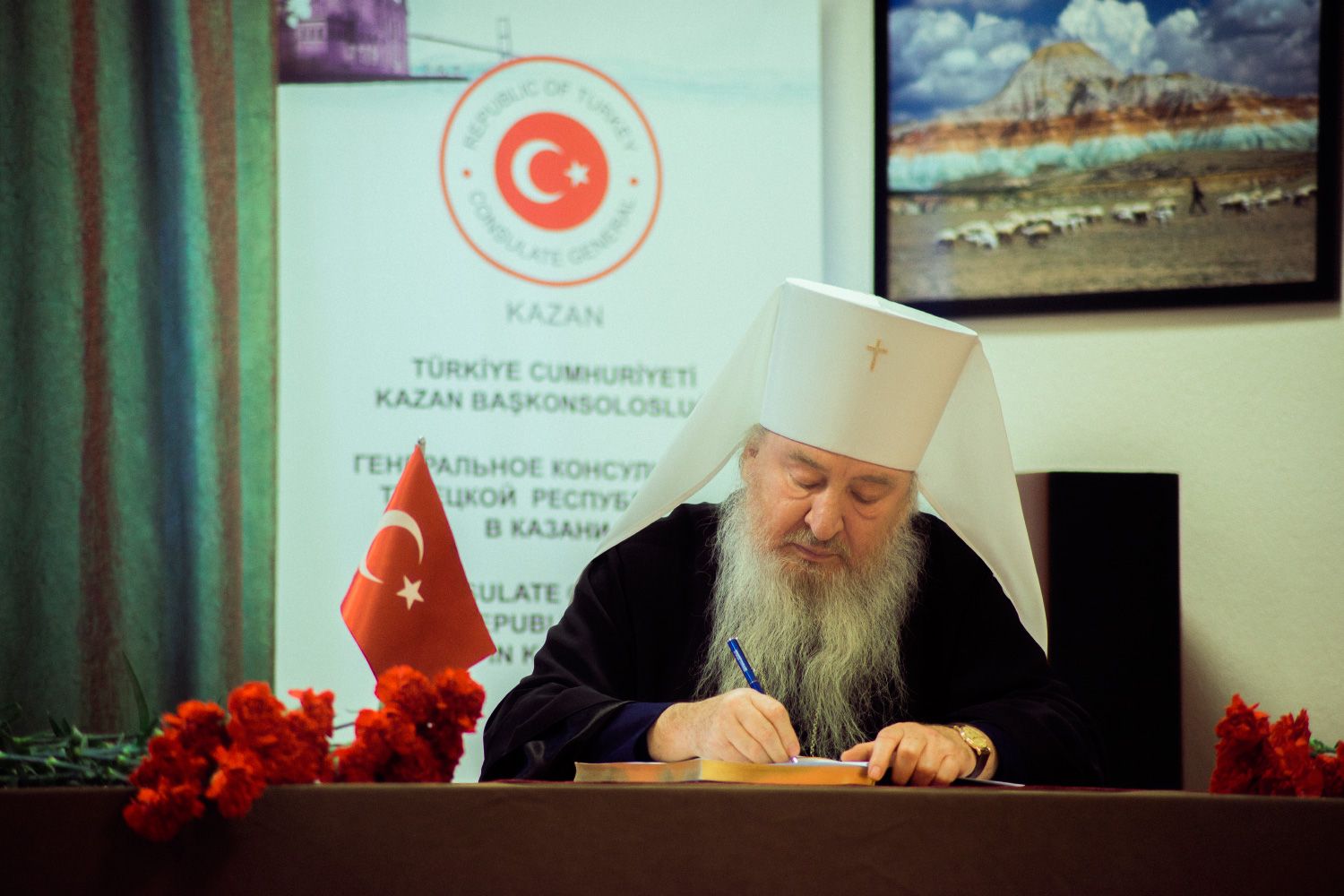 Сегодня, 12 октября митрополит Казанский и Татарстанский Феофан встретился с Турецким консулом в Казани. Владыка выразил соболезнование в связи с терактом в Турции 10 октября. Встреча проходила в Генеральном консульстве Турецкой республики в Казани. Во встрече принял участие заместитель муфтия РТ Рустам-хазрат Хайрулин, который также выразил соболезнования от лица муфтия.