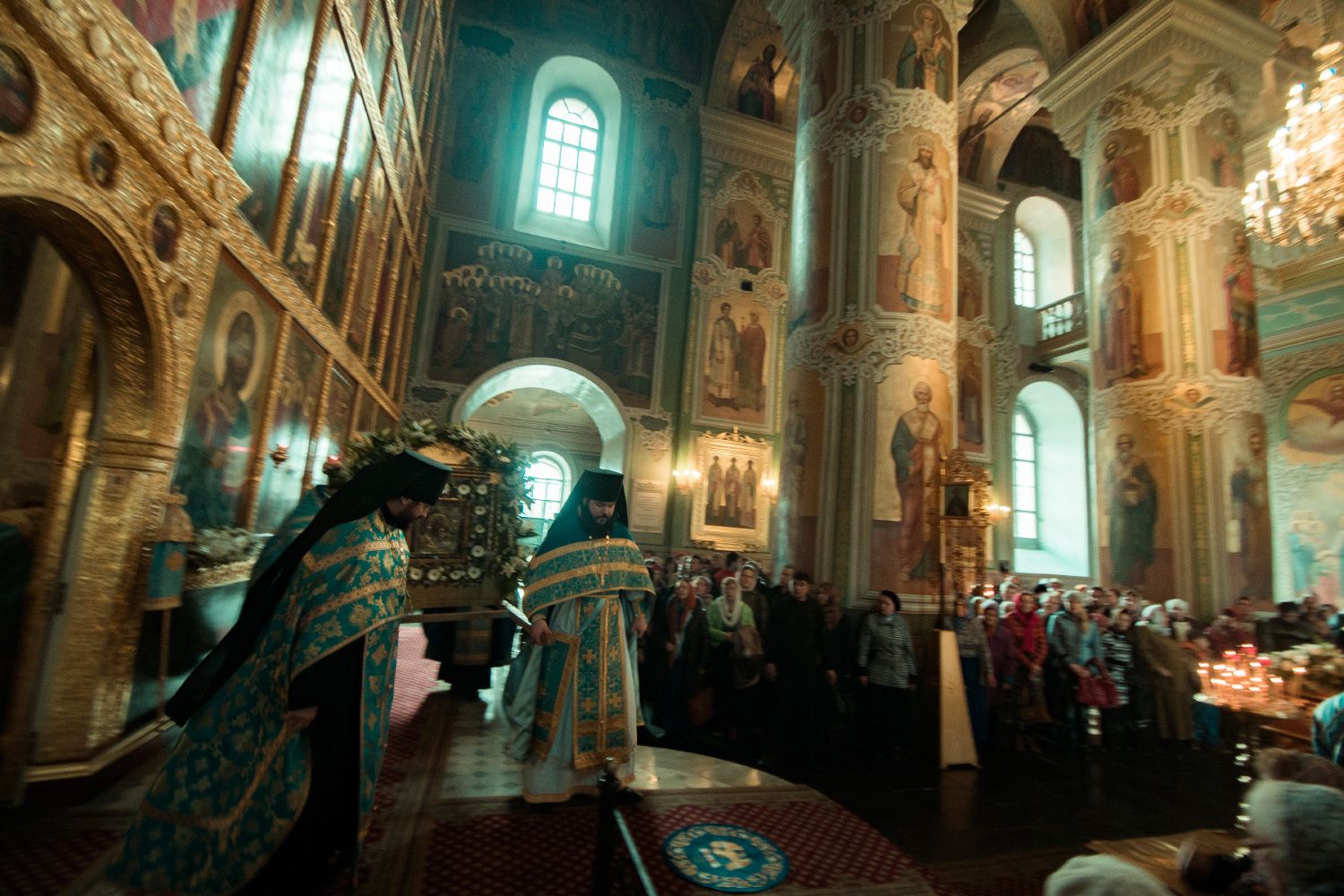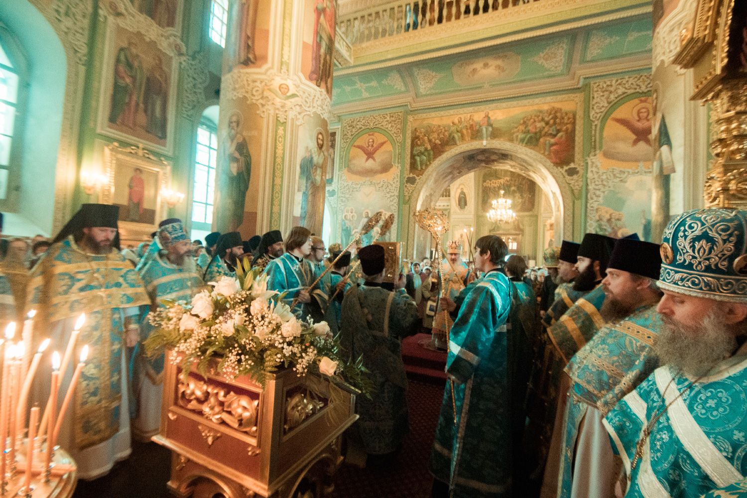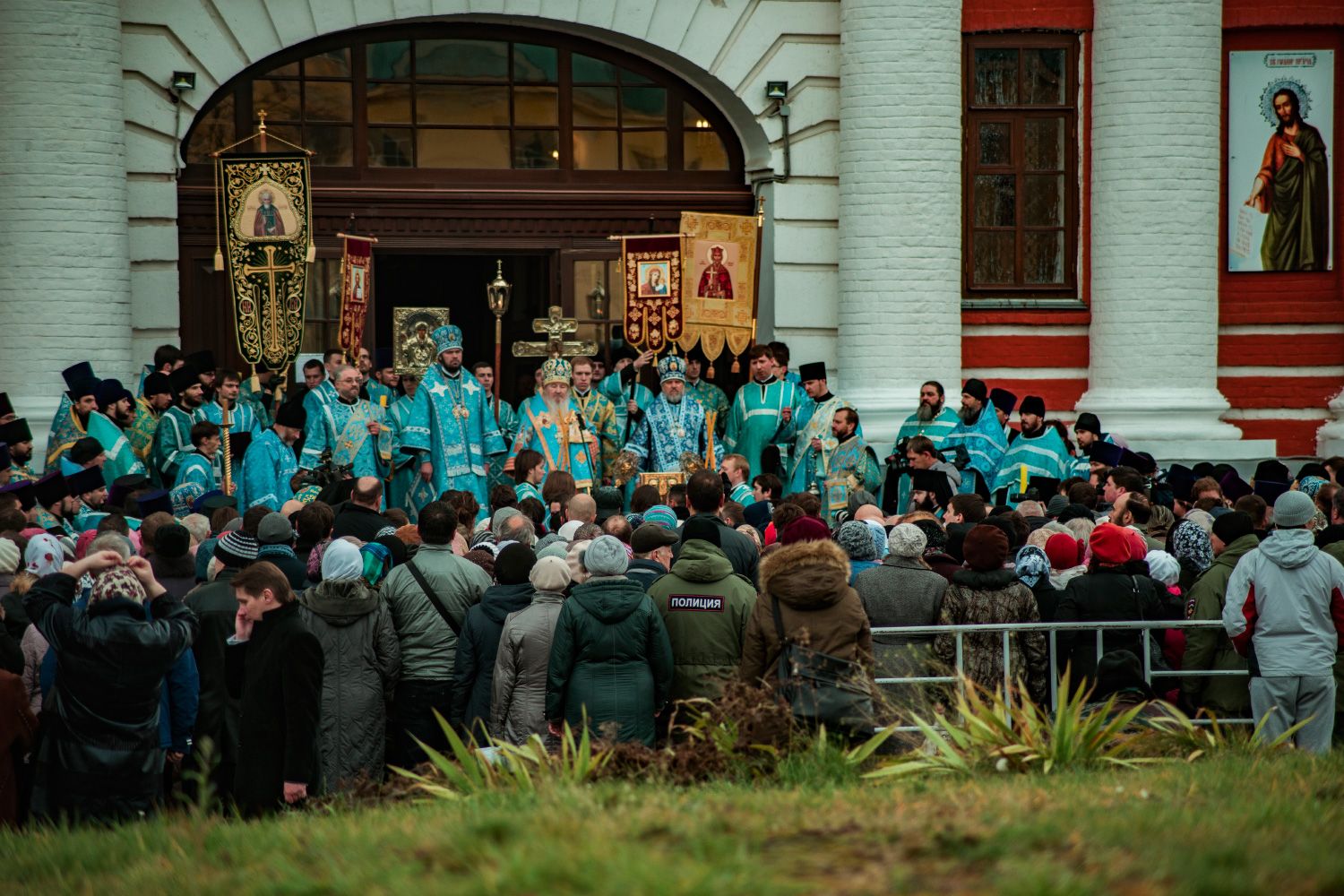 По прибытии в монастырь у стен Крестовоздвиженского собора, на месте обретения иконы, был совершен молебен перед чудотворным образом Божией Матери «Казанская». Затем митрополит Феофан обратился к верующим.