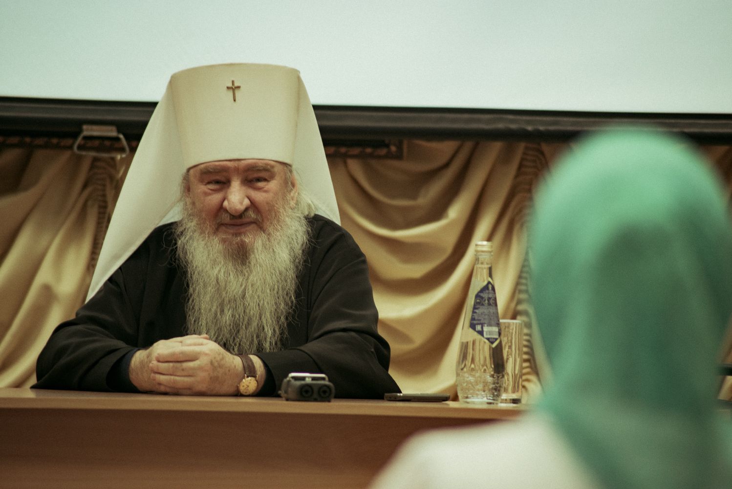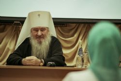 Во второй половине встречи митрополит Феофан ответил на вопросы присутствующих, в том числе, о предстоящем Всеправославном Соборе, миссионерской Литургии, проблеме выгорания социального работника, преподавании «Основ православной культуры» в школе, диалоге с представителями деструктивных сект.