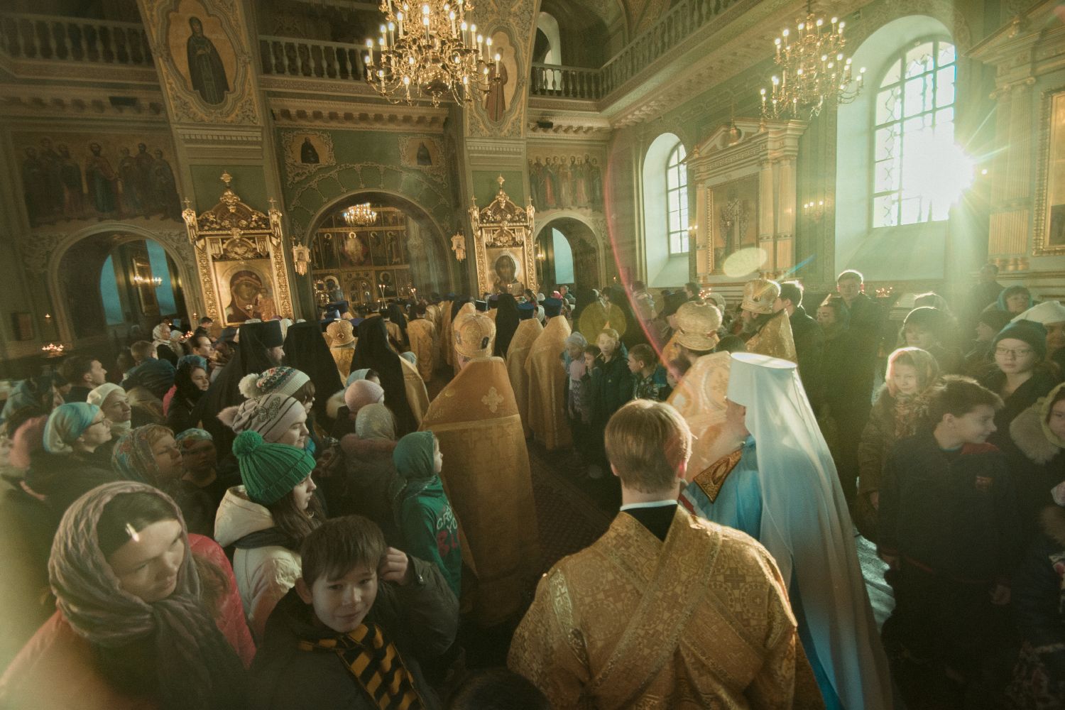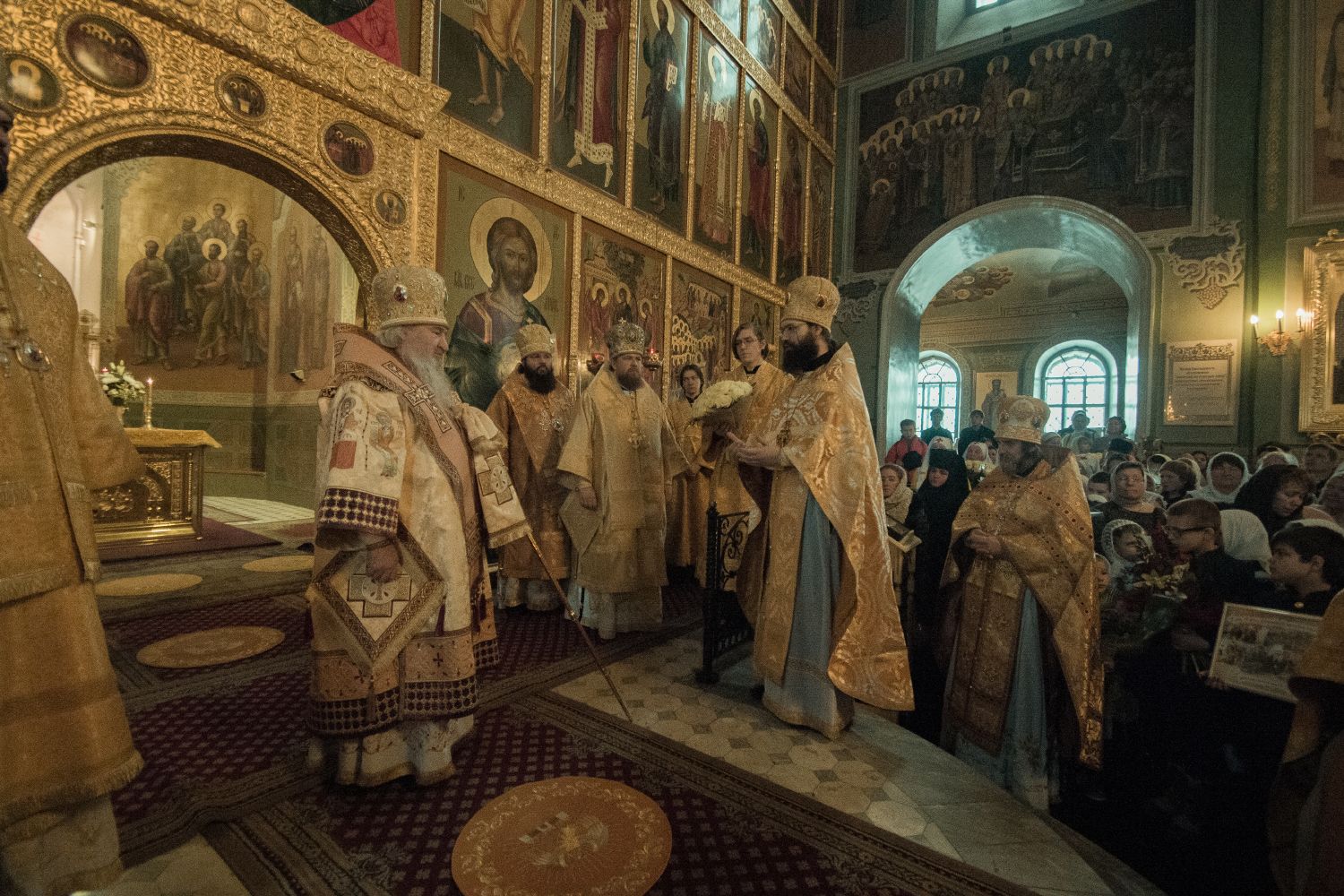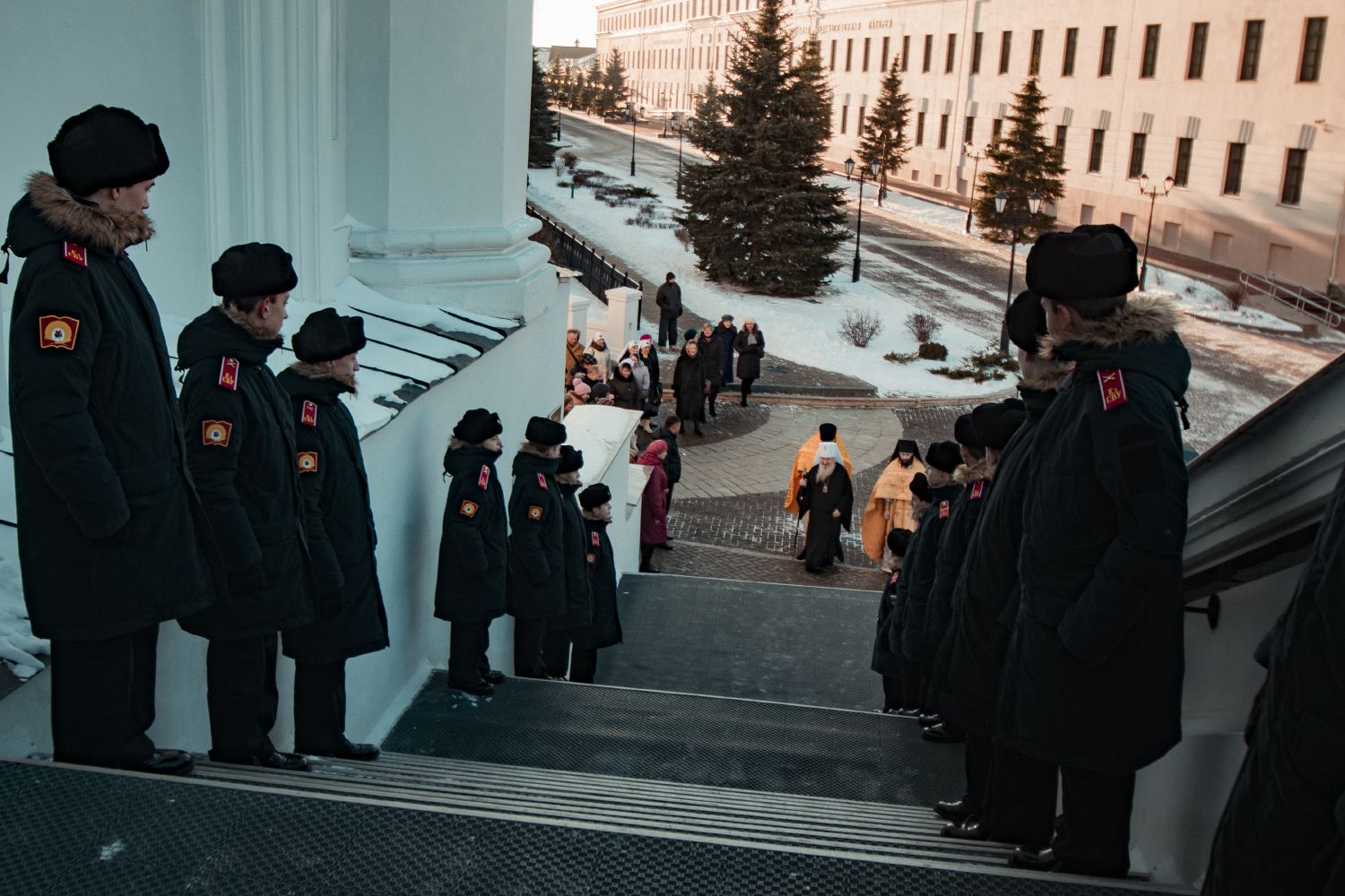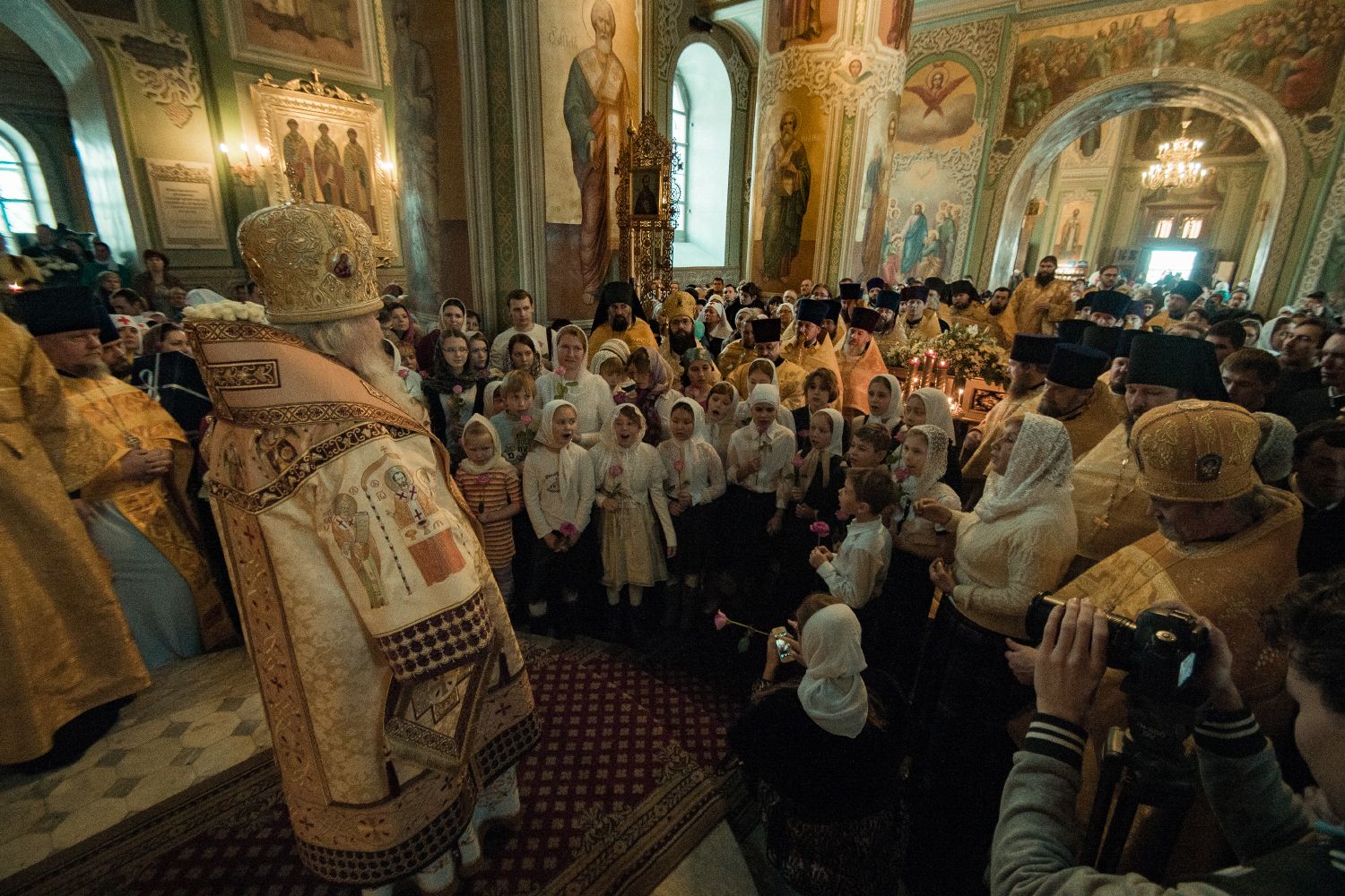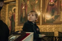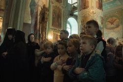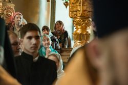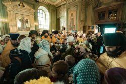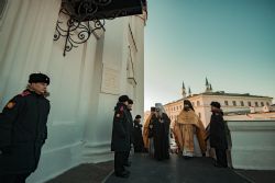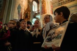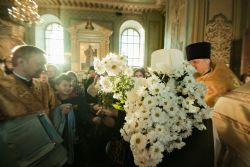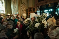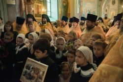 Перед началом богослужения у входа в собор митрополита Феофана, который в эти дни отмечает 15-летие архиерейской хиротонии, встретили кадеты Казанского суворовского военного училища; в храме учащиеся воскресных школ города Казани преподнесли Его Высокопреосвященству цветы.