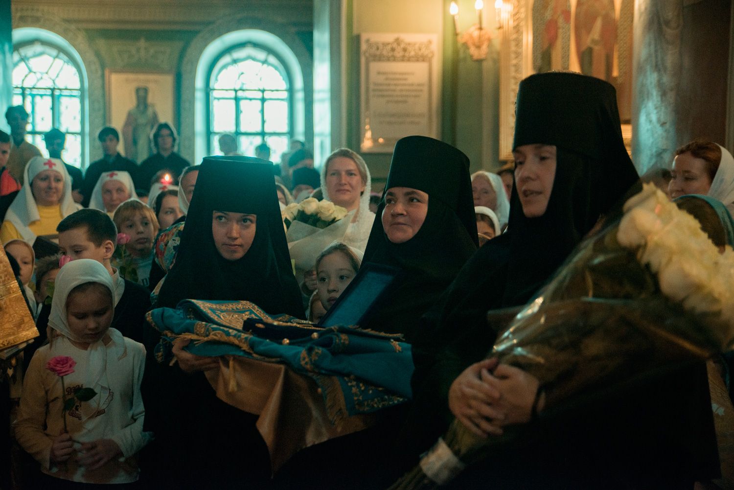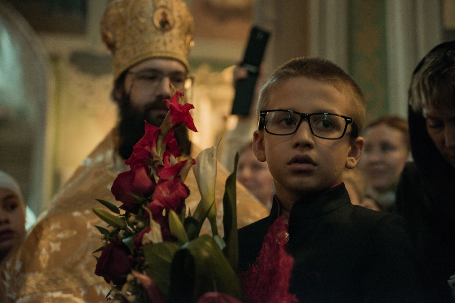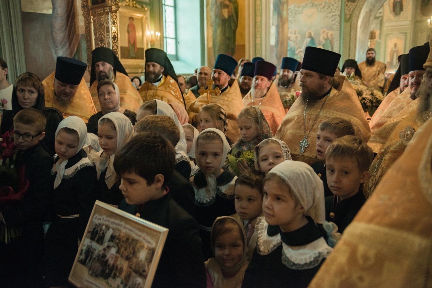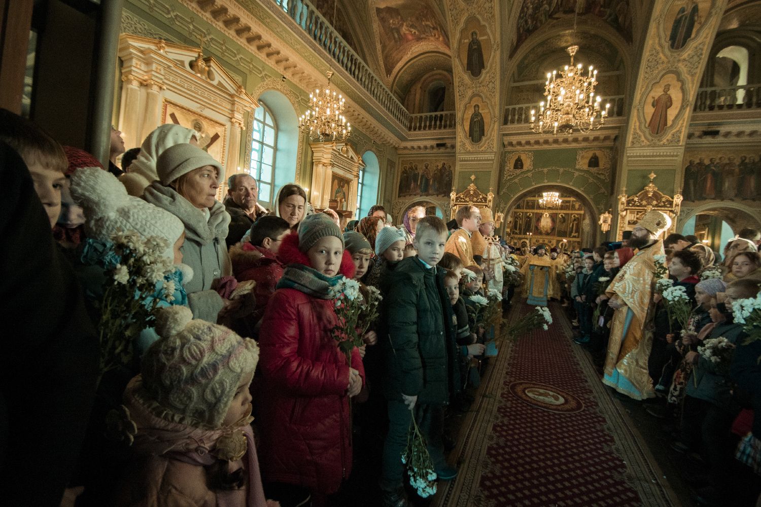 Перед началом богослужения у входа в собор митрополита Феофана, который в эти дни отмечает 15-летие архиерейской хиротонии, встретили кадеты Казанского суворовского военного училища; в храме учащиеся воскресных школ города Казани преподнесли Его Высокопреосвященству цветы.