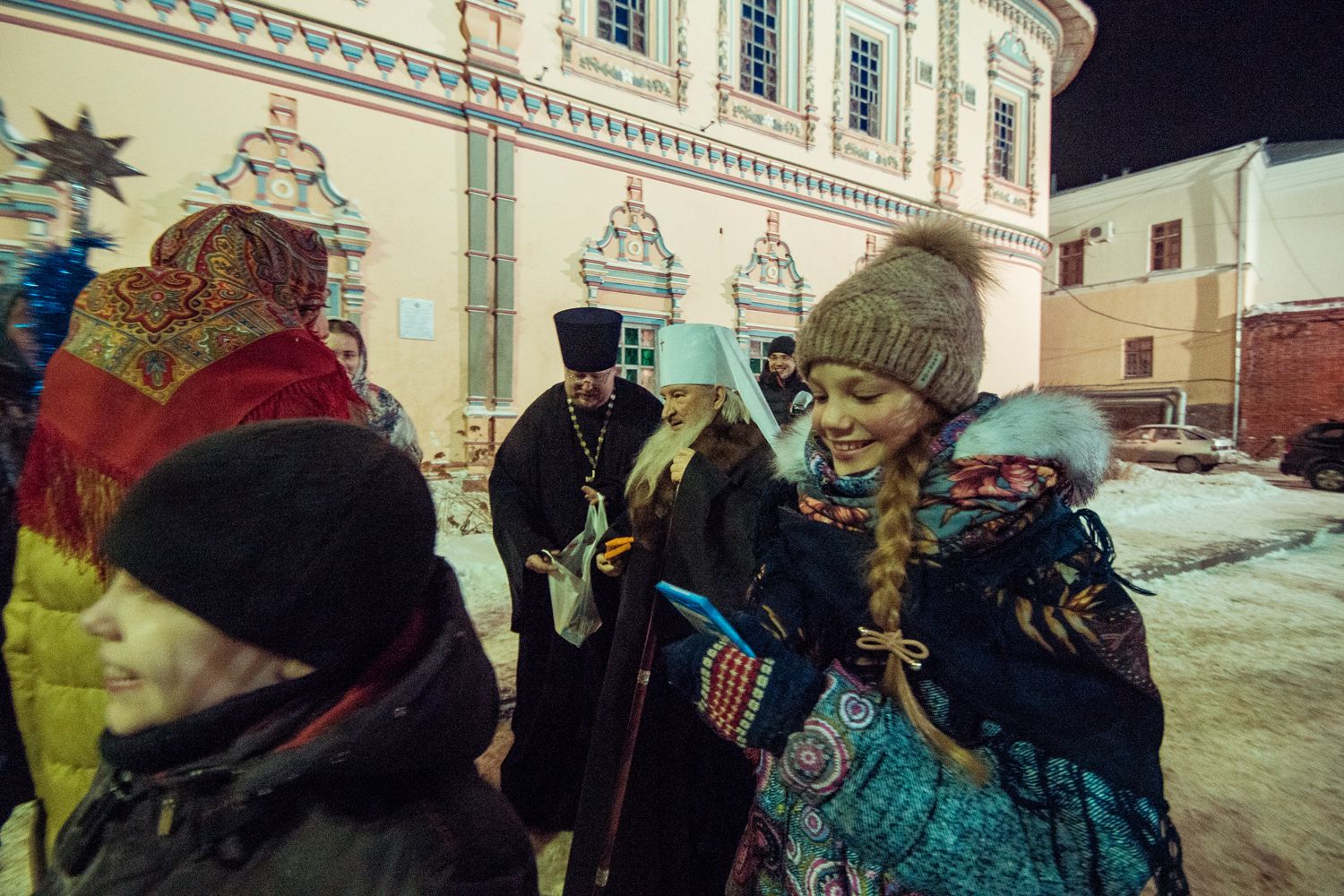 Вечером 6 января, перед началом всенощного бдения, главу Татарстанской митрополии у входа в храм приветствовали воспитанники приходской воскресной школы. Поздравляя архипастыря с праздником Рождества Христова, дети пропели колядки.