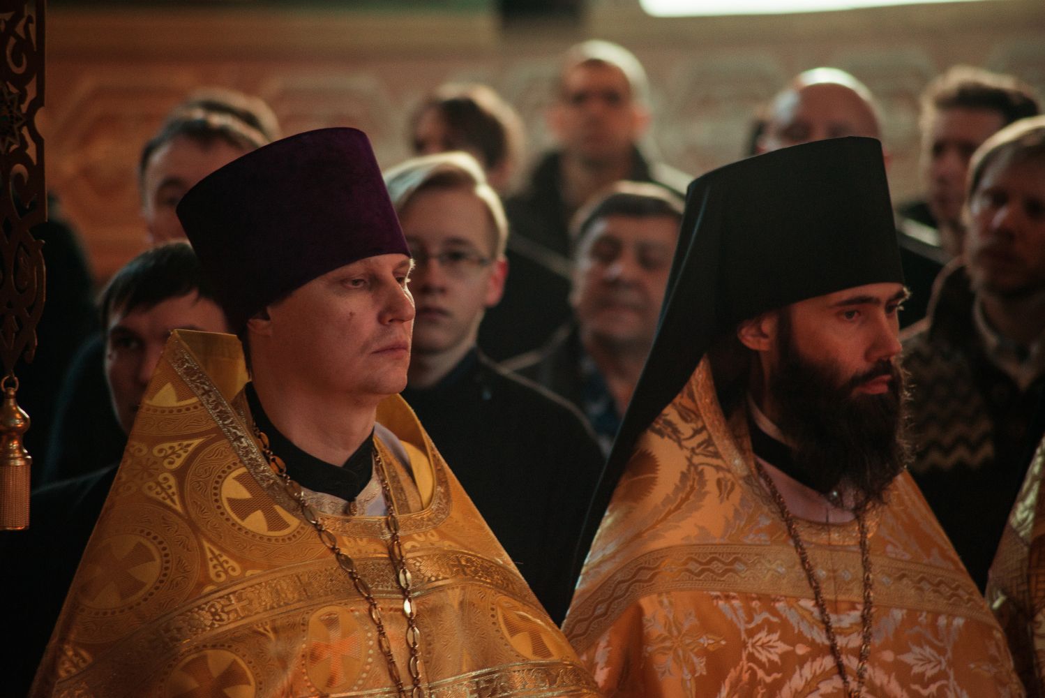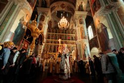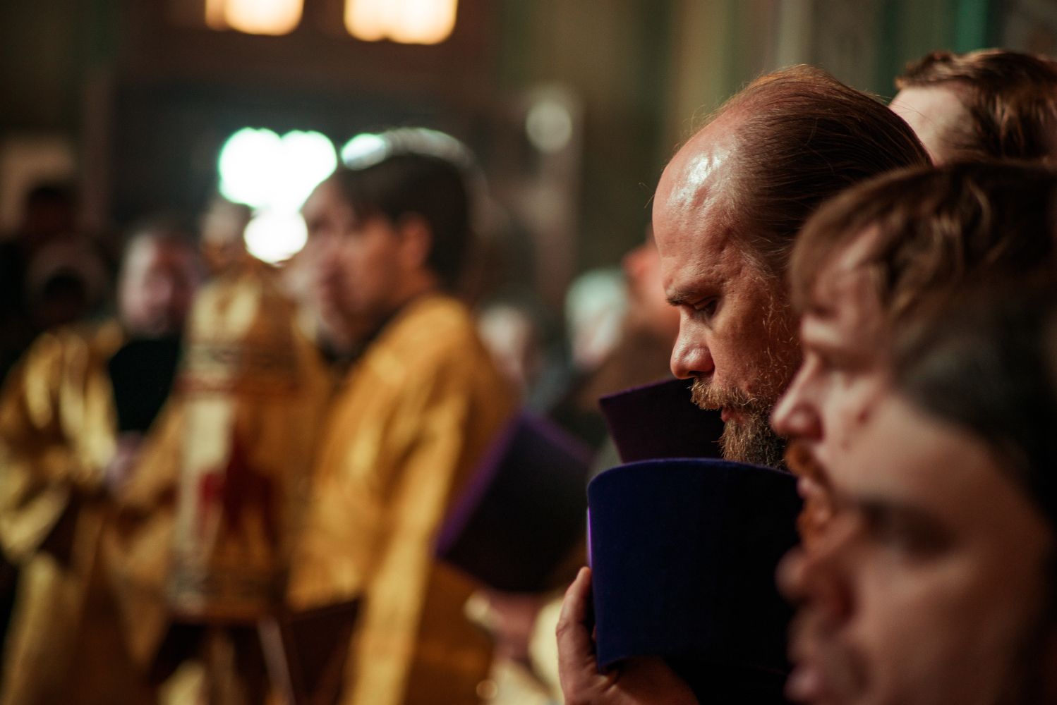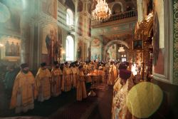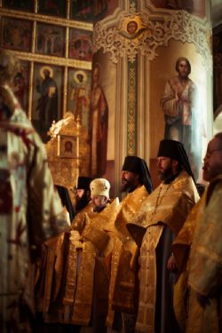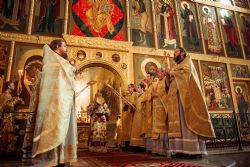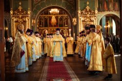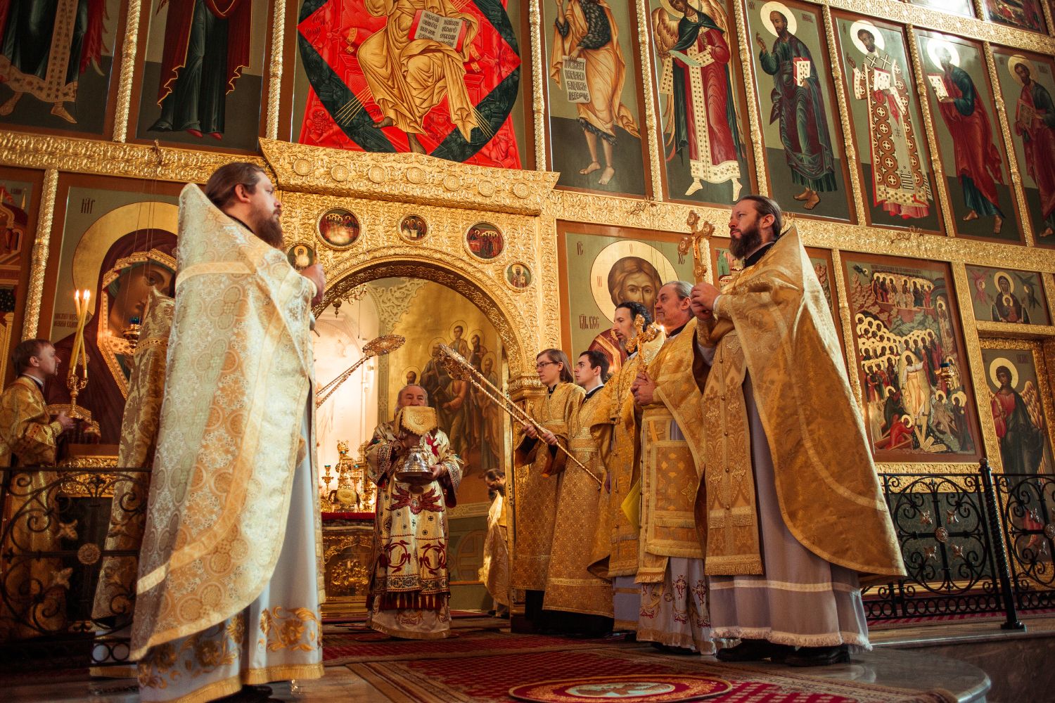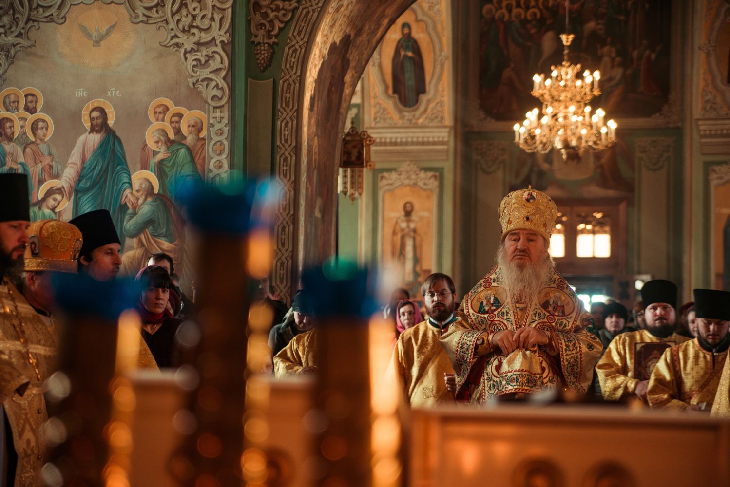 По завершении Литургии собор духовенства во главе с владыкой Феофаном в середине храма совершил чинопоследование Недели Православия.