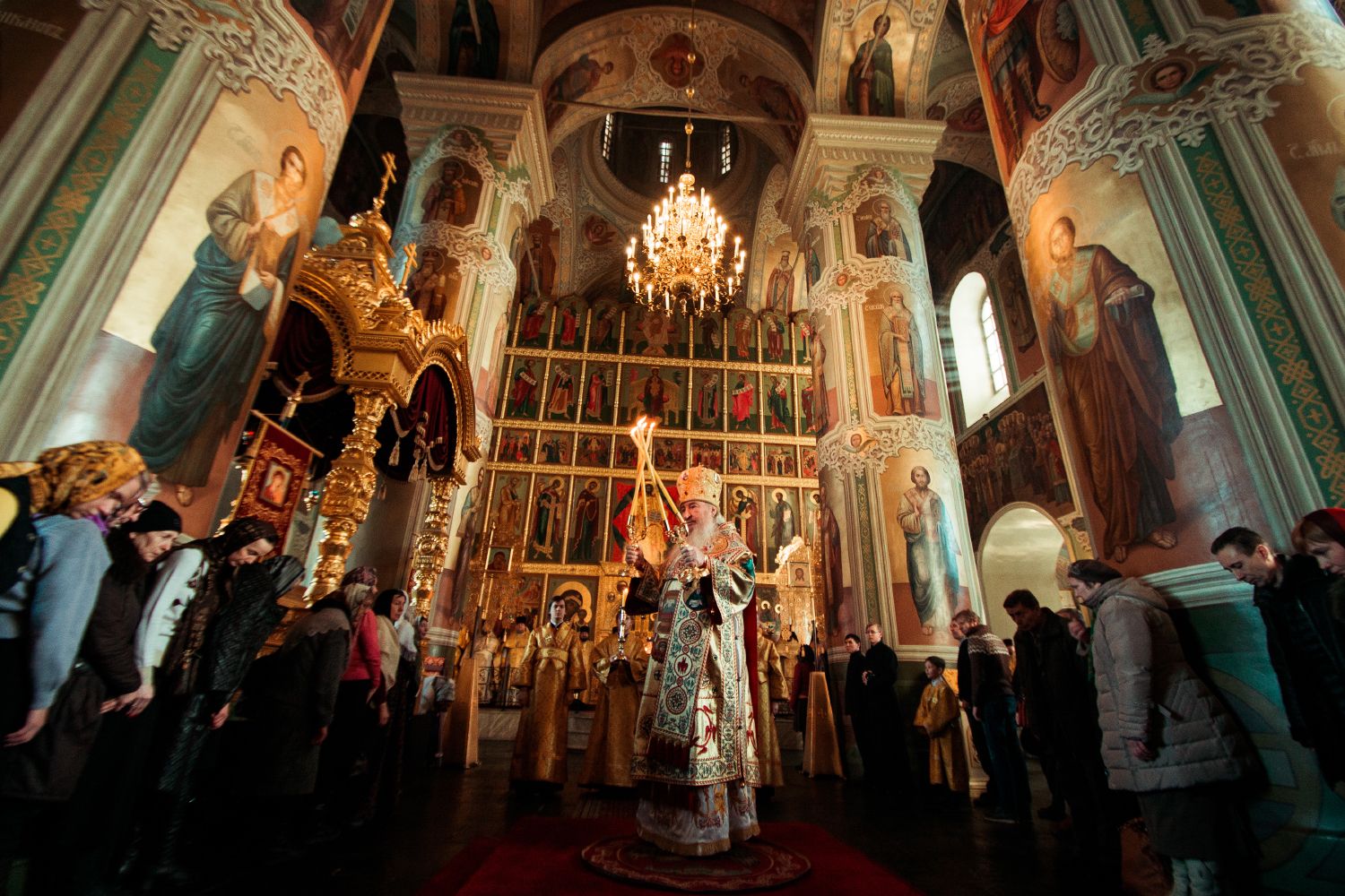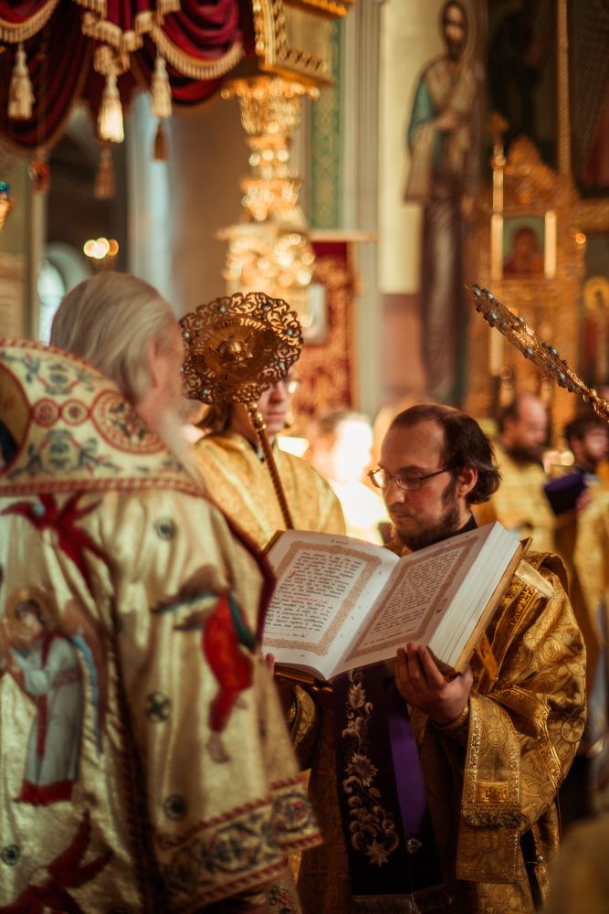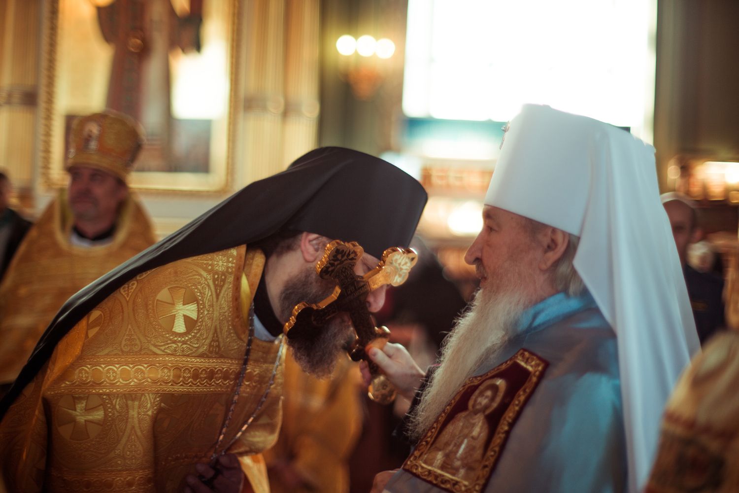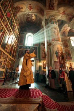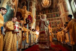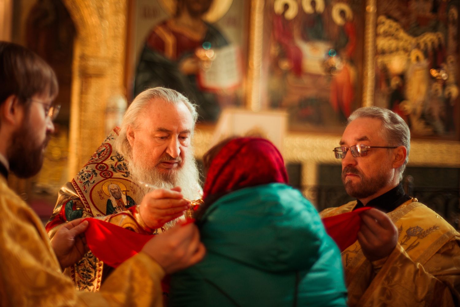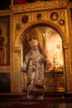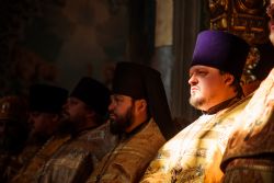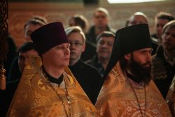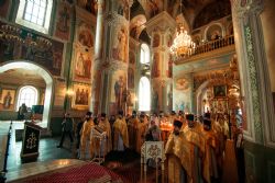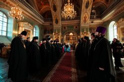 По завершении Литургии собор духовенства во главе с владыкой Феофаном в середине храма совершил чинопоследование Недели Православия.