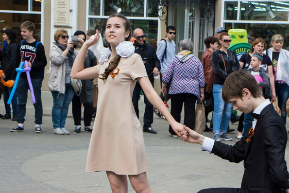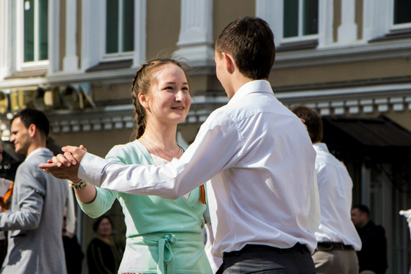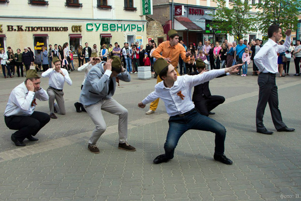 На главной пешеходной улице Казани прозвучали известные военные песни, а на площадке исполнены любимые поколениями танцы. Причём танцы проходили в необычной форме — за несколько минут выступления многочисленные зрители увидели своеобразную инсценировку тех тяжелых и радостных событий — довоенные годы, романтические знакомства, а после внезапно — война и фронтовая жизнь. И, конечно, особой радостью и слезами счастья в сердцах всех, кто был рядом с танцующей молодежью, отзывались звуки победного сообщения Советского Информбюро и песни Великой Победы.
