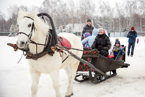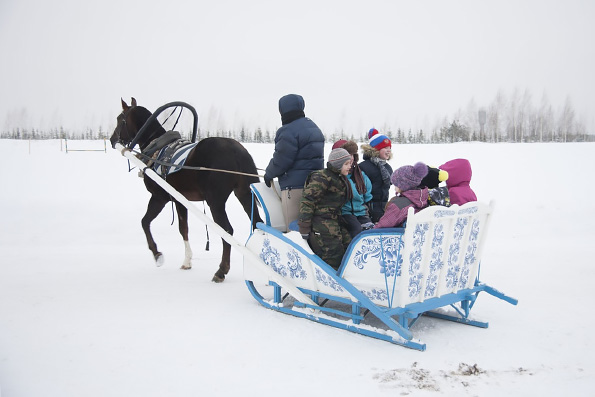 Познакомившись с обитателями конюшни и узнав много интересного о породах лошадей и об уходе за ними, ребята вместе с родителями и педагогами покатались на санях и верхом на лошадях.