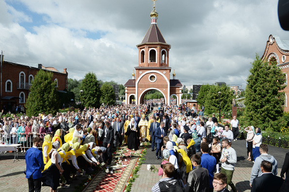 Предстоятель Русской Церкви обратился к верующим с Первосвятительским словом и передал в дар храму икону Христа Спасителя. Также Святейший Патриарх поблагодарил митрополита Варнаву за труды и вручил юбилейные крест и панагию, которые были изготовлены по случаю торжеств, посвященных 1000-летию преставления святого равноапостольного князя Владимира.