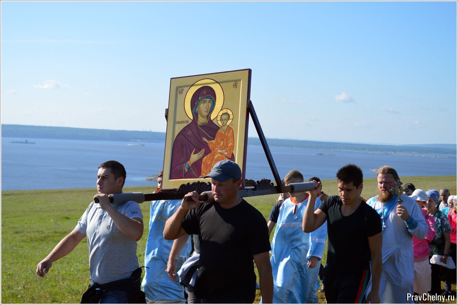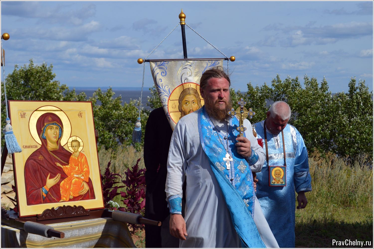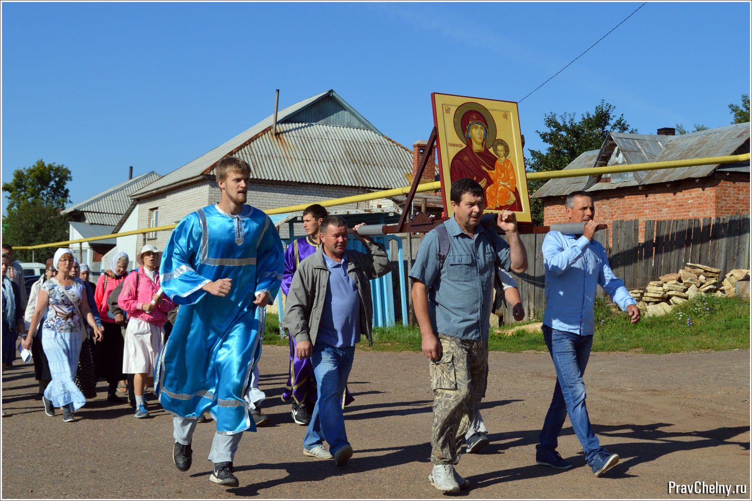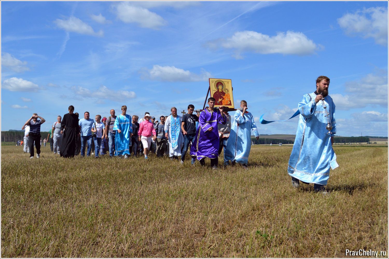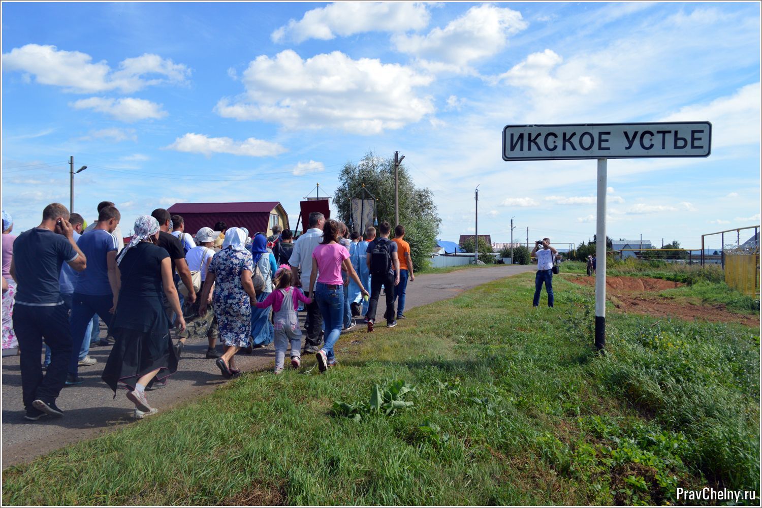 За шесть часов пути верующие с несмолкаемым молитвенным пением прошли к месту взорванного в 80-х годах прошлого века Смоленского храма села Икское Устье, где ныне строится церковь во имя мученика Уара. Возглавил шествие с празднуемой иконой Девы Марии настоятель менделеевского Богоявленского храма протоиерей Алексий Загуменнов.