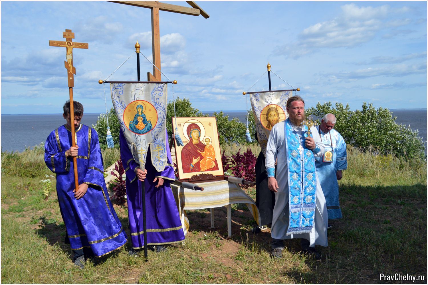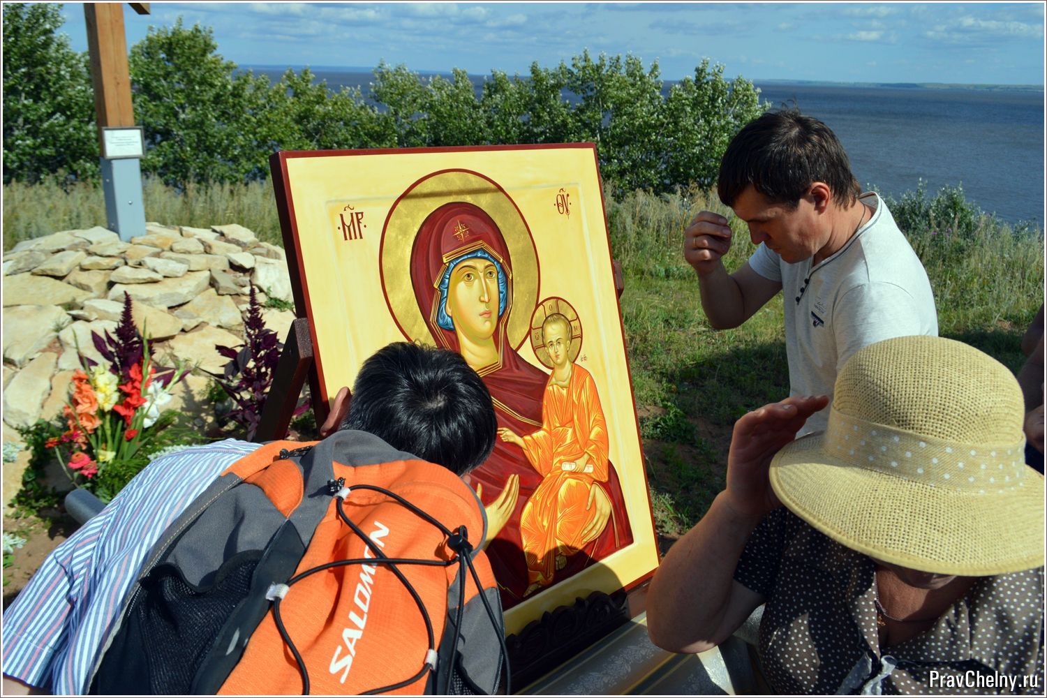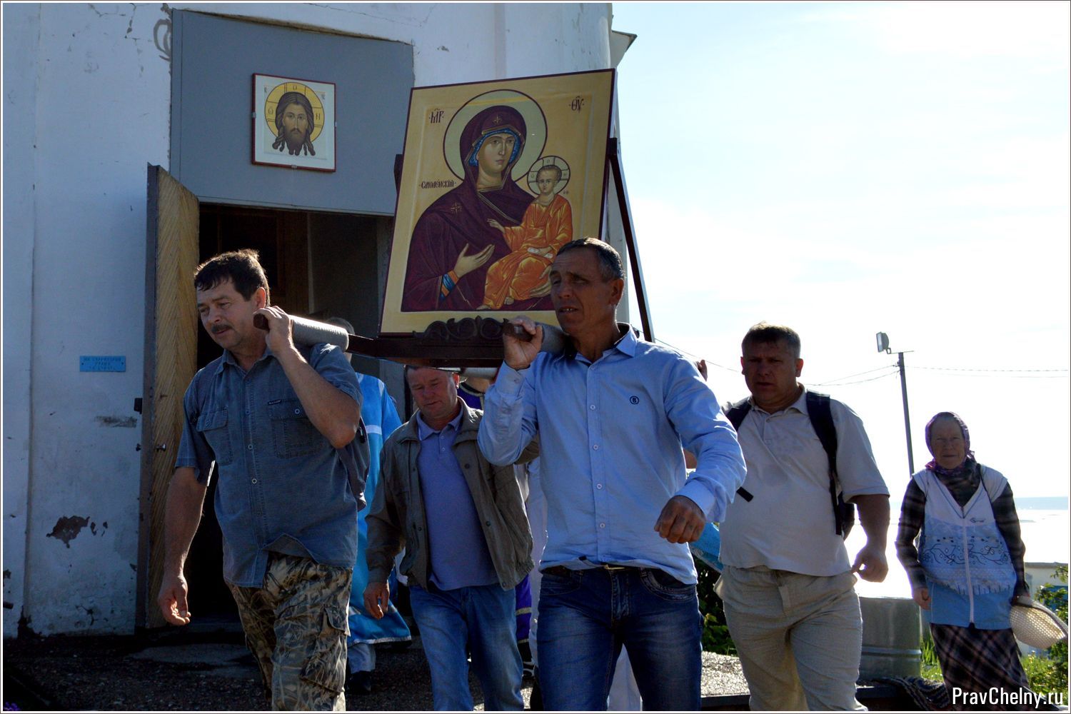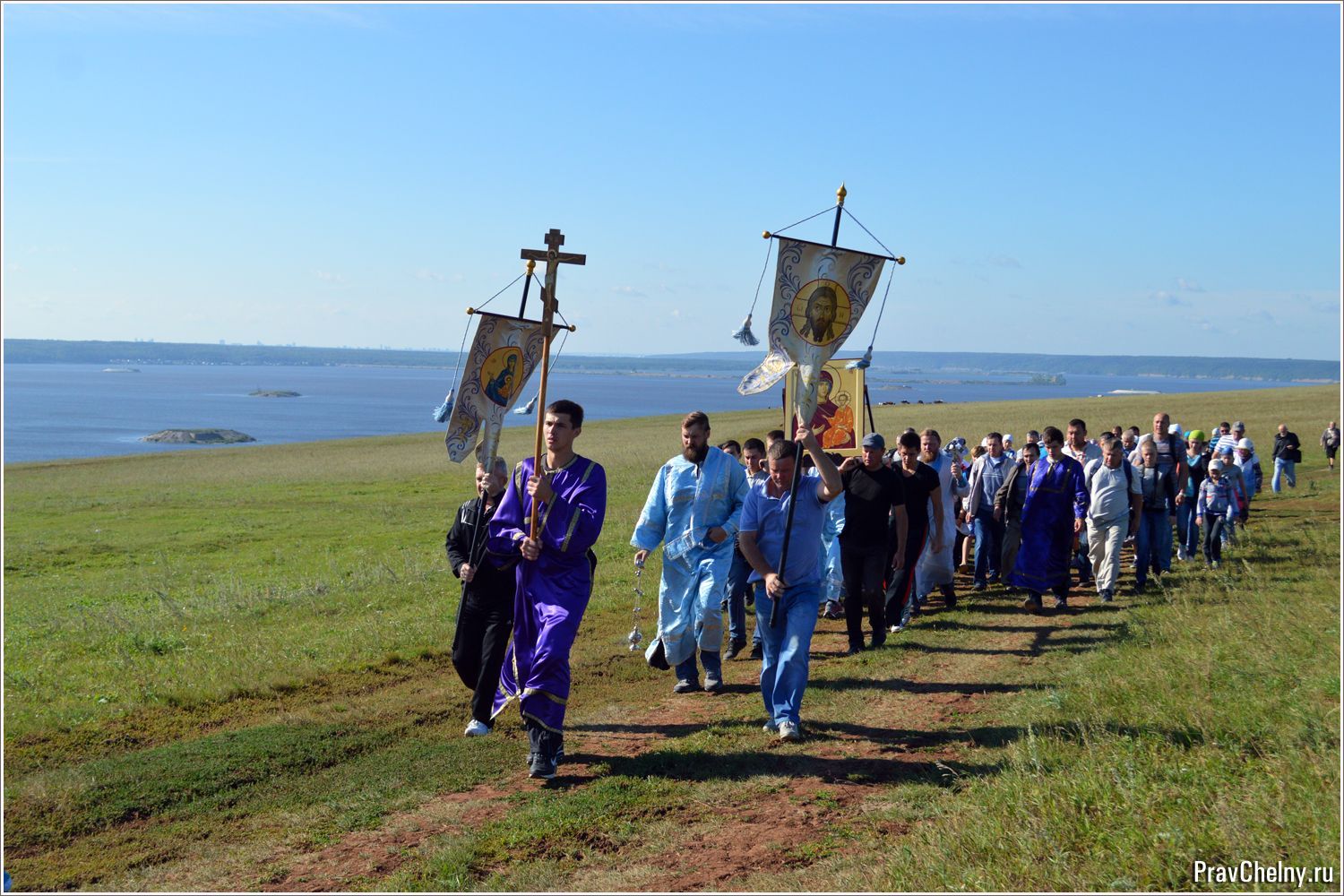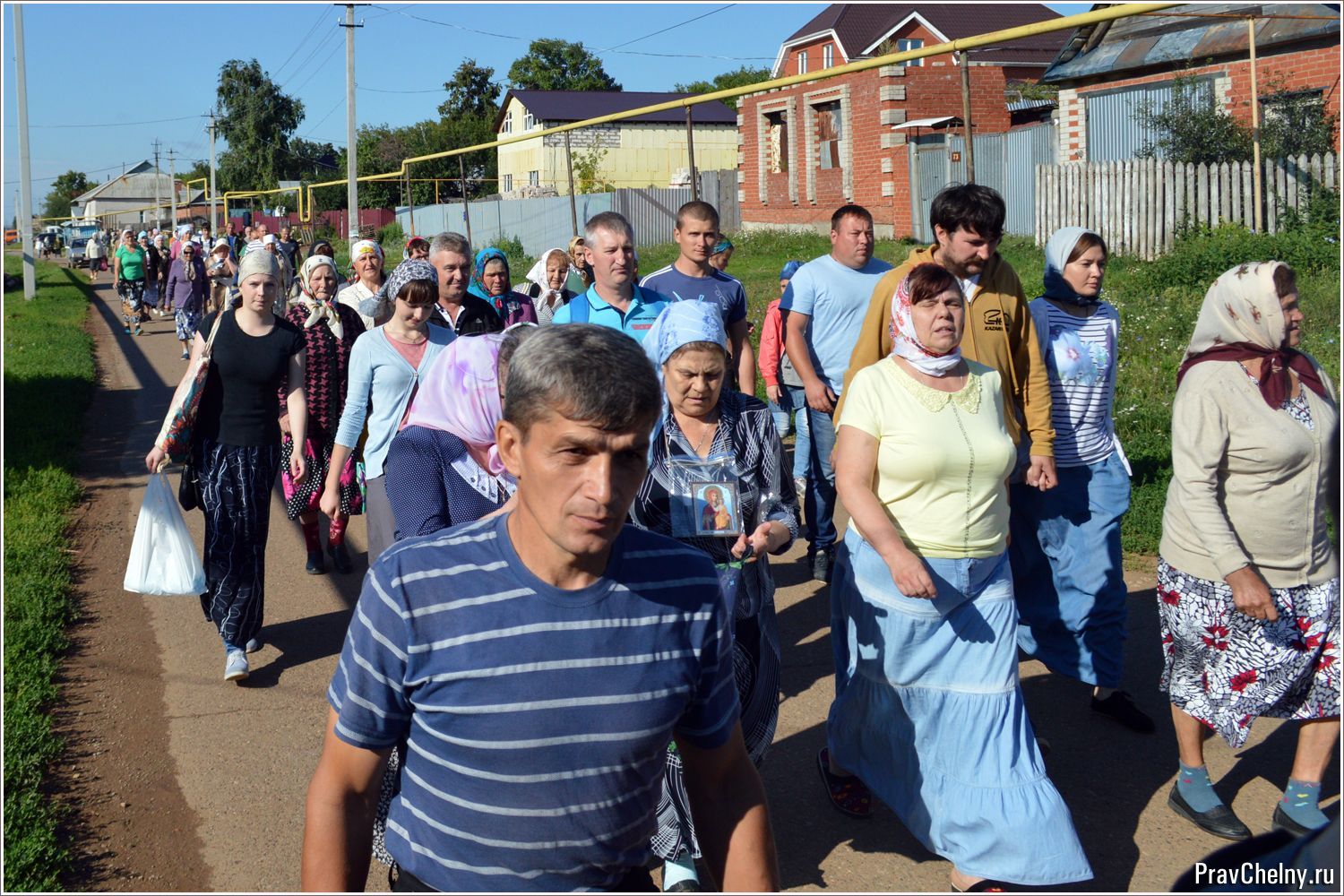 За шесть часов пути верующие с несмолкаемым молитвенным пением прошли к месту взорванного в 80-х годах прошлого века Смоленского храма села Икское Устье, где ныне строится церковь во имя мученика Уара. Возглавил шествие с празднуемой иконой Девы Марии настоятель менделеевского Богоявленского храма протоиерей Алексий Загуменнов.