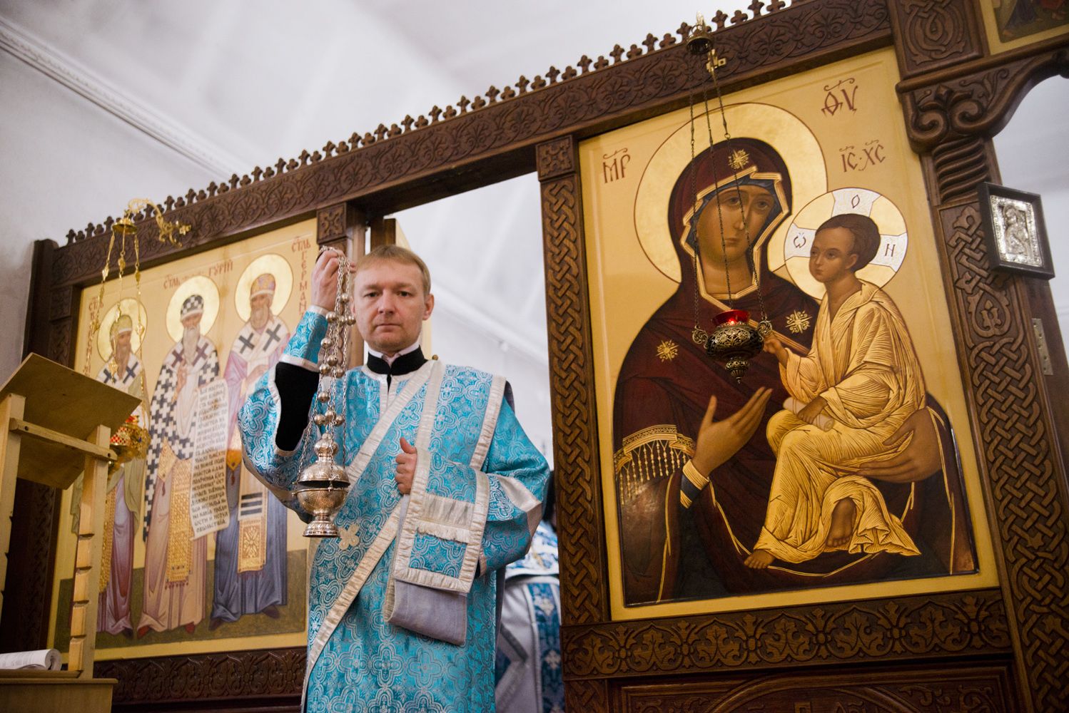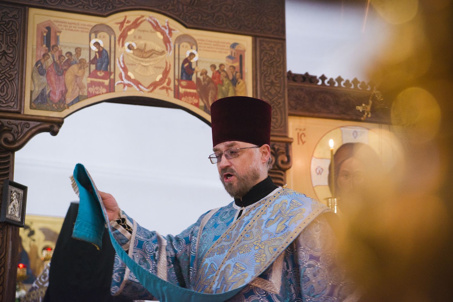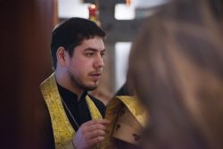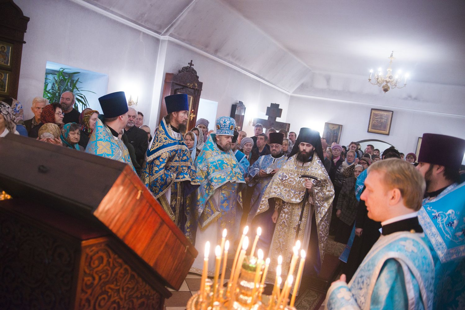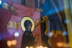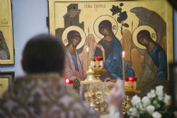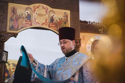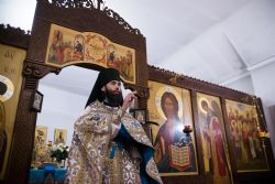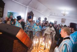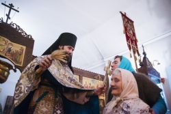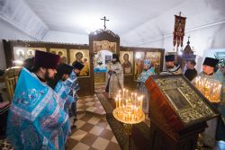После богослужения перед праздничной иконой было пропето славление Божией Матери. Игумен Пимен поздравил участников богослужения с престольным праздником и обратился со словом проповеди.