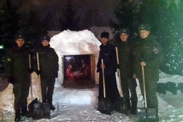 Также в преддверии праздника на территории военного училища курсанты вместе с отцом Виталием, который также является помощником начальника училища по работе с верующими, устроили Рождественский вертеп, что также уже стало доброй традицией в данном учебном заведении.