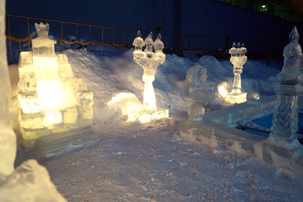 Также к радости верующих на территории храма городским скульптором Михаилом Гришаевым изготовлены ледяные фигуры — целый ледяной городок с подсветкой. Есть даже ледяной крест, из которого будет течь освященная вода для набирания верующими.