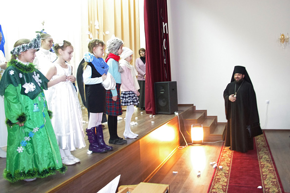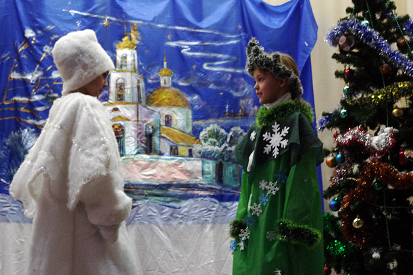 Открыл представление детский хор, исполнивший тропарь и рождественские колядки. Затем ребята сыграли небольшую сценку о пылинке и капельке. Гордая и самовлюбленная пылинка доказывала капельке, что она — самая важная на свете, а скромная капелька учила ее смирению и скромности. Солнышко высушило капельку, и пылинка стала над ней смеяться. Но когда пошел дождь, капелька вновь оказалась на земле и рассказала пылинке, что она благодаря своему смирению поднялась на небеса, и теперь будет приносить вести оттуда. И вот зимой, под Рождество капелька оказалась на земле в образе снежинки и рассказала пылинке, что она спустилась, чтобы поведать о Рождестве Спасителя, о котором узнала на небесах.