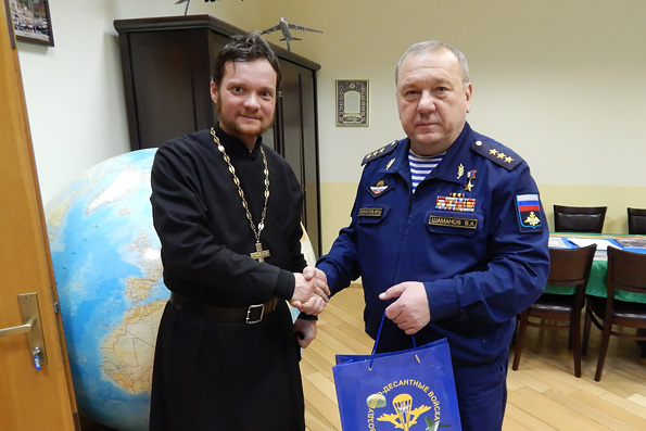 Протоиерей Михаил Васильев представил иерея Виталия Беляева как прошедшего Курс молодого бойца для военных священников в Рязанском высшем командном воздушно-десантном училище, за что генерал-полковник В.А. Шаманов поблагодарил отца Виталия за успешное прохождение курса.