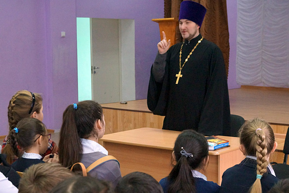 Отец Виталий разговаривал с ребятами на очень серьезные темы: о любви и уважении к родителям, о смысле жизни человека на земле. Ребята приняли активное участие в разговоре со священником, задавали много вопросов: «Как зовут Бога?», «Кто такие бесы, как они появились?», «В чем отличие православного креста от католического?», «Как появился в раю змий?». Звучали и другие, порой неожиданные, вопросы. Священнослужитель очень подробно разъяснял детям ответы на все вопросы, которые их интересовали. А также благочинный подарил школьной библиотеке православную литературу.