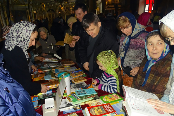 6 марта в Никольском кафедральном соборе города Казани прошла акция «Подари книгу». По окончании Божественной литургии в храме состоялась книжная ярмарка духовной литературы, собранной силами прихода и воскресной школы. Целью акции было подарить кому-то уже прочитанную книгу и взять для себя любую другую. Такие мероприятия способствуют более тесному и открытому общению прихожан между собой. Подобного рода акция в Никольском соборе проходила впервые, и желающих поучаствовать в ней и поделиться духовной литературой оказалось довольно много. Кроме книг многие принесли и диски с духовной музыкой. Ведь порой не у всех есть возможность приобрести литературу в местах продажи, а здесь нашлось то, что оказалось по душе. Настроение у всех было приподнятым, всем удалось ощутить радость дарения, когда отдаешь просто так, от чистого сердца.