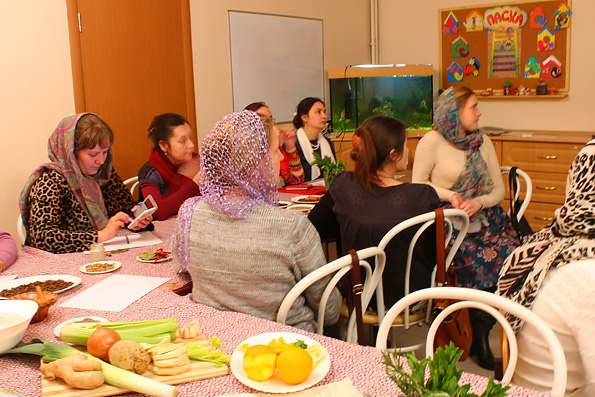 На открытом занятии гости познакомились с миром специй и пряностей. Разбирались в классификации и свойствах классических и местных пряностей. Смотрели слайды, вдыхали тончайшие ароматы и отведывали разнообразные перцы, пряные травы и овощи, корицу, бадьян и мускатный орех. На несколько часов трапезная храма превратилась в роскошный восточный базар. В воздухе витали разнообразные пряные ароматы.