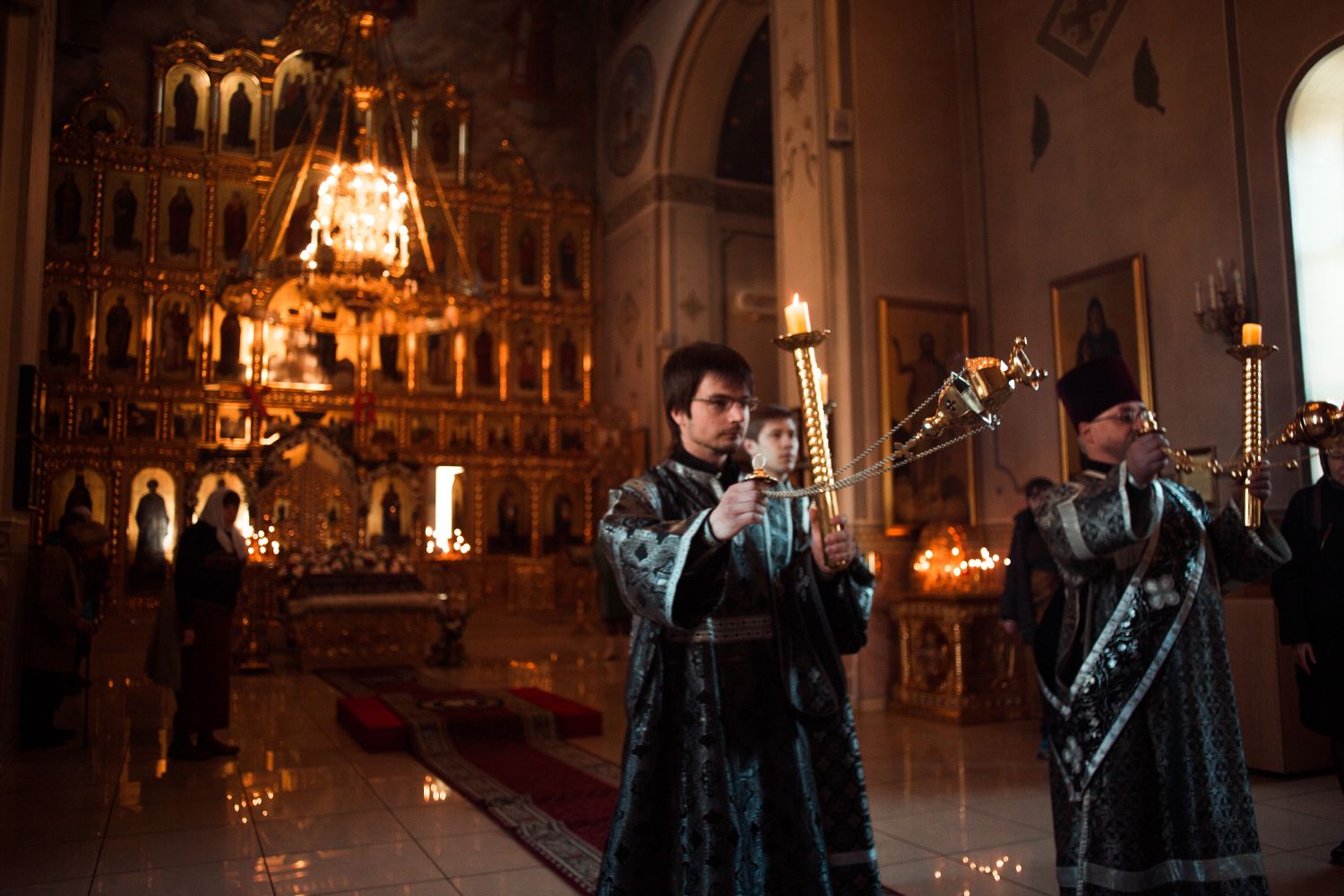 На вечерне были прочитаны 15 паремий, повествующих о важнейших ветхозаветных прообразах и пророчествах о спасении людей Страданиями и Воскресением Иисуса Христа.