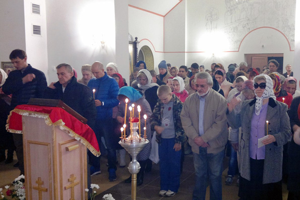 После пятнадцати лет строительства в этом году окончательно был передан верующим воинский храм великомученика Георгия Победоносца. Последние две недели прихожане и работники храма готовили храм к пасхальной службе. Новая церковь позволит приходской общине служить в гораздо более комфортных условиях, поэтому пасхальную службу ждали с таким нетерпением.