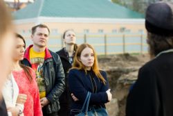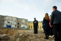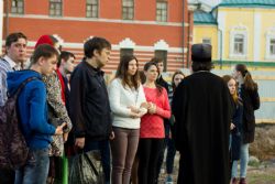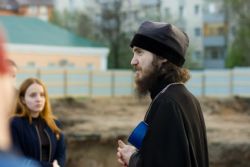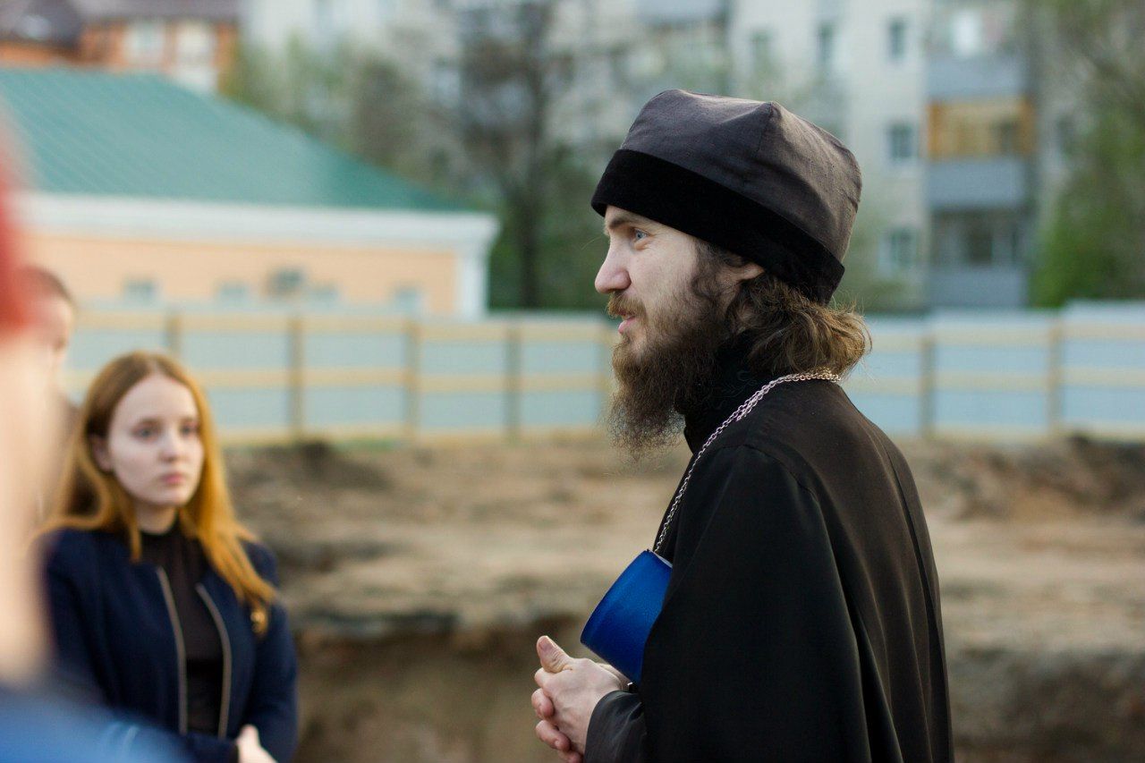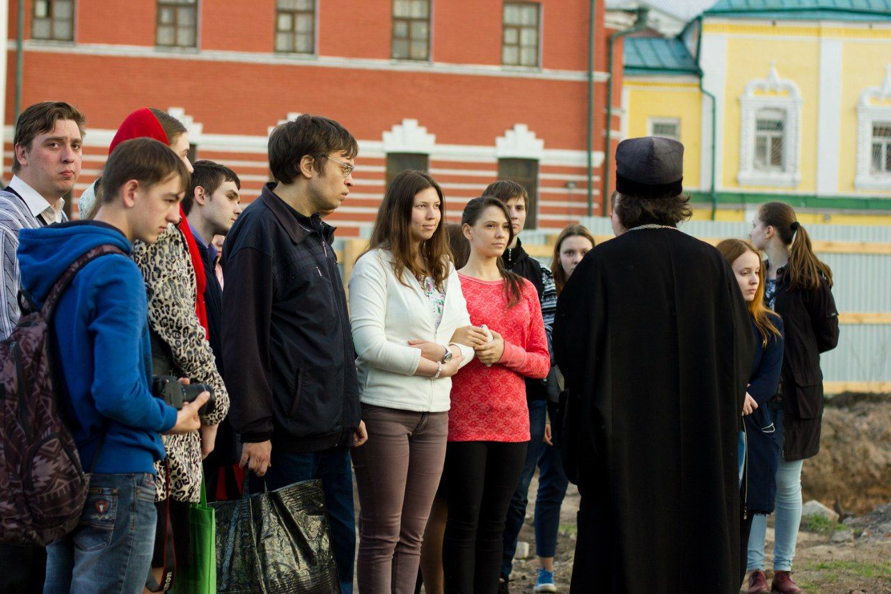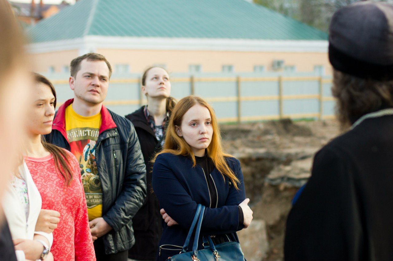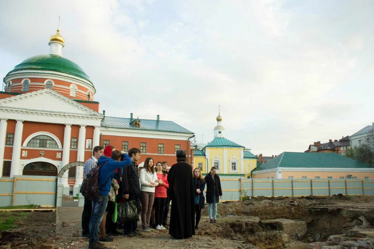 Затем насельник монастыря напомнил о тяжелых событиях — в 1904 году украли чудотворную икону, а спустя несколько десятилетий, с приходом советской власти, был взорван Казанский собор. Новый виток его истории мы видим уже сейчас — принято решение о воссоздании собора — 21 июля, в день Казанской иконы Божией Матери, состоится его закладка Патриархом Кириллом, а сейчас на месте обретения иконы трудятся рабочие. Уникальная возможность увидеть сохранившийся фундамент Казанского собора была и у православной молодежи Казани.