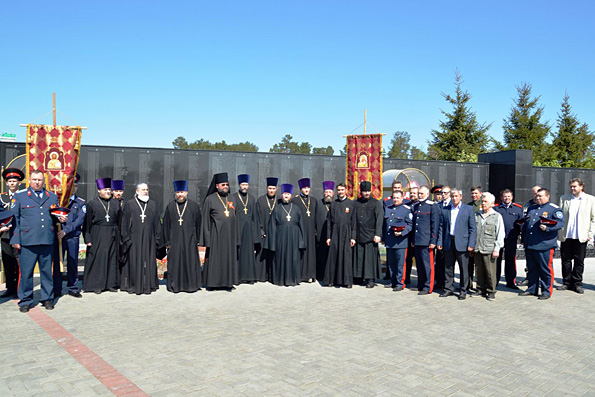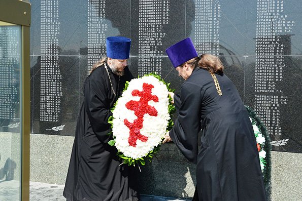 Честь возложить венок к памятнику выпала настоятелю воинского храма Георгия Победоносца протоиерею Валерию Каранаеву и клирику Свято-Вознесенского архиерейского подворья иерею Валерию Матвееву. Вместе со священниками в церемонии возложения участвовали представители казачества, которые, участвуя в общей процессии, несли церковные хоругви.