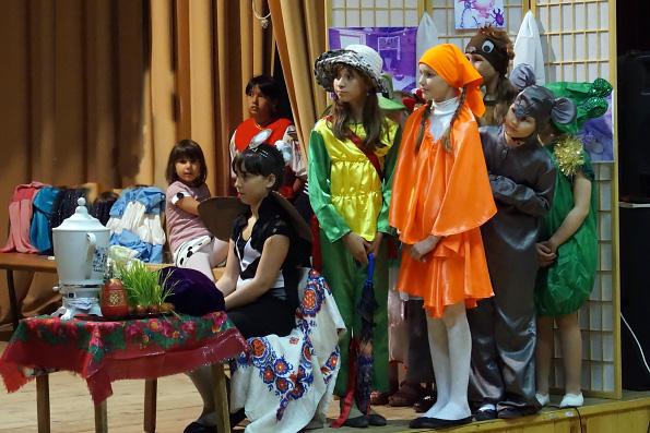 Затем дети показали музыкальный спектакль-сказку о Мухе-Цокотухе, у которой именины пришлись на праздник Воскресения Христова. По сценарию сказки, зло побеждено добром, звери и страшный паук подружились с Мухой, принесли ей подарки и все вместе исполнили песню «День Воскресения».