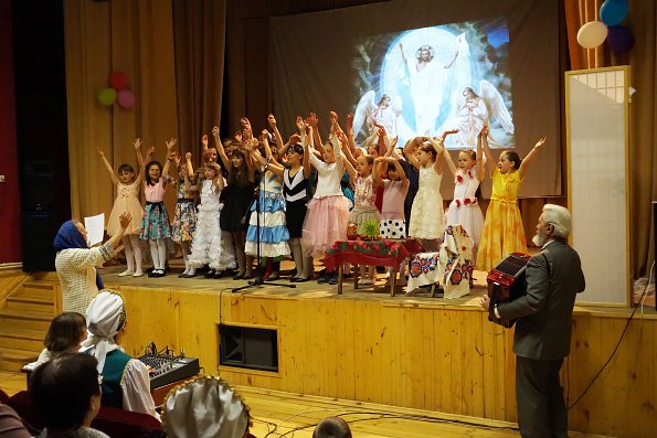 Гости и прихожане церкви горячо поблагодарили детей и участников за праздничный концерт. В фойе Дома культуры всех ждал сюрприз! Детям были розданы воздушные шары красного и синего цветов. На лужайке перед клубом шары были отпущены в голубое небо под пение тропаря «Христос воскресе из мертвых».