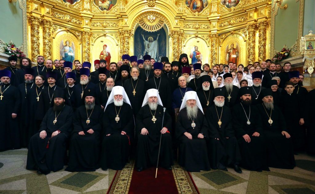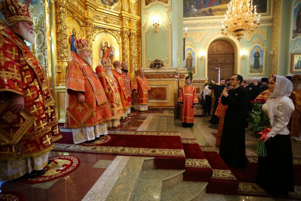 Архиереи Русской Православной Церкви, совершавшие богослужение, поздравили владыку — ректора, преподавателей и студентов с юбилеем духовной школы.