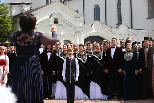 В Казанском кремле у стен Благовещенского собора прозвучала песня «Родина слышит, Родина знает» на музыку Д. Шостаковича и слова Е. Долматовского в исполнении хора «Поющий Татарстан» под управлением заслуженного деятеля искусств Республики Татарстан Миляуши Таминдаровой. Сольную партию исполнил учащийся средней специальной музыкальной школы-лицея при Казанской государственной консерватории им. Н. Жиганова и воспитанник воскресной школы при Никольском кафедральном соборе Илья Беккер. Также хоровой коллектив спел финальную песню «Вместе весело шагать» на музыку В. Шаинского и слова М. Матусовского под руководством Светланы Семеновой.