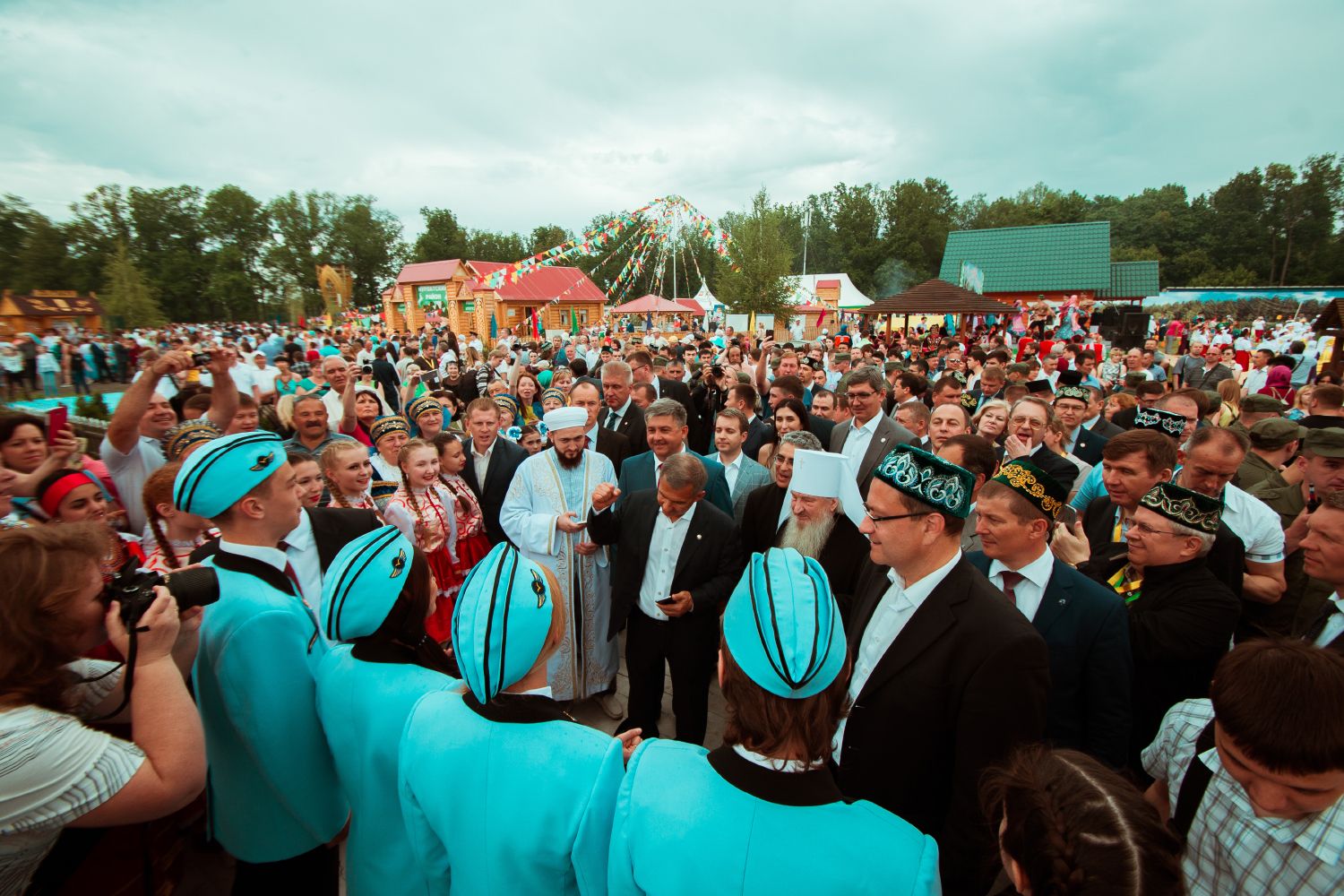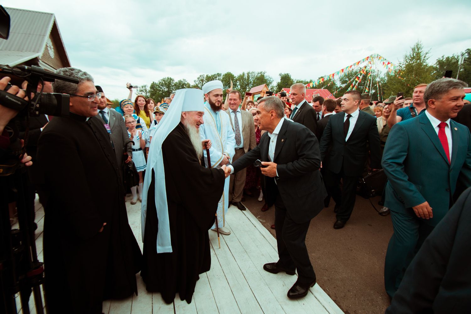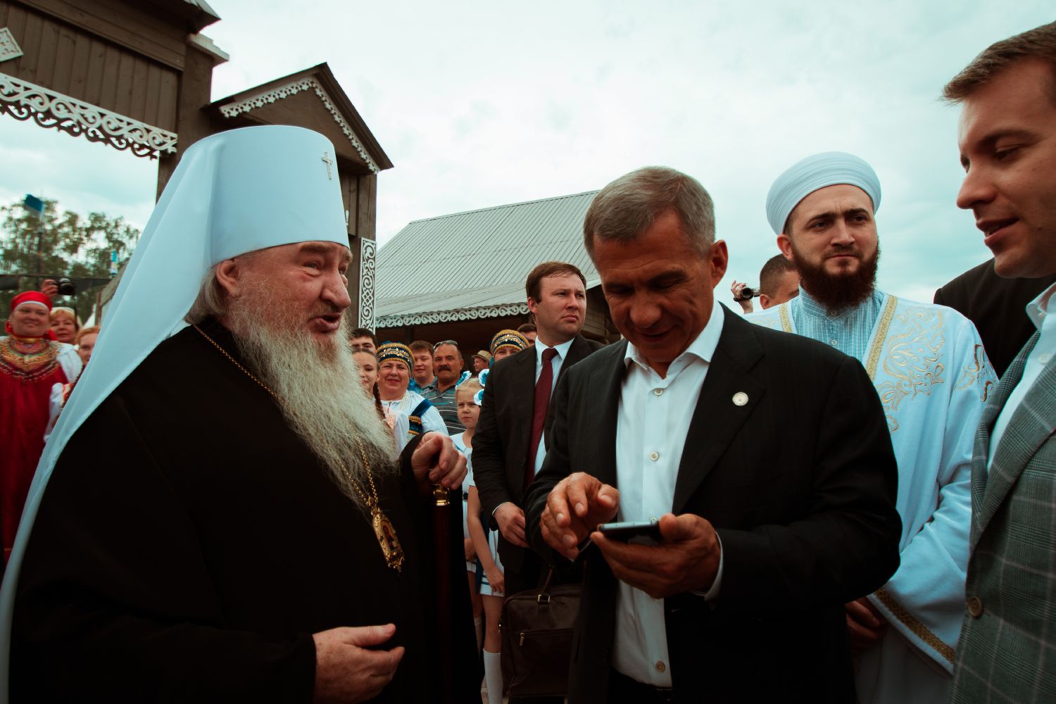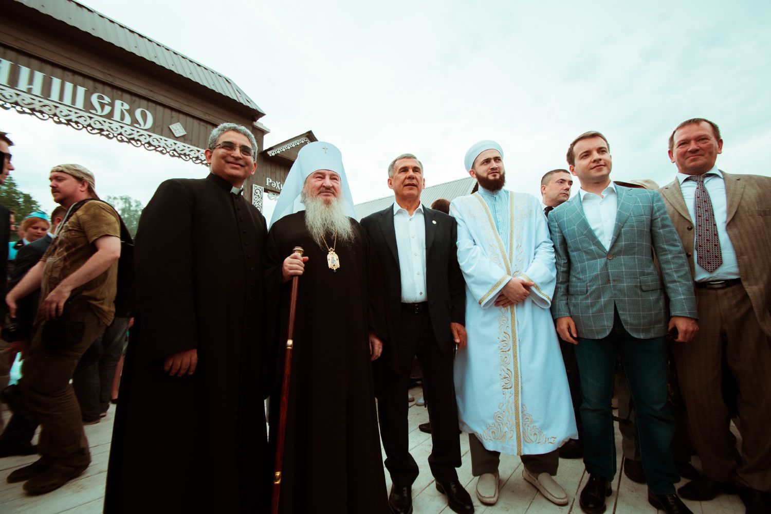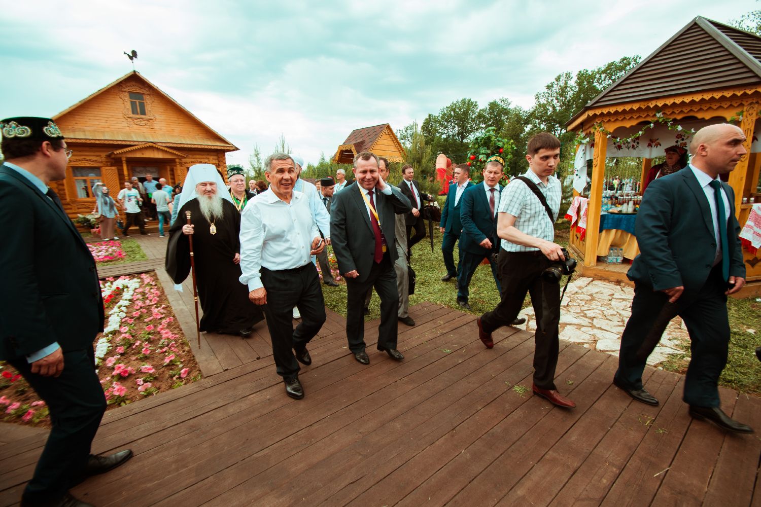 Встреча духовенства и главы Республики состоялась на территории национальной деревни Лаишевского района городка Сабантуя. После приветствия была сделана памятная общая фотография.