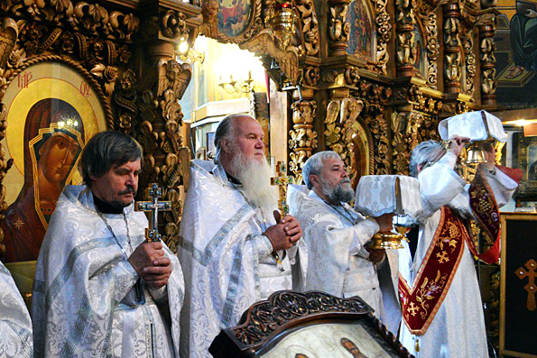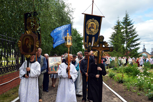 После Литургии утреннее летнее солнце осветило традиционный крестный ход вокруг храма, которым под звуки песнопений праздника и перезвон колоколов прихожане и священнослужители по обычаю завершили престольные торжества родного собора.