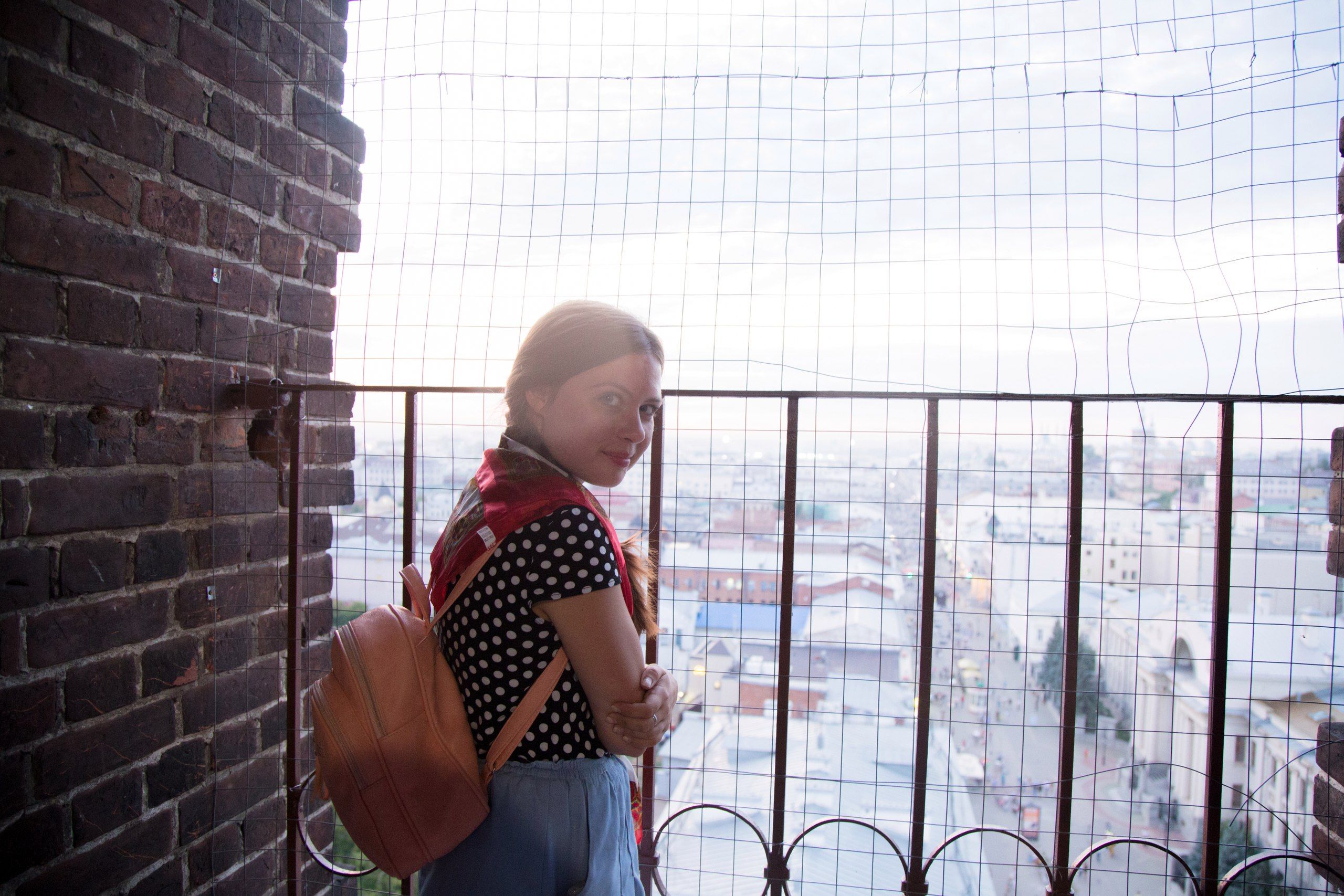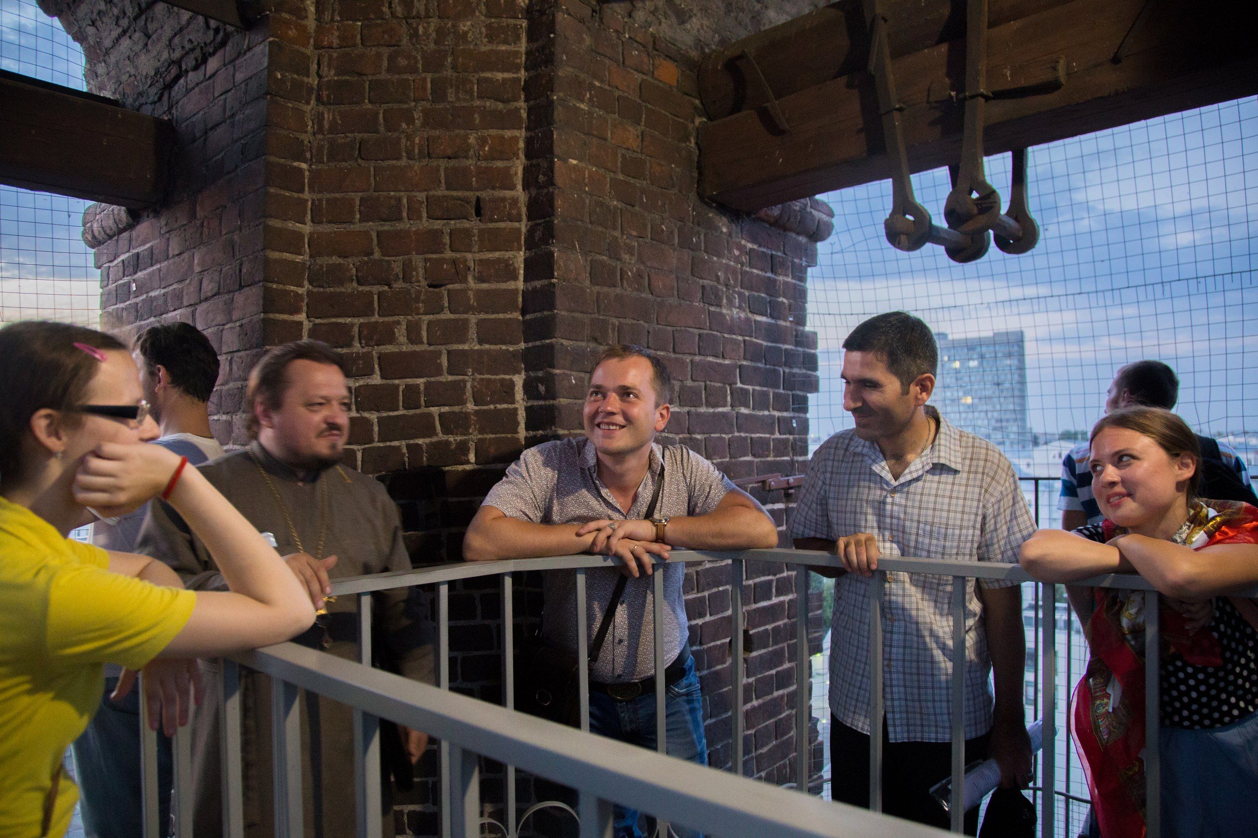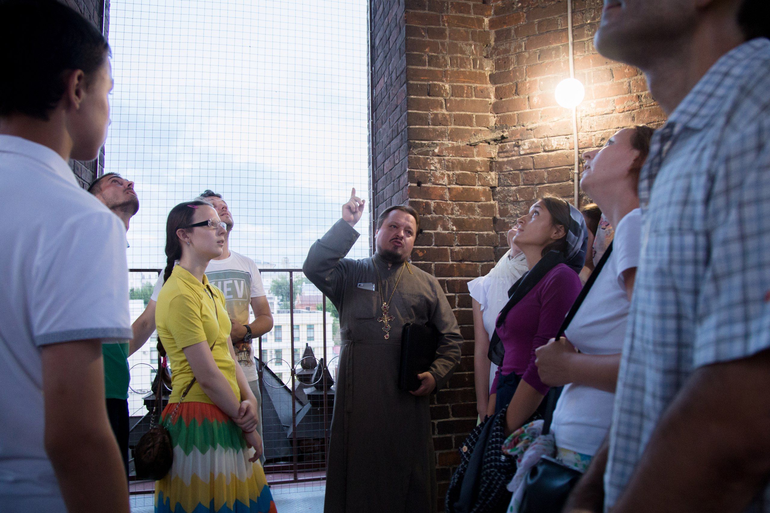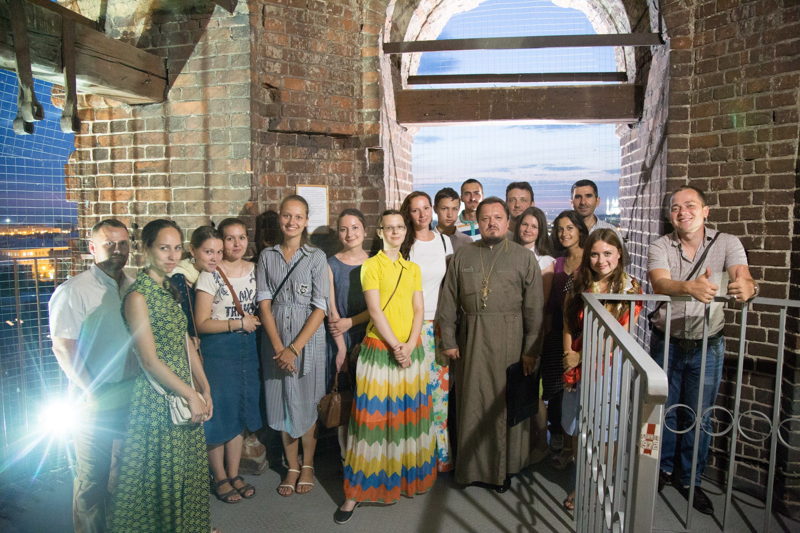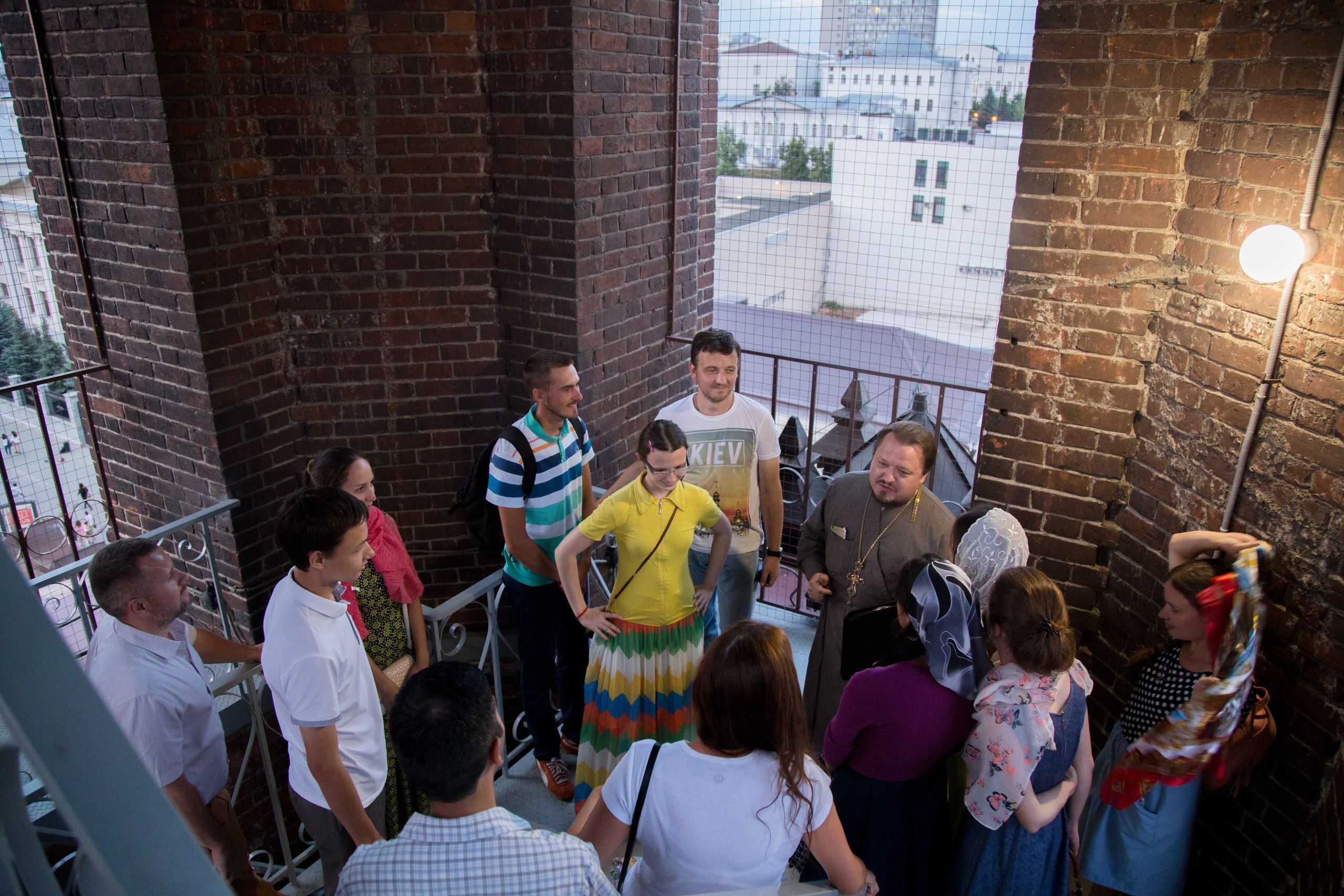 При подъеме на колокольню каждому невольно вспоминалась гора Фавор — та самая, где и было Преображение Господа и Спаса нашего Иисуса Христа. И уже на самой смотровой площадке, когда шум центральной улицы, суета, звуки мегаполиса остались внизу, возникали новые мысли — о преображении в каждом человеке, о предназначении, о красоте и многогранности созданного Творцом мира. На высоте 74 метра каждый старался ухватить глазом как можно «дальше», рассмотреть любимые здания и даже приглядеться к далекому Свияжску. Фото на память и отеческие наставления молодым от отца Алексия — также на память.