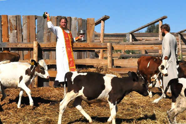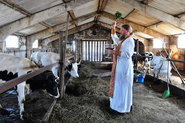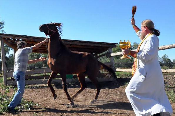 — История коня неотделима от духовной культуры человечества. Во все века, во все эпохи воспевали лошадей — их стать, внешность, силу, быстроту, изящество, ум, нрав. Конь — воплощение стремительных, необузданных сил природы, находящихся во власти человека. Конь — как бы сама стихия, несущая на себе человека и придающая ему царское величие. Образ всадника выявляет царственное достоинство человека, призванного владычествовать над миром, созданным Творцом. Нужно возвратиться к земле, поруганной, истерзанной, отравленной, и снова полюбить её. Надо обрабатывать землю не только с помощью техники, уродующей и убивающей её, но и с помощью древнего и верного друга крестьянина — коня, — рассказывает священник.