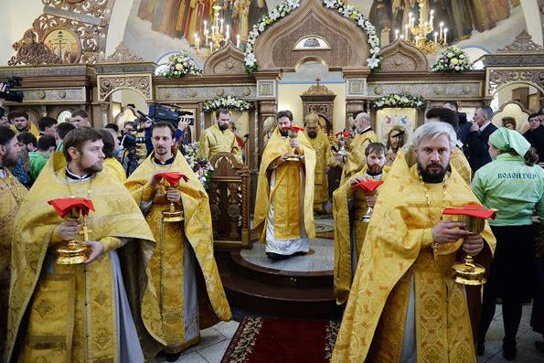 Богослужение сопровождалось переводом на русский жестовый язык, который осуществляли несколько групп переводчиков, находившихся в разных местах храма для того, чтобы все могли их видеть. Служба транслировалась на большом экране на улице, таким образом, даже те, кто не уместился в храме, могли разделить радость участия в Литургии.