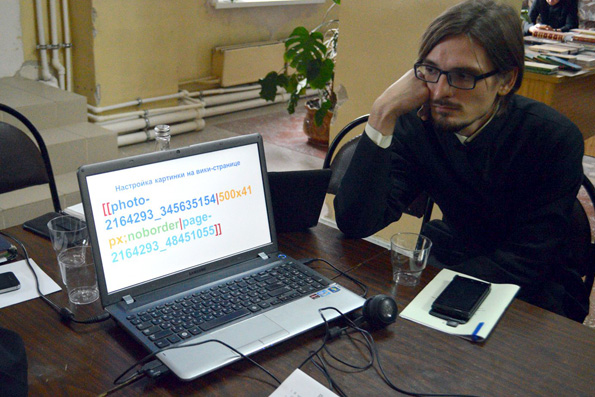 В ходе заседания отец Владимир провел видео-презентацию wiki-разметки — внутреннего ресурса социальной сети «ВКонтакте», обладающего практически безграничными возможностями в плане оформления и навигации, соответственно и наполнения. Этот проект можно даже назвать прорывом своего рода, поскольку wiki-разметка технически удобна для пользования как мини-сайт. Презентация вызвала объективно высокий интерес, и отец Владимир отметил, что готов поделиться с желающими опытом использования данного кода.