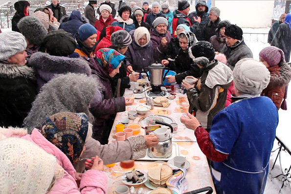 На выходе из храма прихожан ждал еще один сюрприз — горячий чай из самовара с блинами и медом под пение детского народного ансамбля «Калинка» из села Николаевки Мензелинского района и выступление казаков.