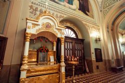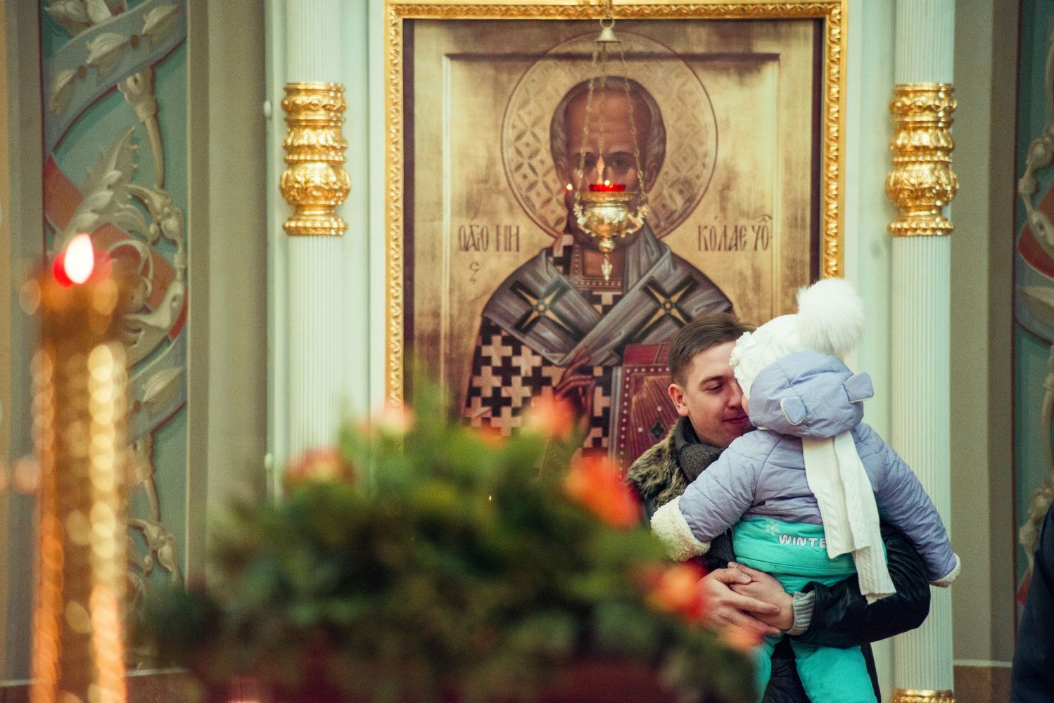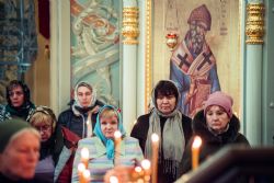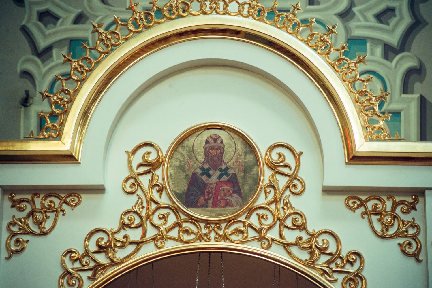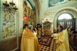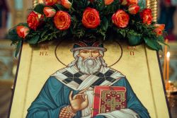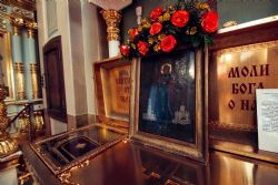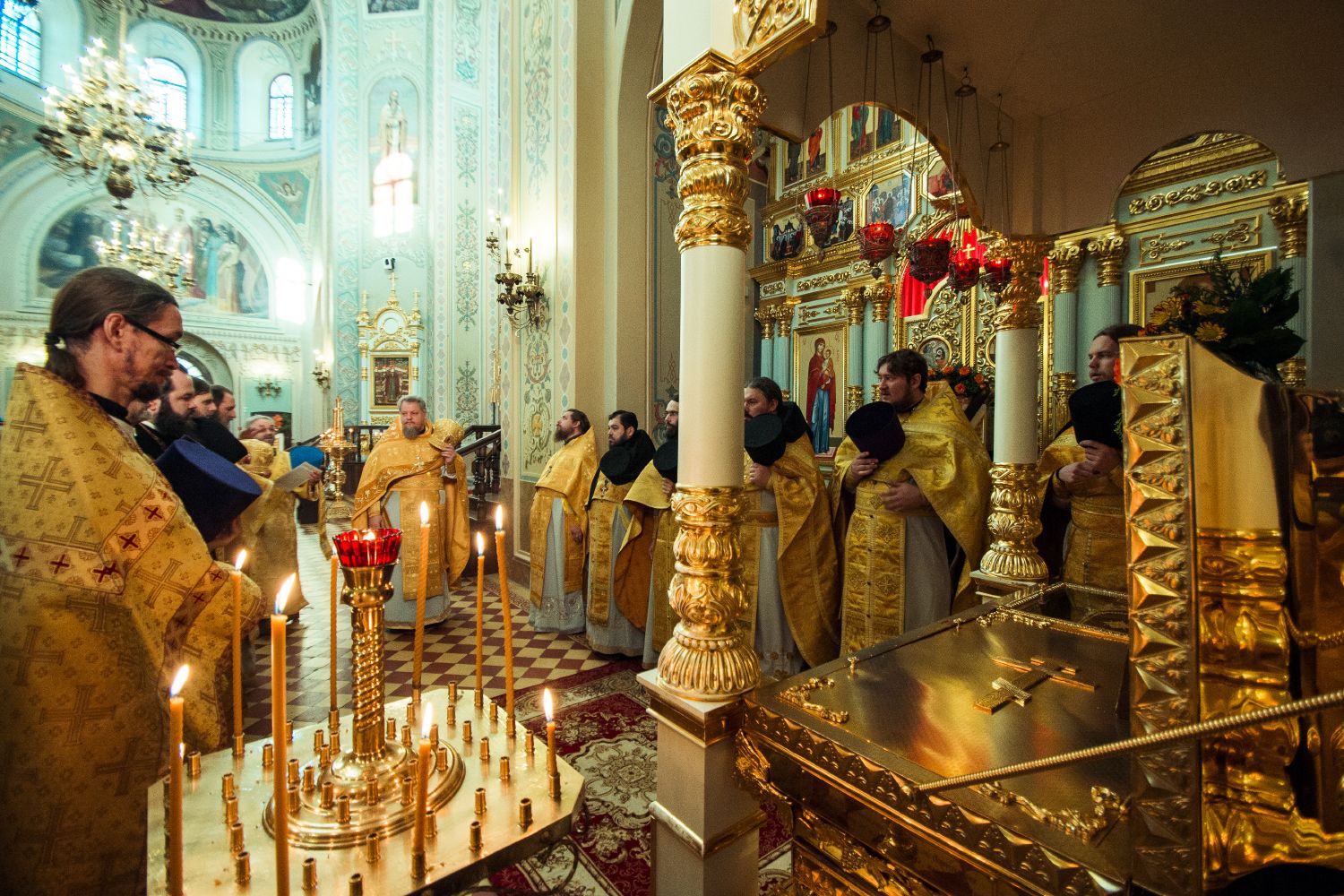 По заамвонной молитве духовенство пропело славление перед ракой со святыми мощами святителя.