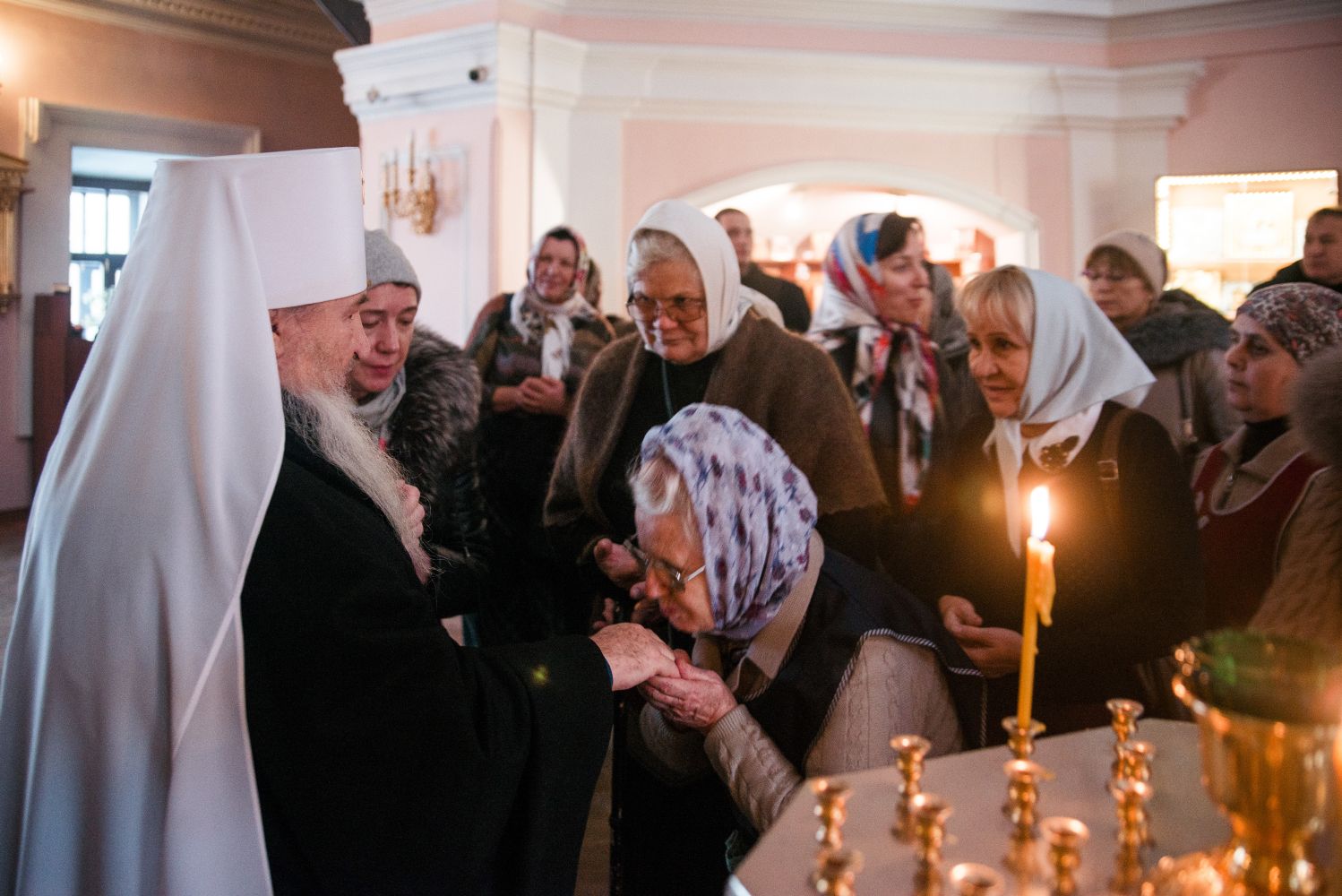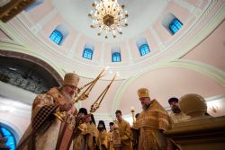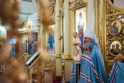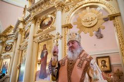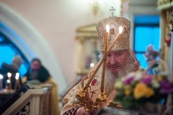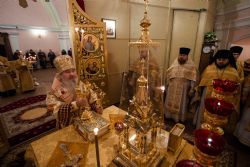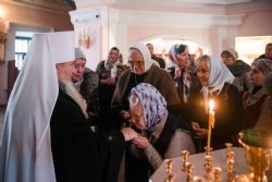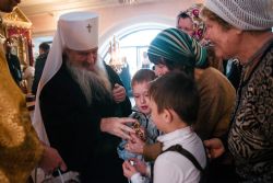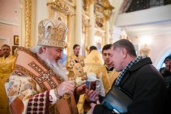 Во время прикладывания ко кресту верующие поздравили владыку Феофана с днем хиротонии, вручив Его Высокопреосвященству цветы и подарки.