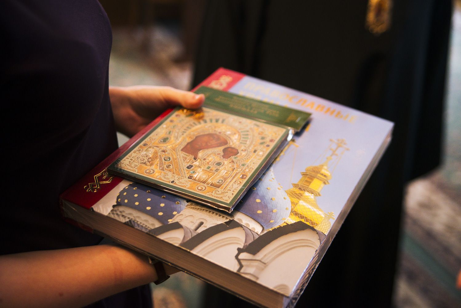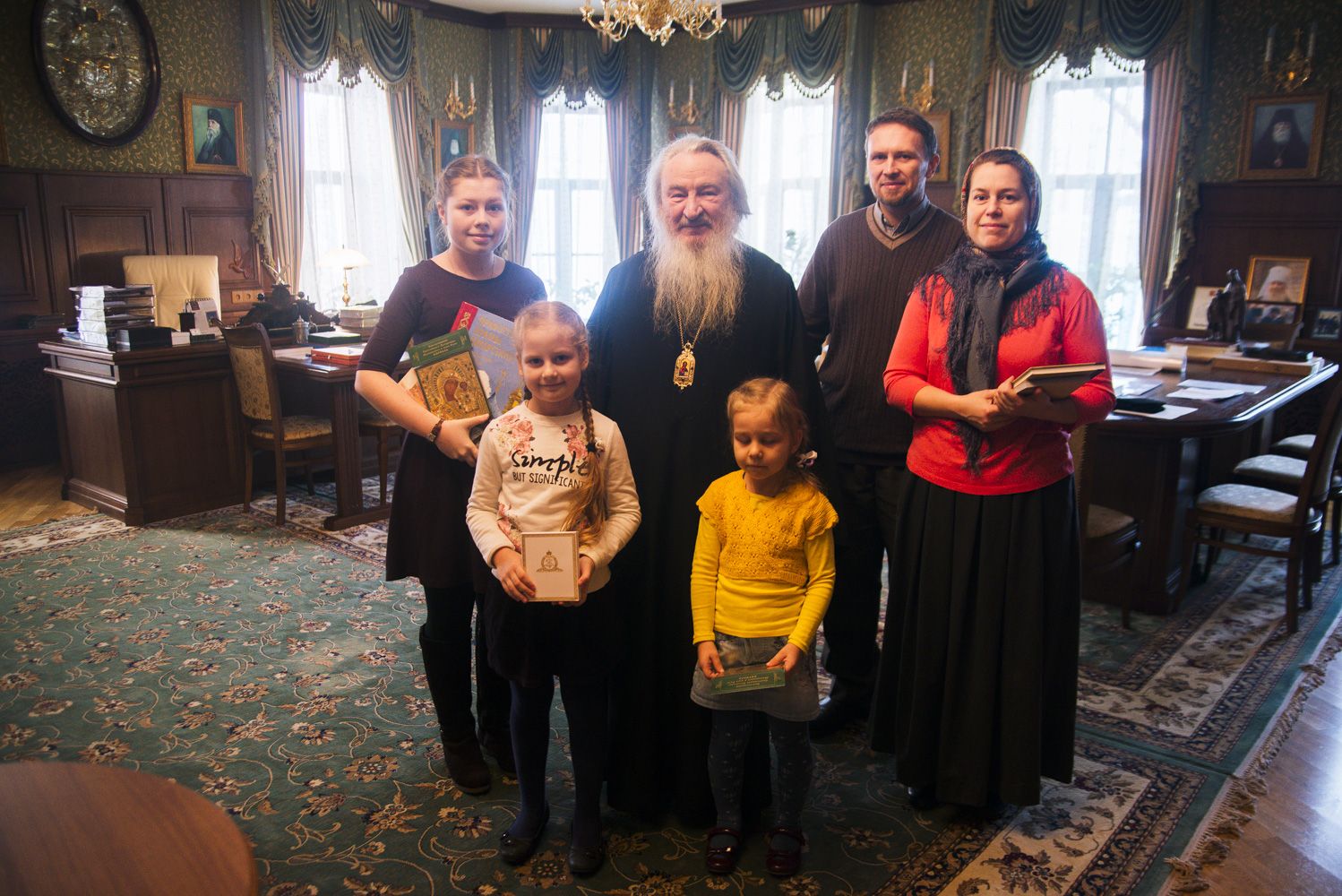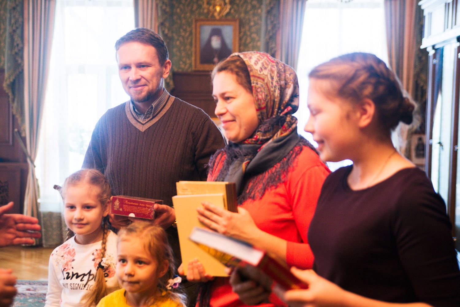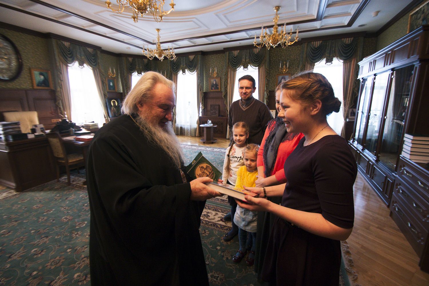 В подарок семье Трушиных, воспитывающей трех дочерей, глава Татарстанской митрополии передал книги «Православные храмы Татарстана», поэтический сборник казанской поэтессы Татьяны Сушенцовой «Я буду говорить тебе о главном», Казанские иконы Божией Матери и памятные сувениры.