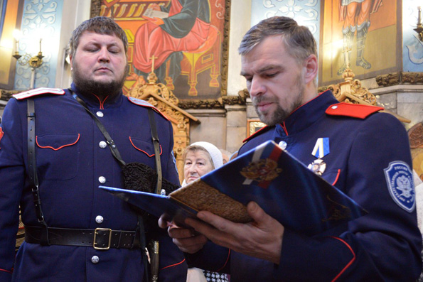 До начала Литургии священники вместе с прихожанами прочитали акафист святителю, а после богослужения во время молебна в храме состоялось очередное верстание казаков. На этот раз присягу принесли староста собора Алексей Бражкин и клирик прихода протодиакон Димитрий Половников.